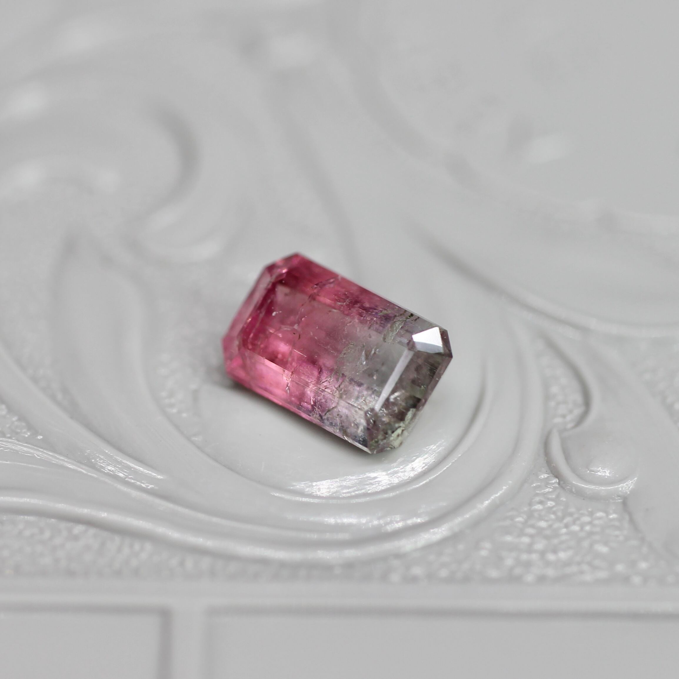 グレイッシュなピンク&水色の可愛らしいエメラルドカットのバイカラートルマリンです。 光に当たると反射して見えるシャリシャリインクルージョンもポイントです。