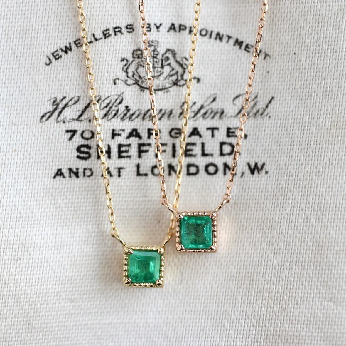 エッジがシャープでスタイリッシュな印象のスクエアカットのエメラルドです。 角度により、グリーンの輝きの明暗が美しく煌めきます。