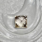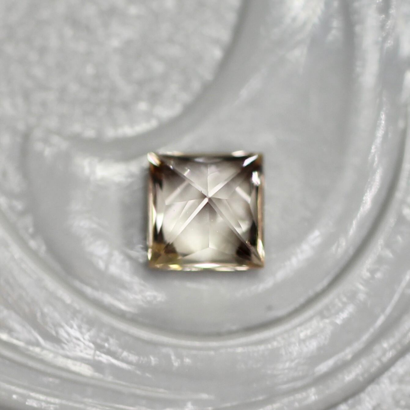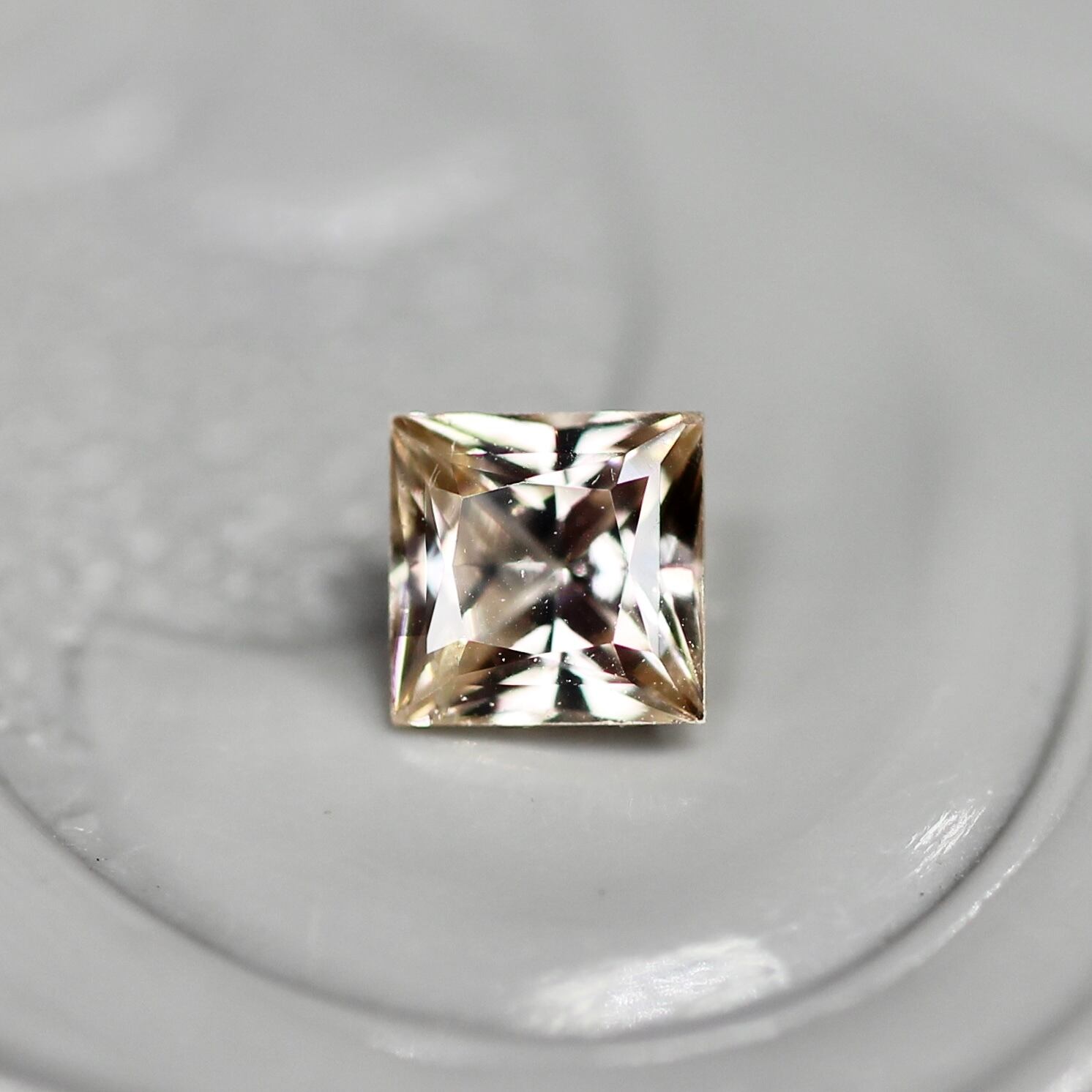 クリアなオレンジベージュカラーのサファイアです。スクエアフォルムのプリンセスカットが肌馴染みが良く、淡いオレンジカラーと相まって上品で可愛らしい印象です。