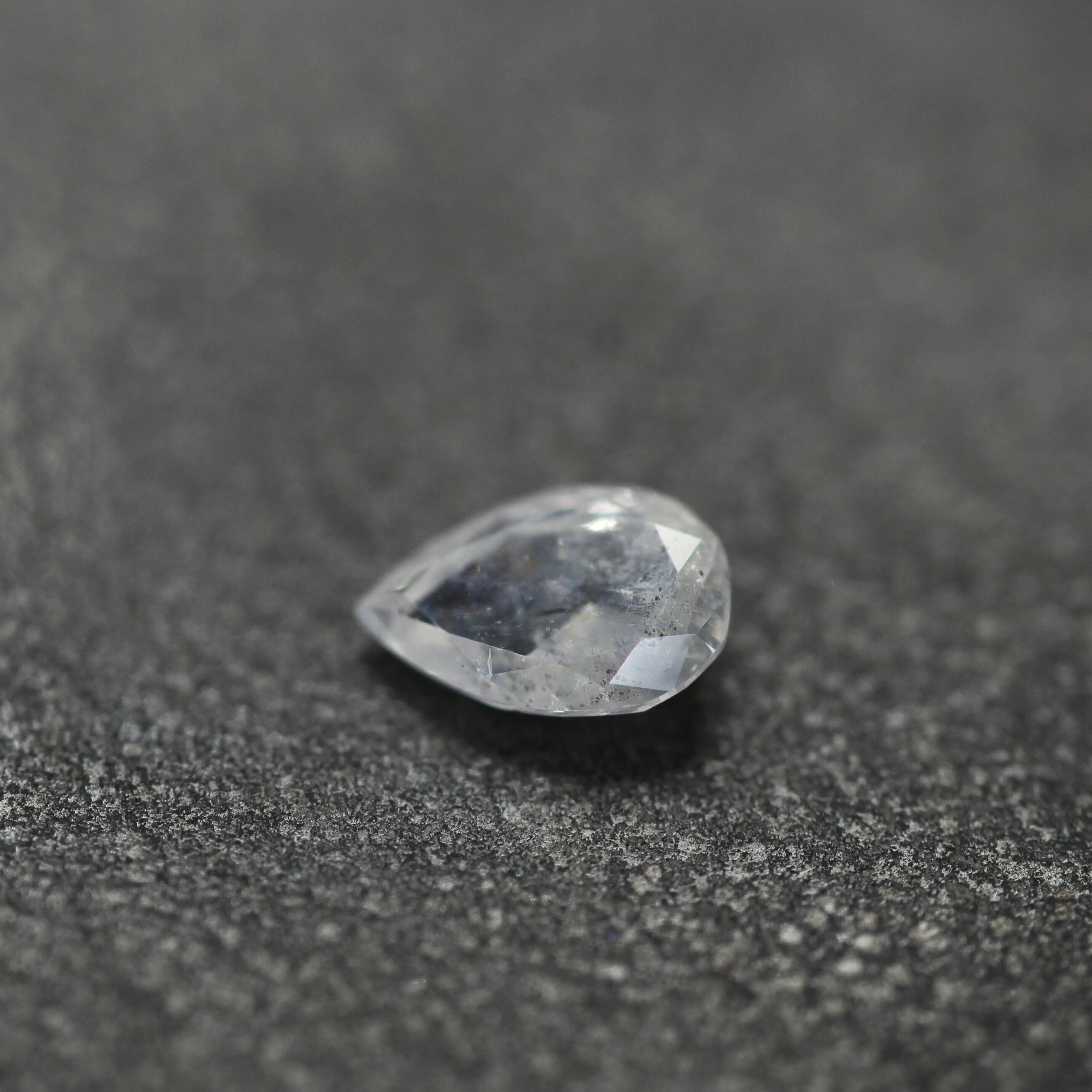 透明感ある部分とふんわりとベールを纏ったように白く色づいた部分の両方を兼ね備えた、コントラストを楽しめるペアシェイプカットのホワイト系ダイヤモンドです。