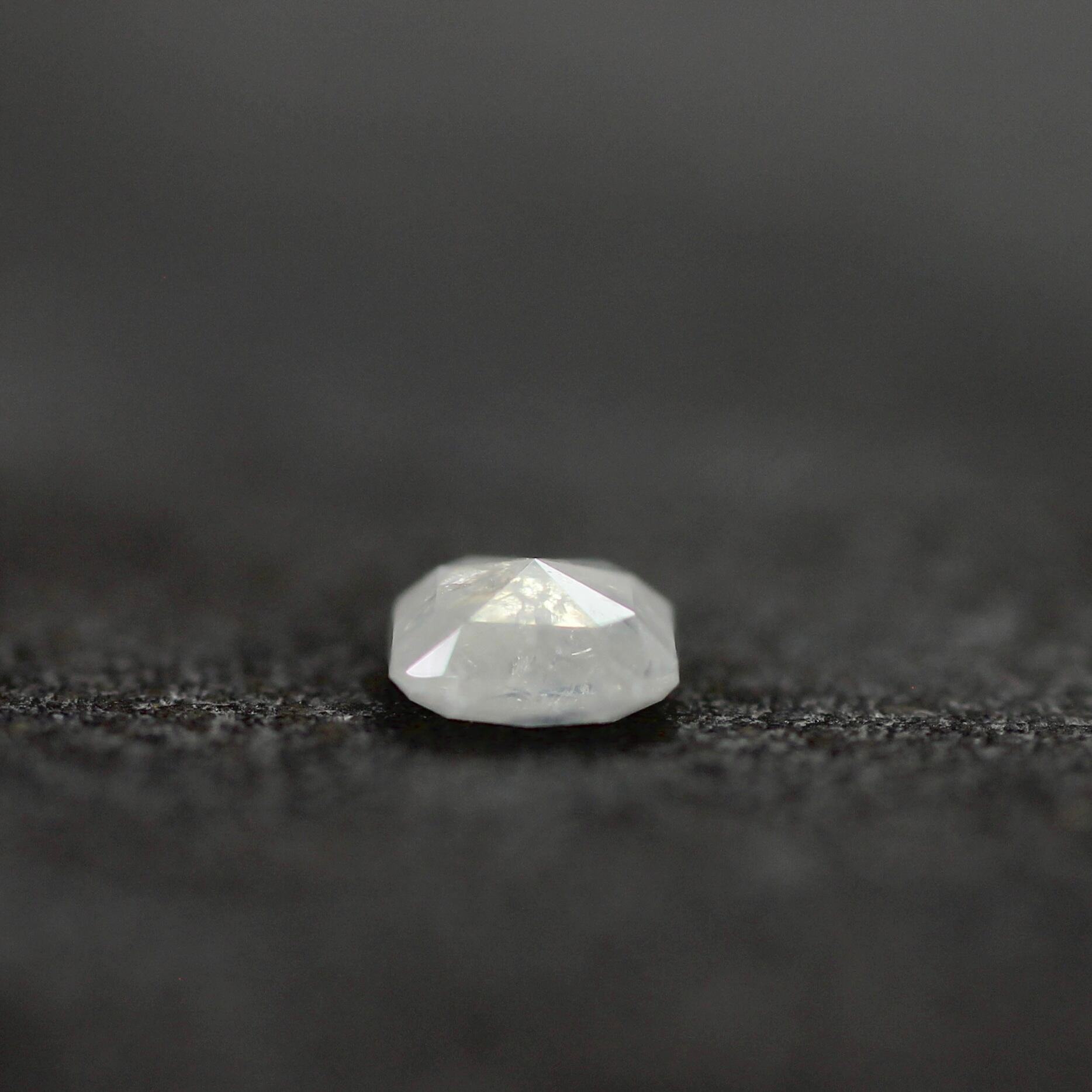 丸みのあるクッションカットが可愛らしいホワイト系ダイヤモンドです。中央がややクリアで、外周がふんわりと白く色づいているのが幻想的で美しいです。