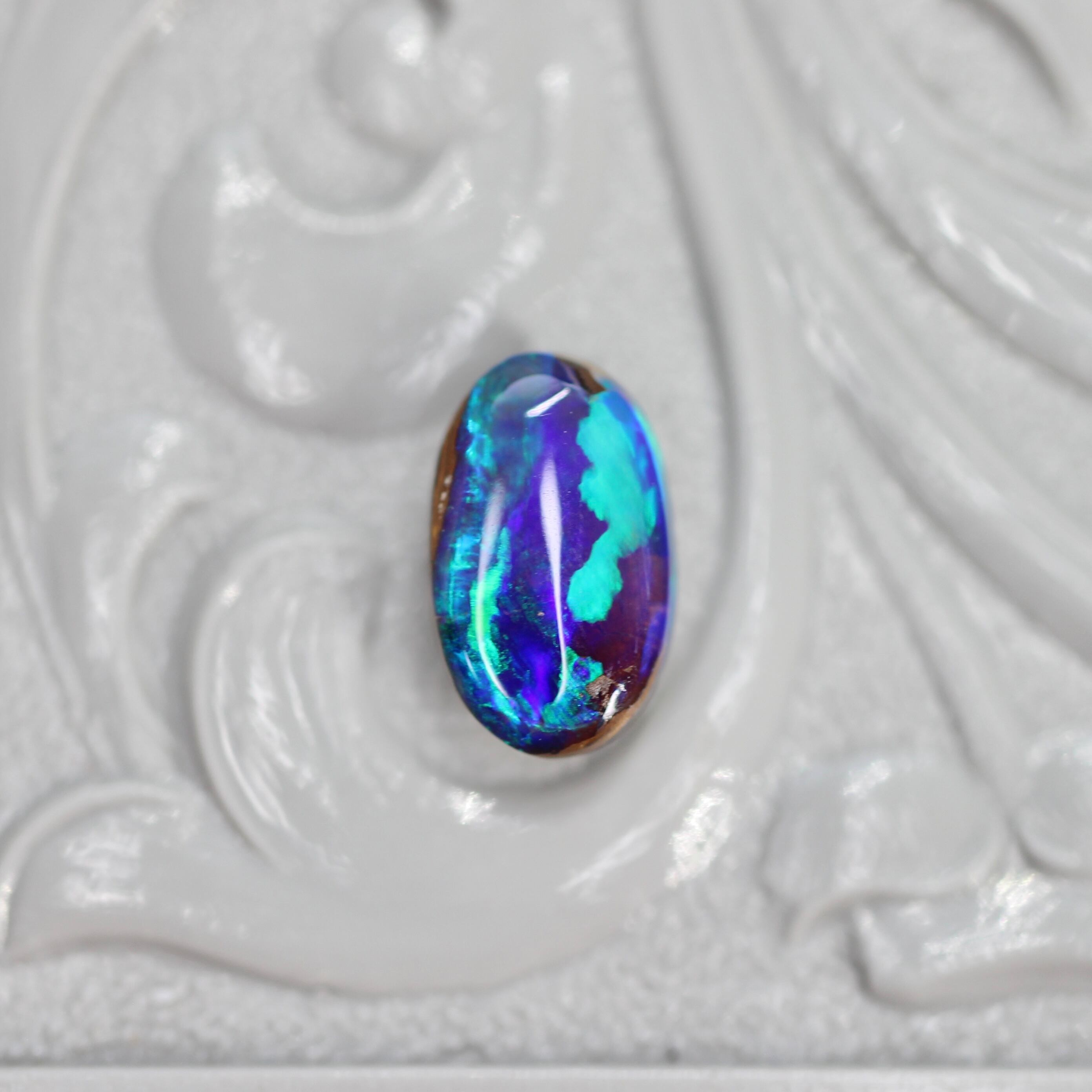 深く色づいた藍色の地色から発光しているように煌めくネオンブルーとグリーンの遊色が神秘的なピースです。