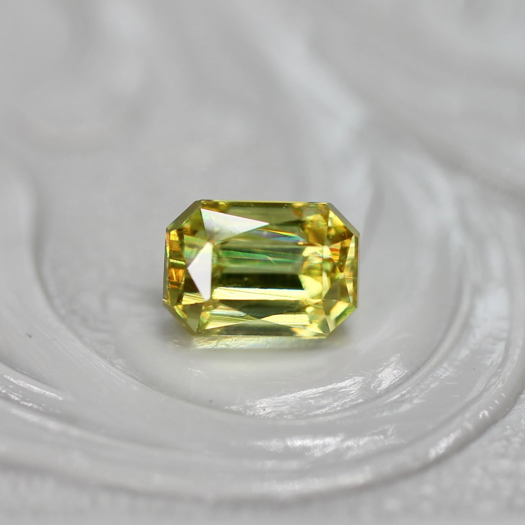 鮮やかな光の輝きが美しい、レクタングルのラディアントミックスカットのスフェーンです。オリーブグリーンの透明感あるボディが、光を浴びると虹色のファイアを放ち、美しく煌めいています。
