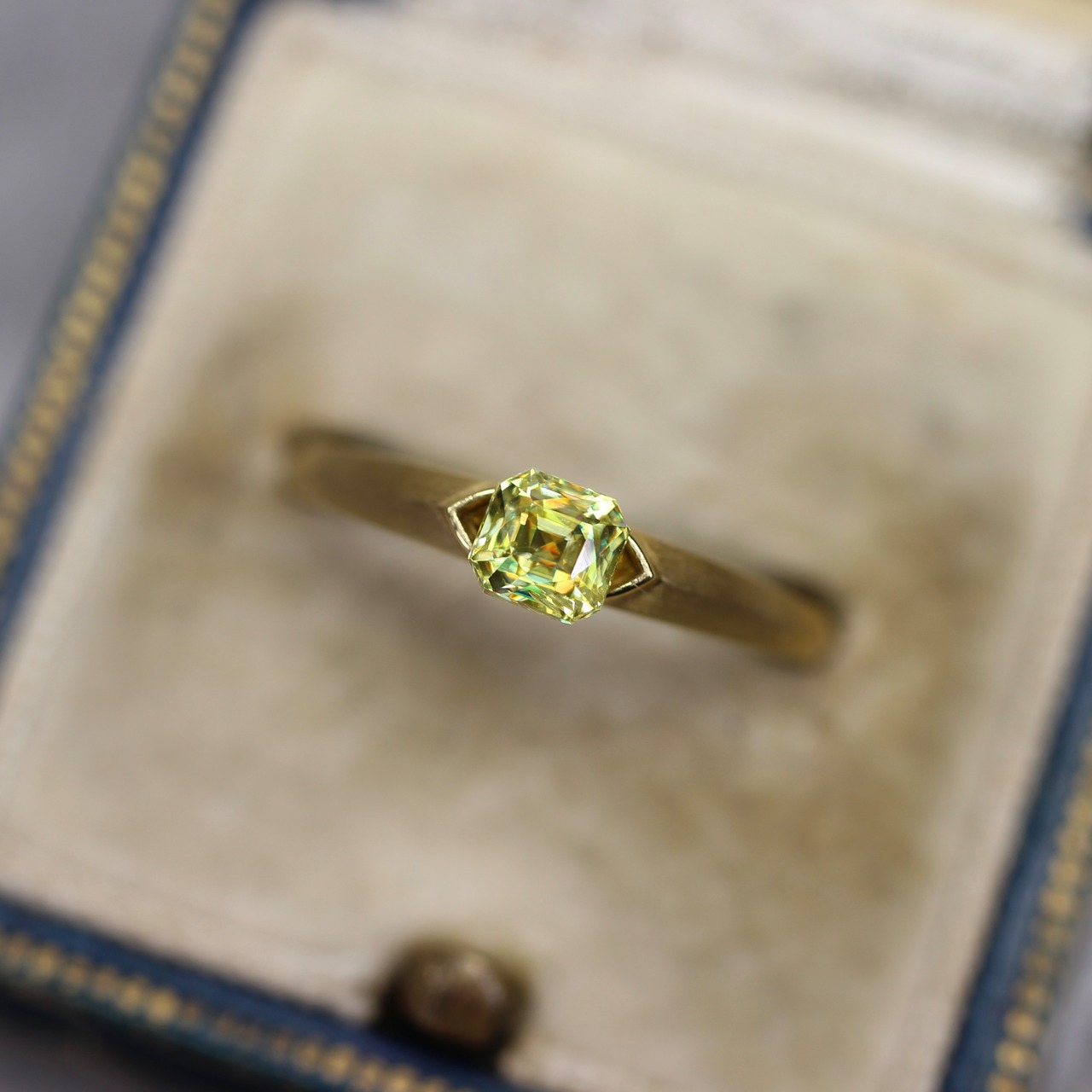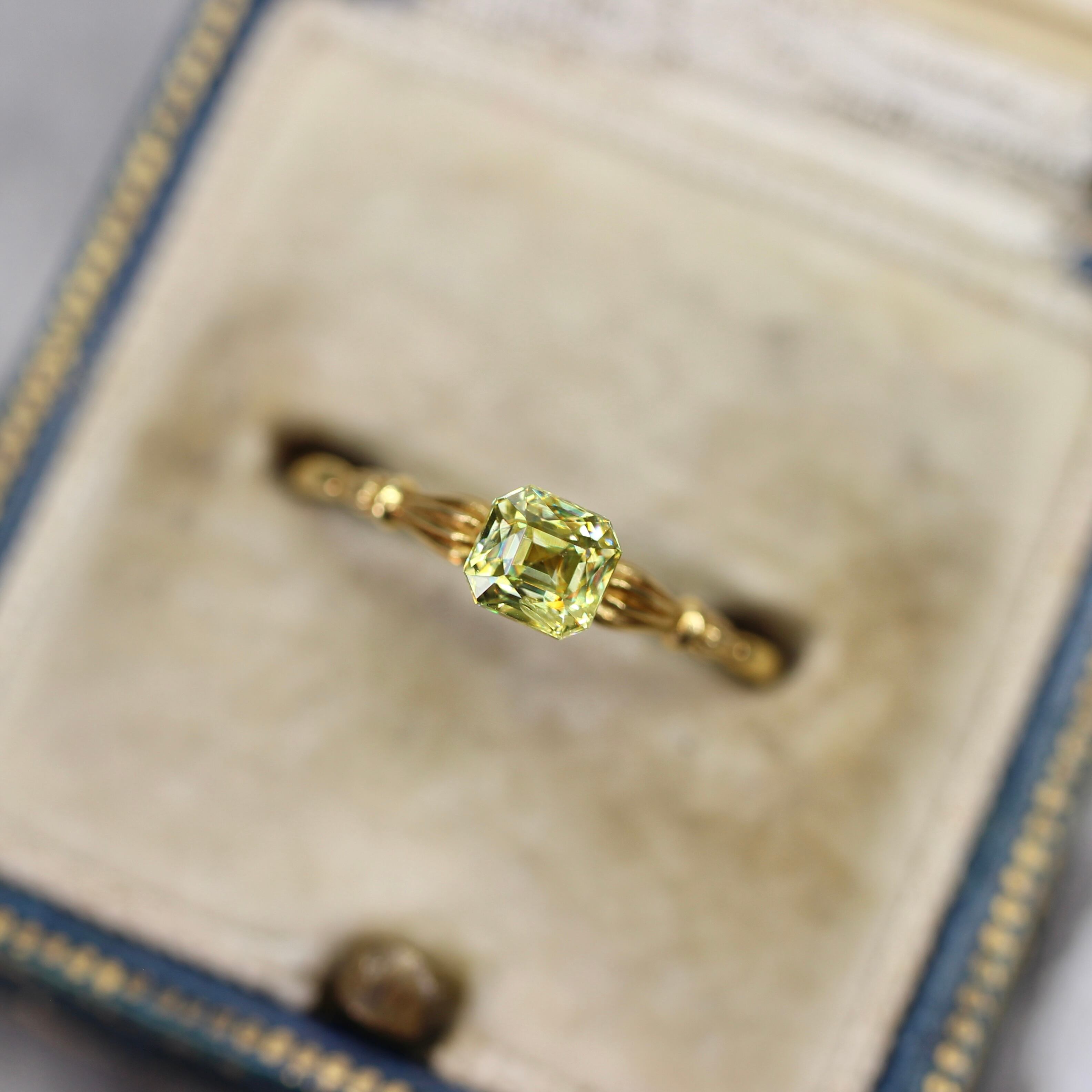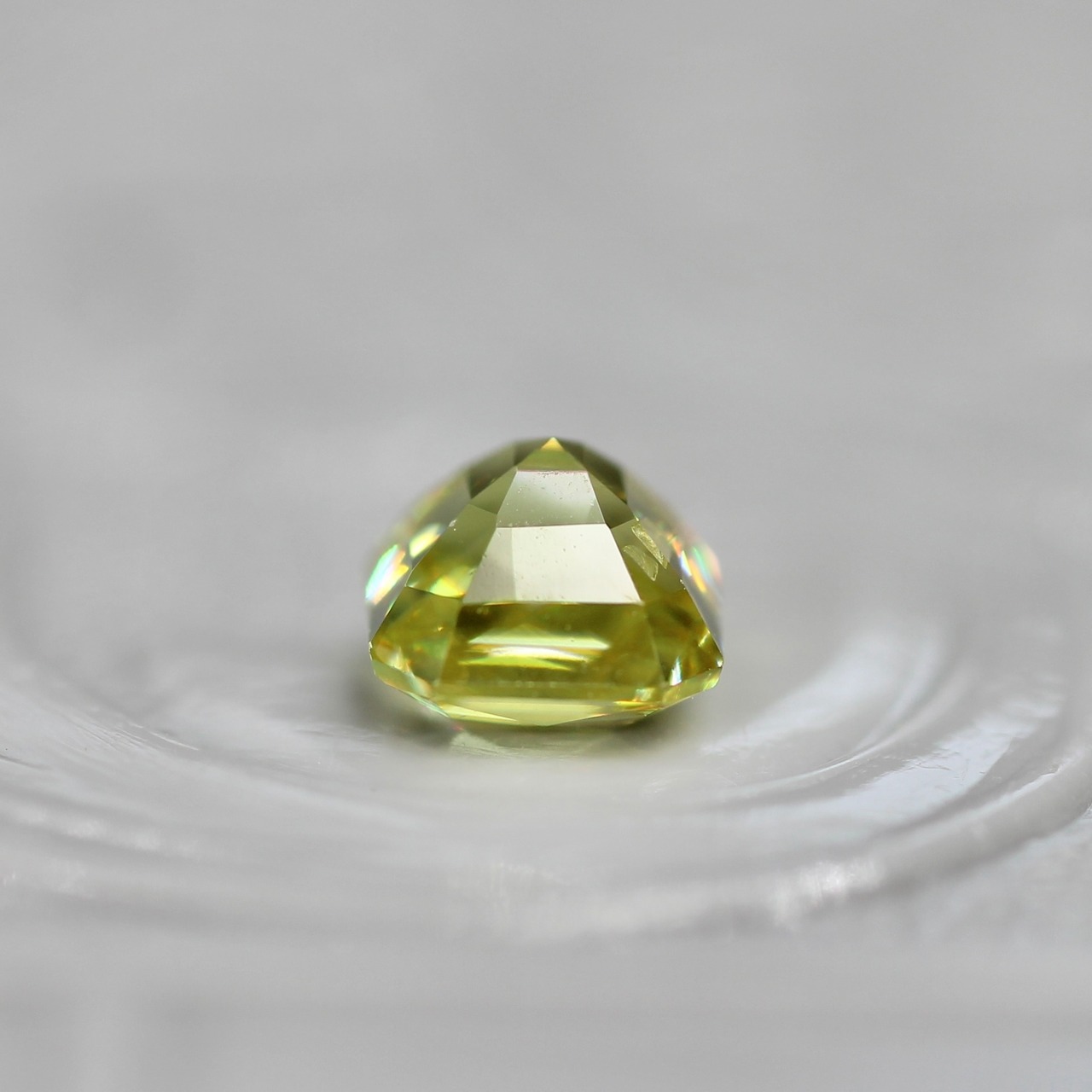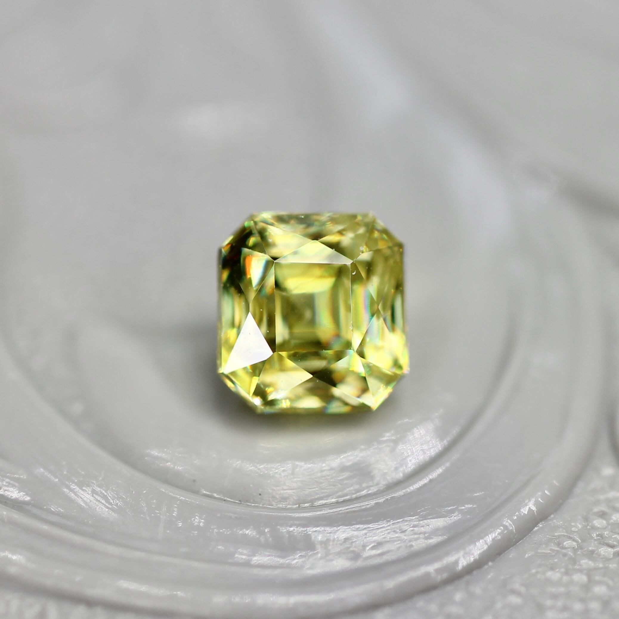 透明度が高く、クリアで瑞々しい印象のイエローグリーンカラーが美しいラディアントミックスカットのスフェーンです。