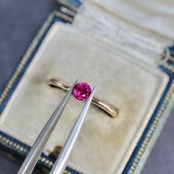 目を惹くビビットカラーのピンキッシュレッドが美しい存在感を放つ、ラウンドカットのルビーです。