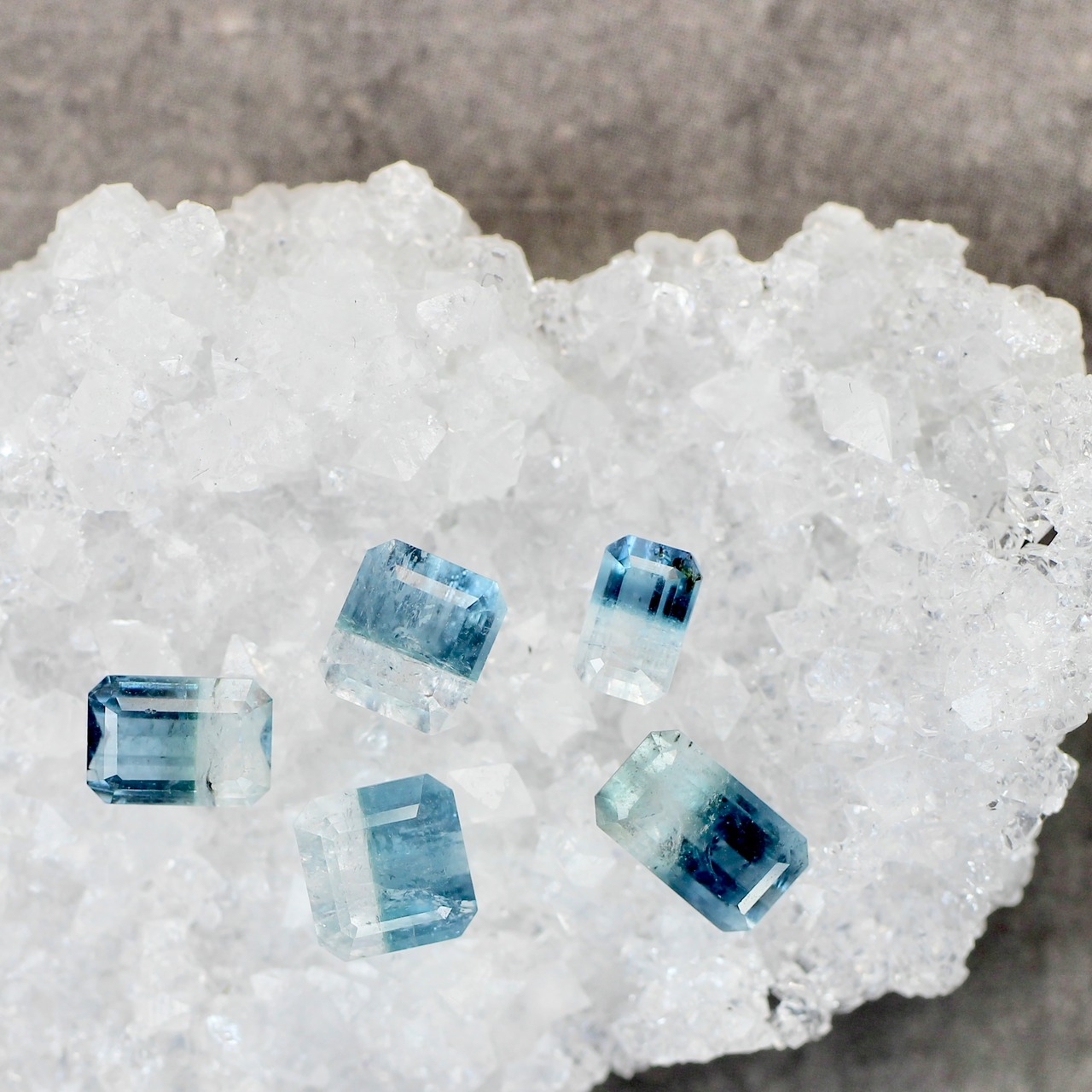 鮮やかなライトブルーのネオン感ある煌めきが愛らしい、エメラルドカットのバイカラートルマリンです。ミルキーホワイトカラーが組み合わさり、ボディ全体の清涼感ある雰囲気を際立たせています。