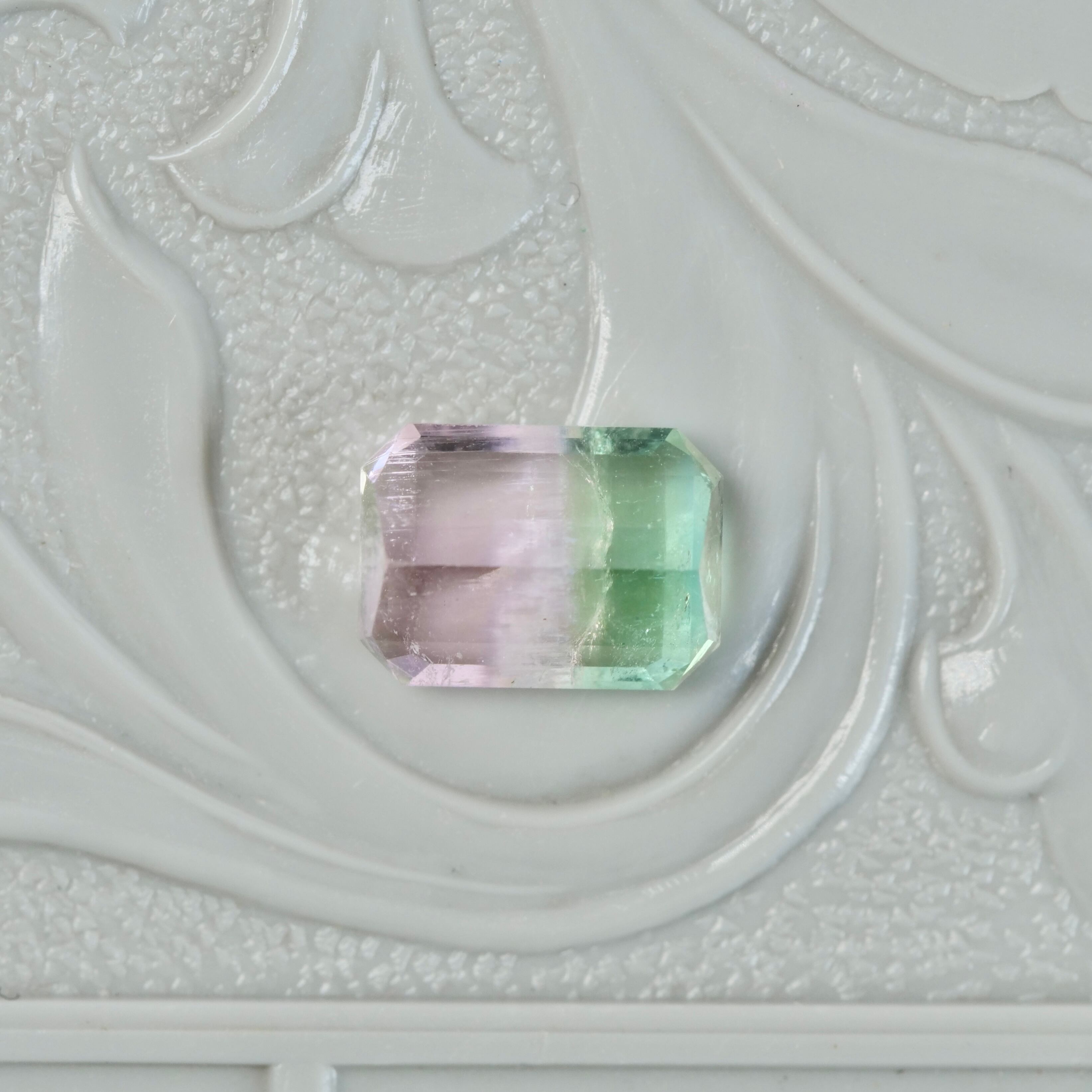 ツヤと透明感溢れるグリーンとピンクカラーの、エメラルドカットのバイカラートルマリンです。光を浴びて、鮮やかで美しい煌めきがボディから放たれます。中央に白いインクルージョンが、ふんわりと漂う雲のように浮かんでいるのが幻想的です。