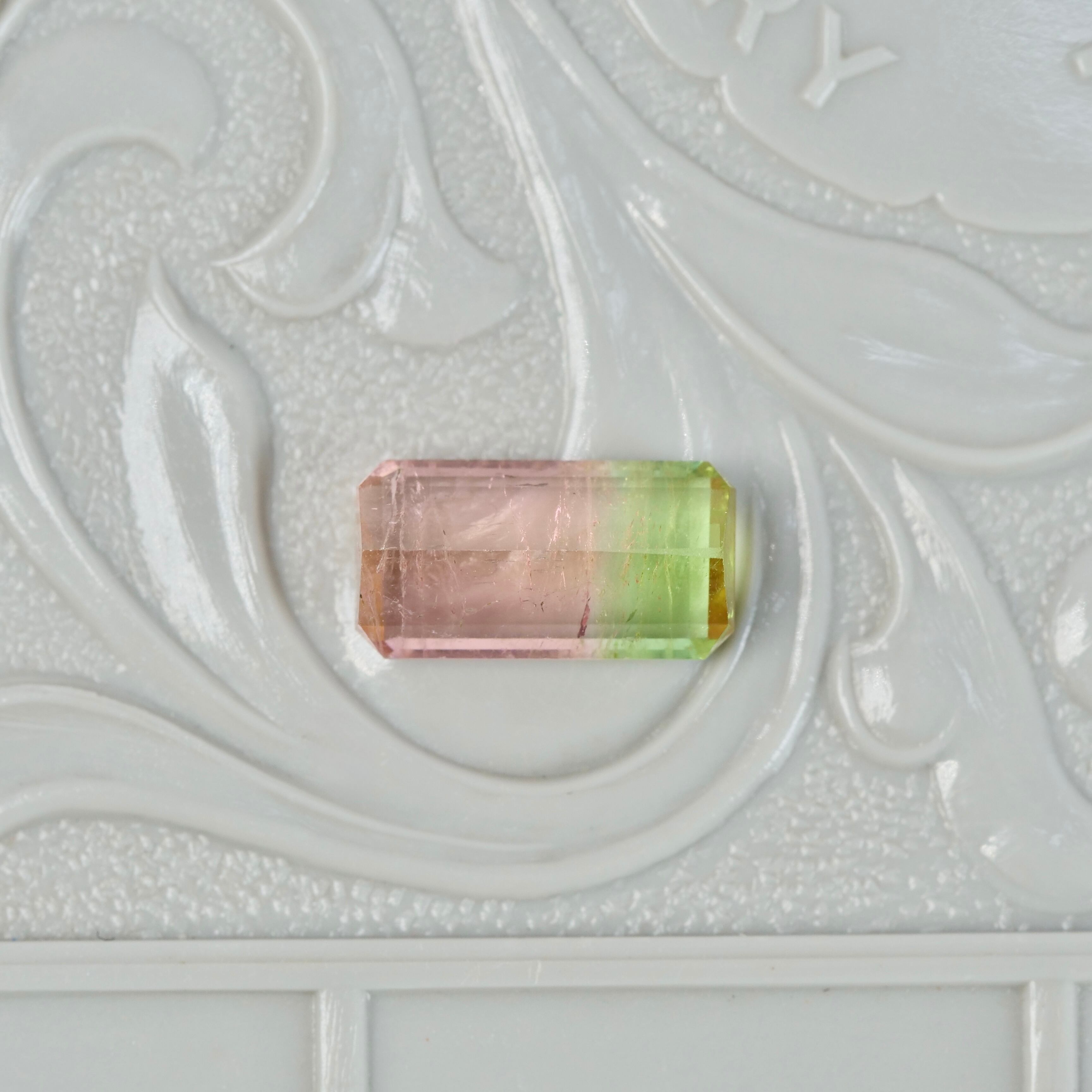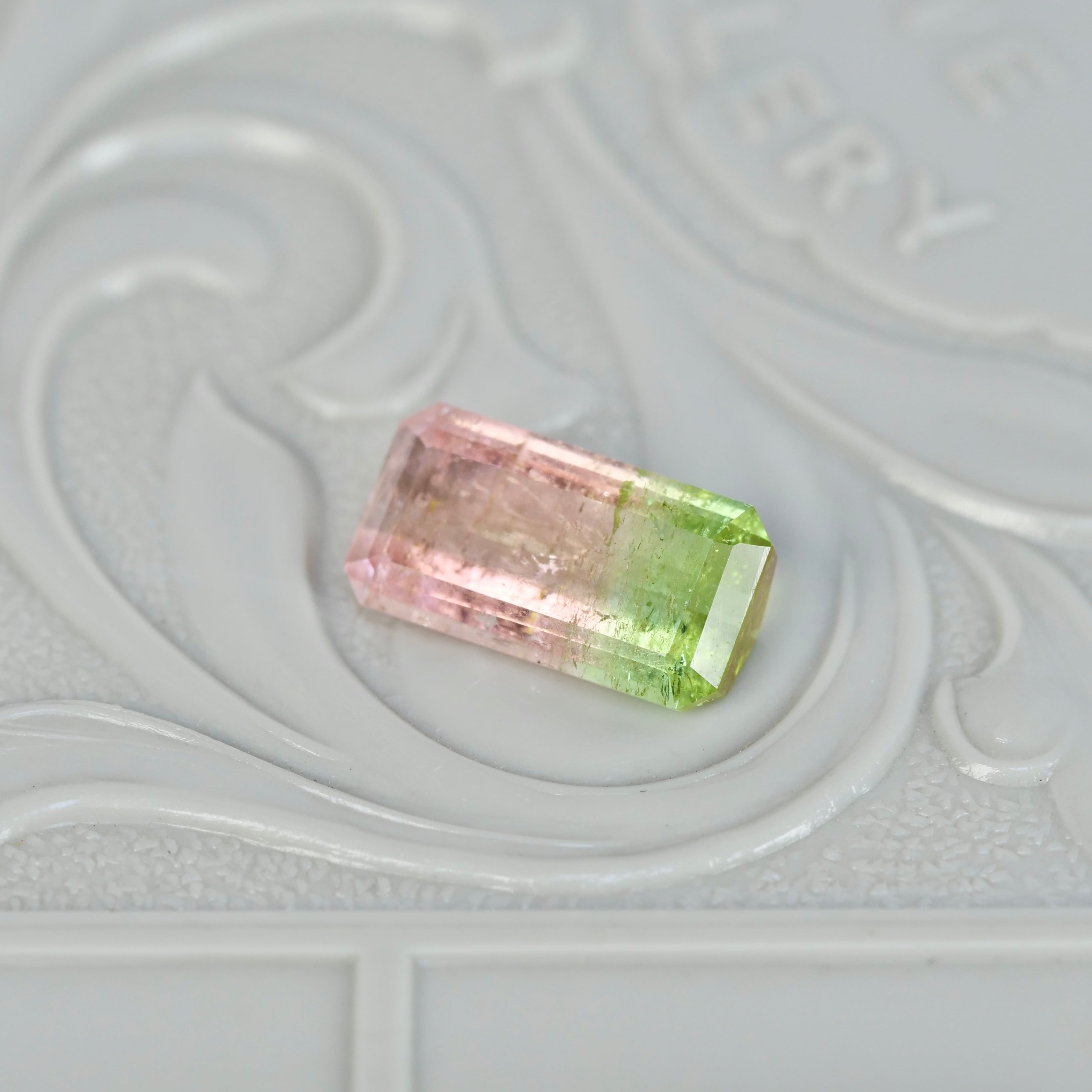 瑞々しいウォーターメロンカラーの、エメラルドカットのバイカラートルマリンです。細長めのフォルムがスタイリッシュで、色のバランスはピンクが多めなのもポイント。透明感がありつつ、全体に散りばめられたインクルージョンが絶妙なジューシーな雰囲気を纏っていて、ジューシーで愛らしいピースです。