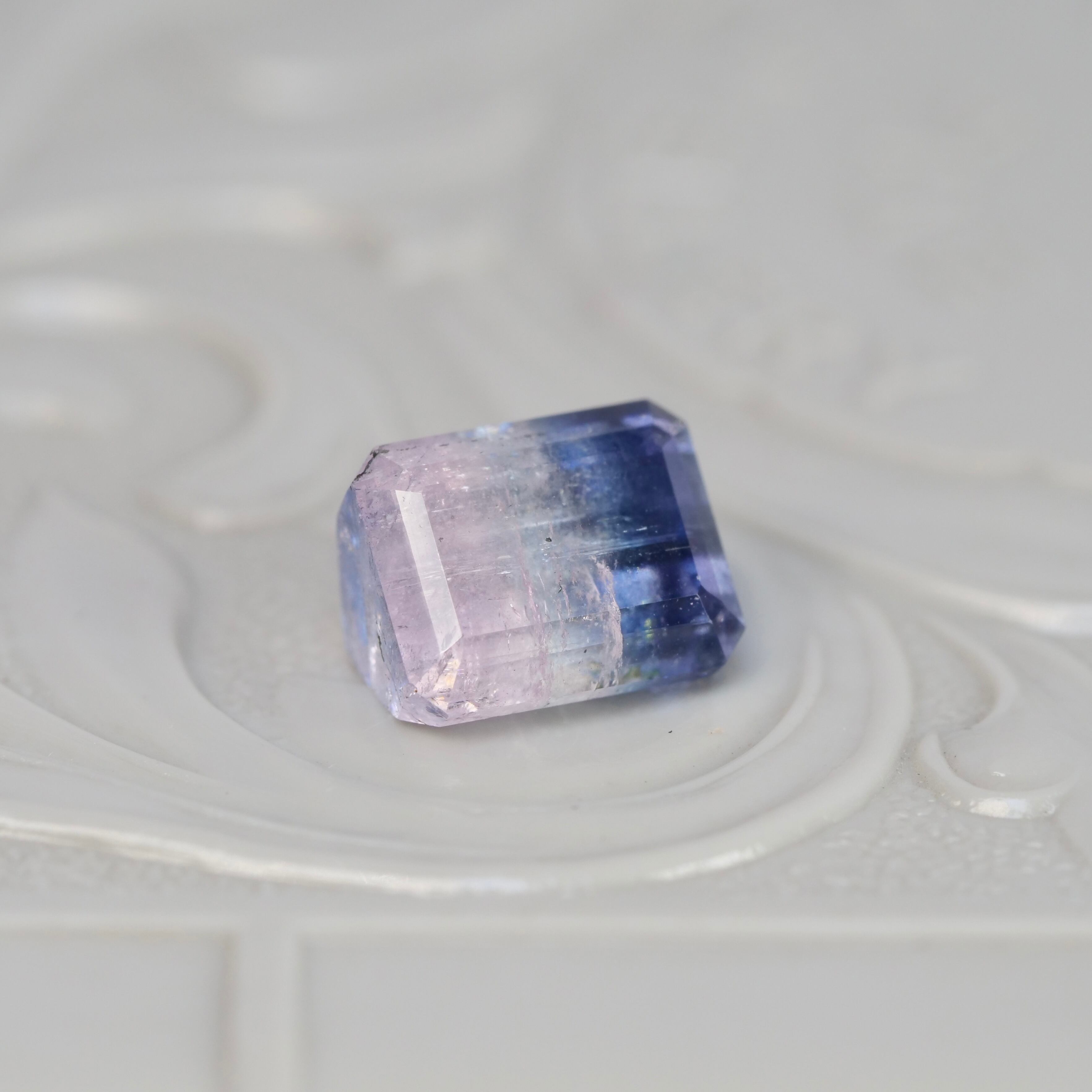 深みのあるインディゴブルーから、ペールホワイト、ペールピンクへ移り変わる、エメラルドカットのパーティーカラードトルマリンです。