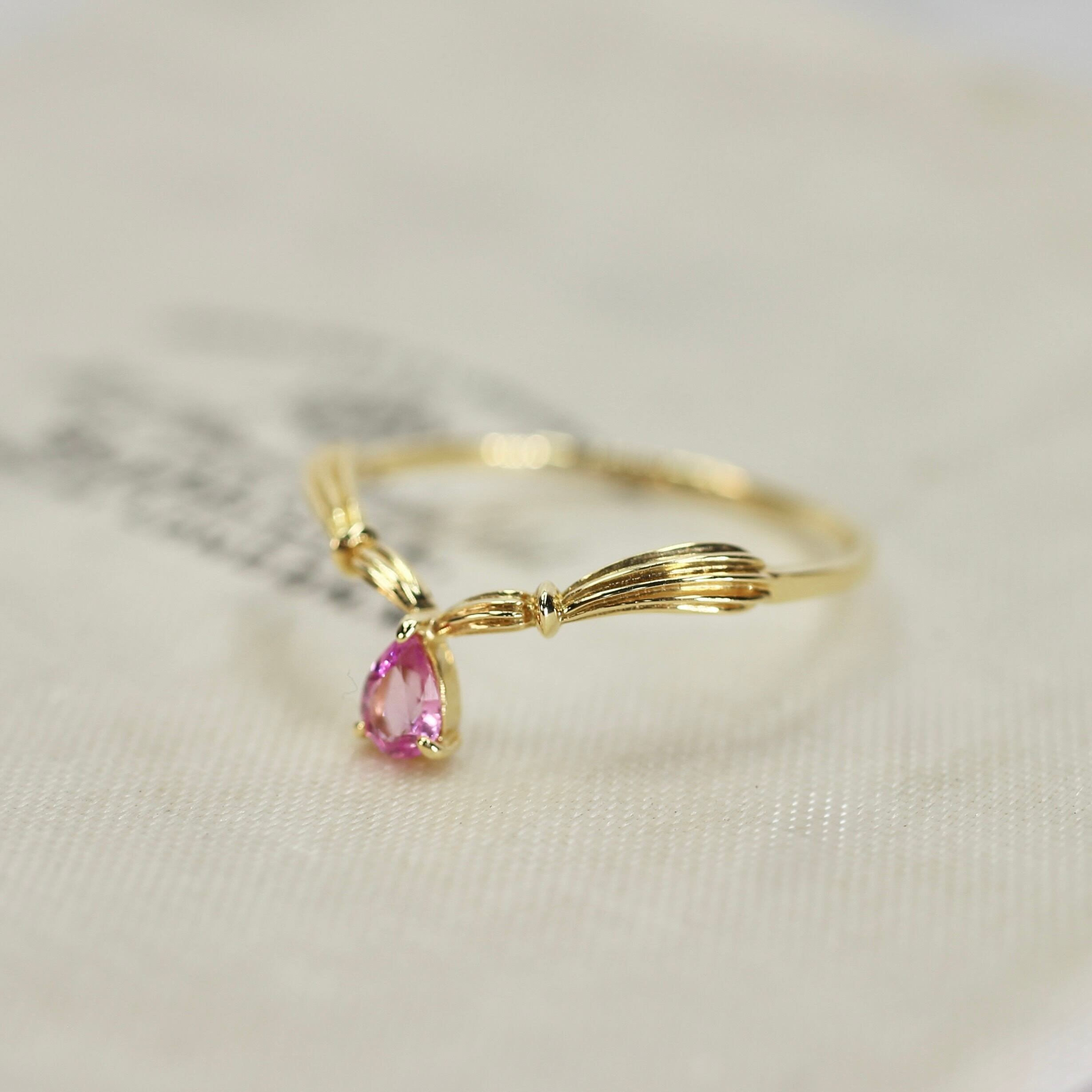 パパラチアサファイア 0.151ct ペアシェイプカット K18YG 3本爪×アンティークVアーム【MJ2847】