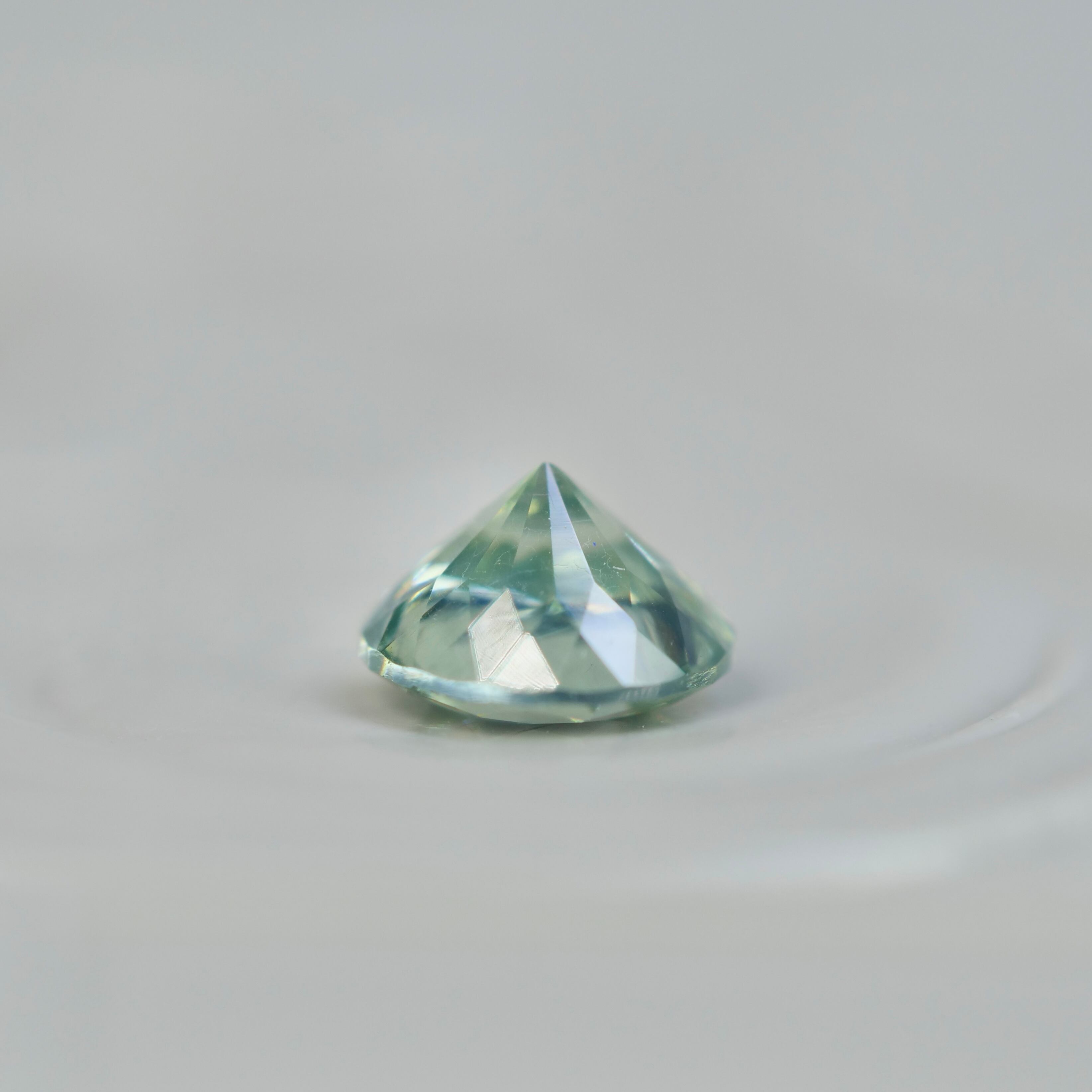 爽やかで透明感ある、ブルーグリーンのシーフォームカラーが魅力的なラウンドカットのグリーンジルコンです。肉眼で見て目立つ内包物はなく、涼しげな川のせせらぎのような煌めきを楽しめます。