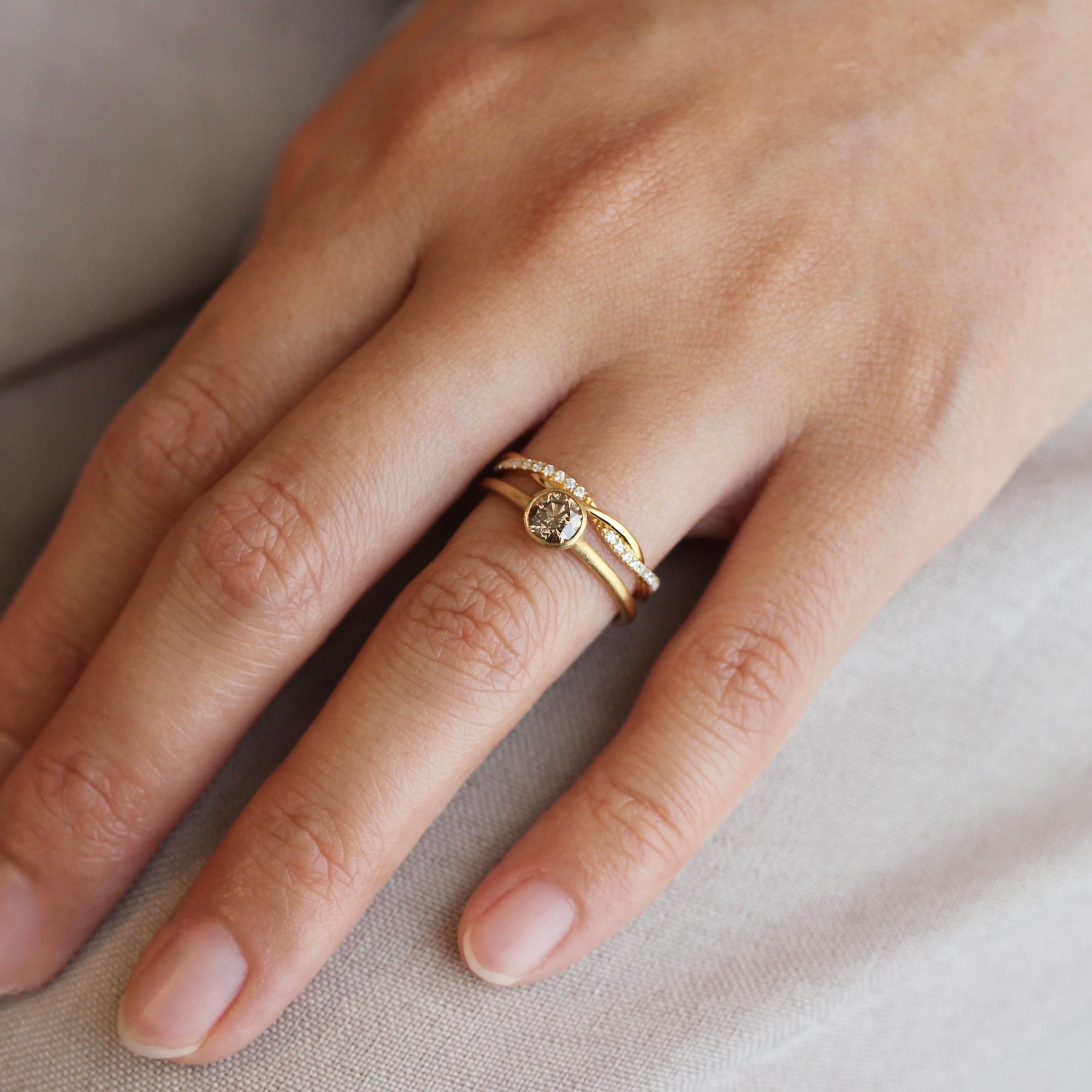 地金とダイヤモンドがツイストするように交差する個性的なデザイン。