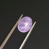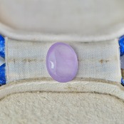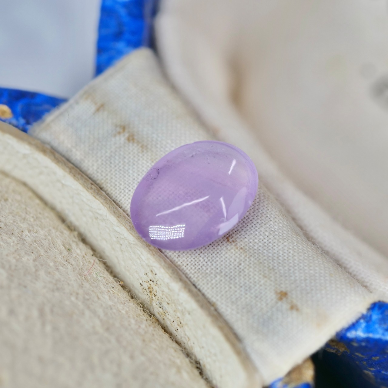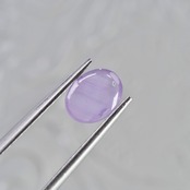 やわらかなピンクとラベンダーカラーのボディに、ミルキーなニュアンスを纏った、カボションカットのスターサファイアです。太いピンク色の帯状のカラーがふんわりと、斜めに伸びています。