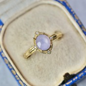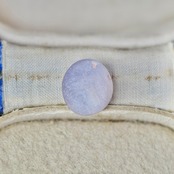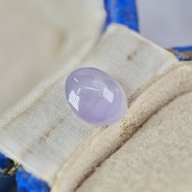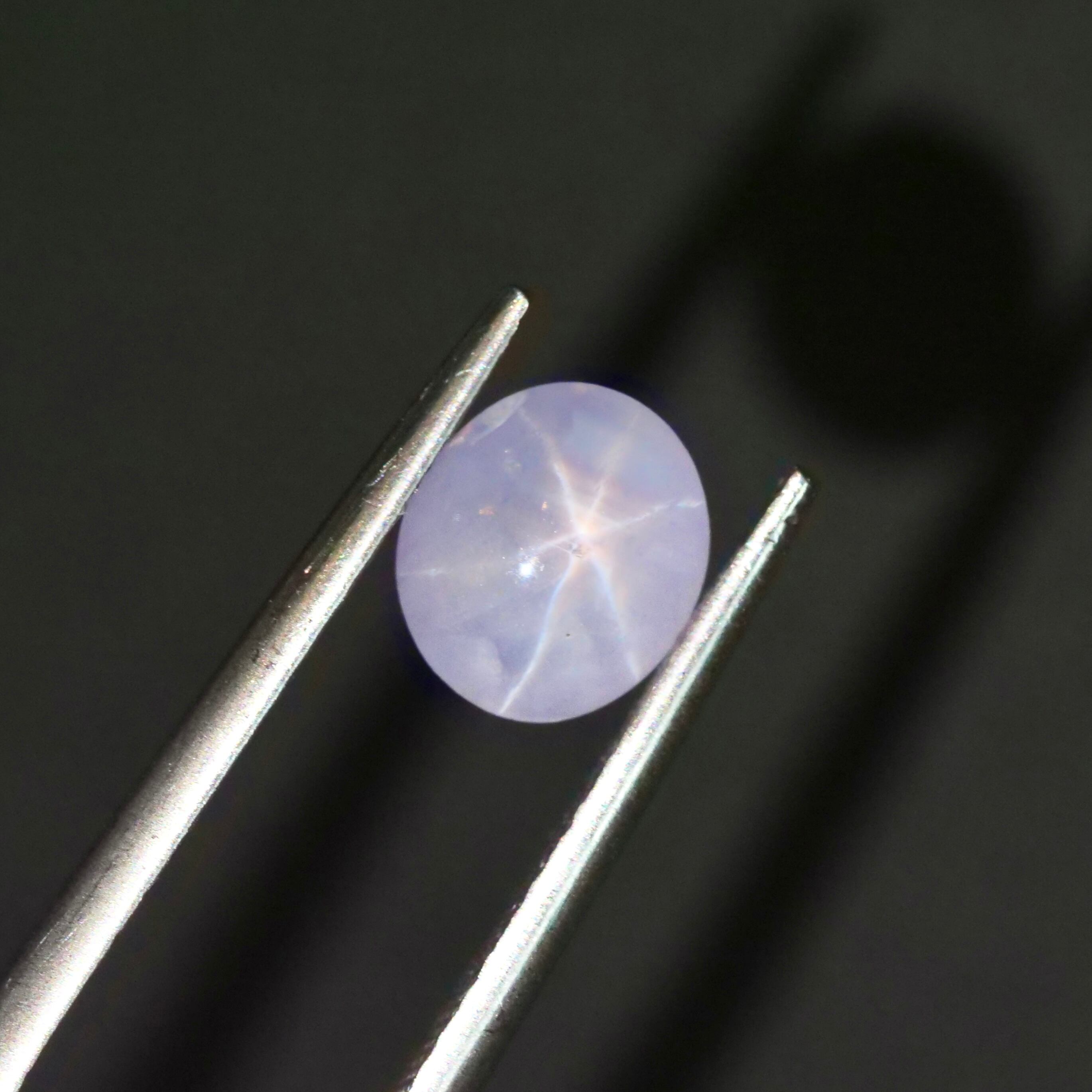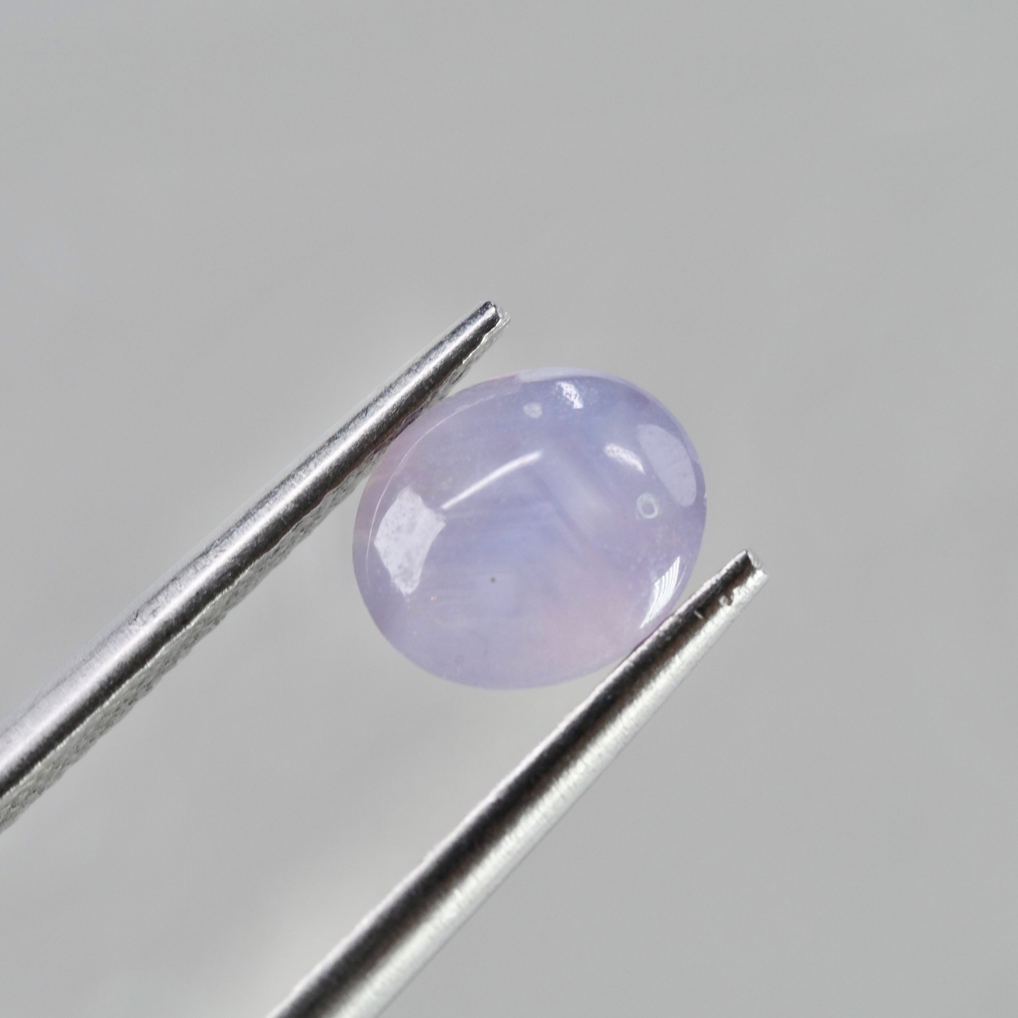 青紫の成長線を有した落ち着いたグレイッシュトーンの全体に霞のようなベールを纏った、パープルカラーの カボションカットスターサファイアです。ぷるんとした丸く愛らしいフォルムで、放射状に美しい光が交差し、スターが現れます。肉眼で見ると、ステップ状に角がある細いライン状の成長線が複数重なり合うのが確認できます。裏面に小さな欠けがあります。