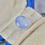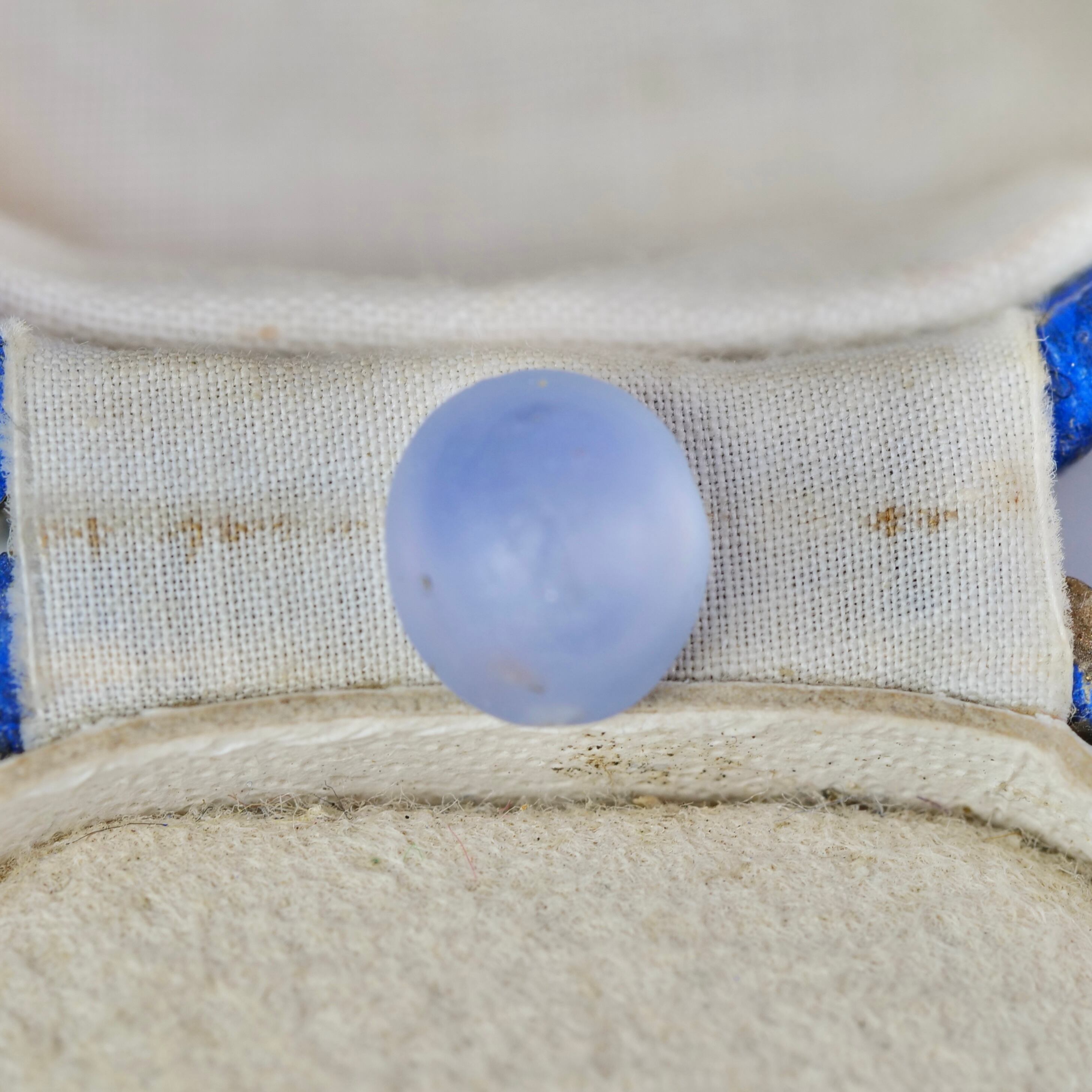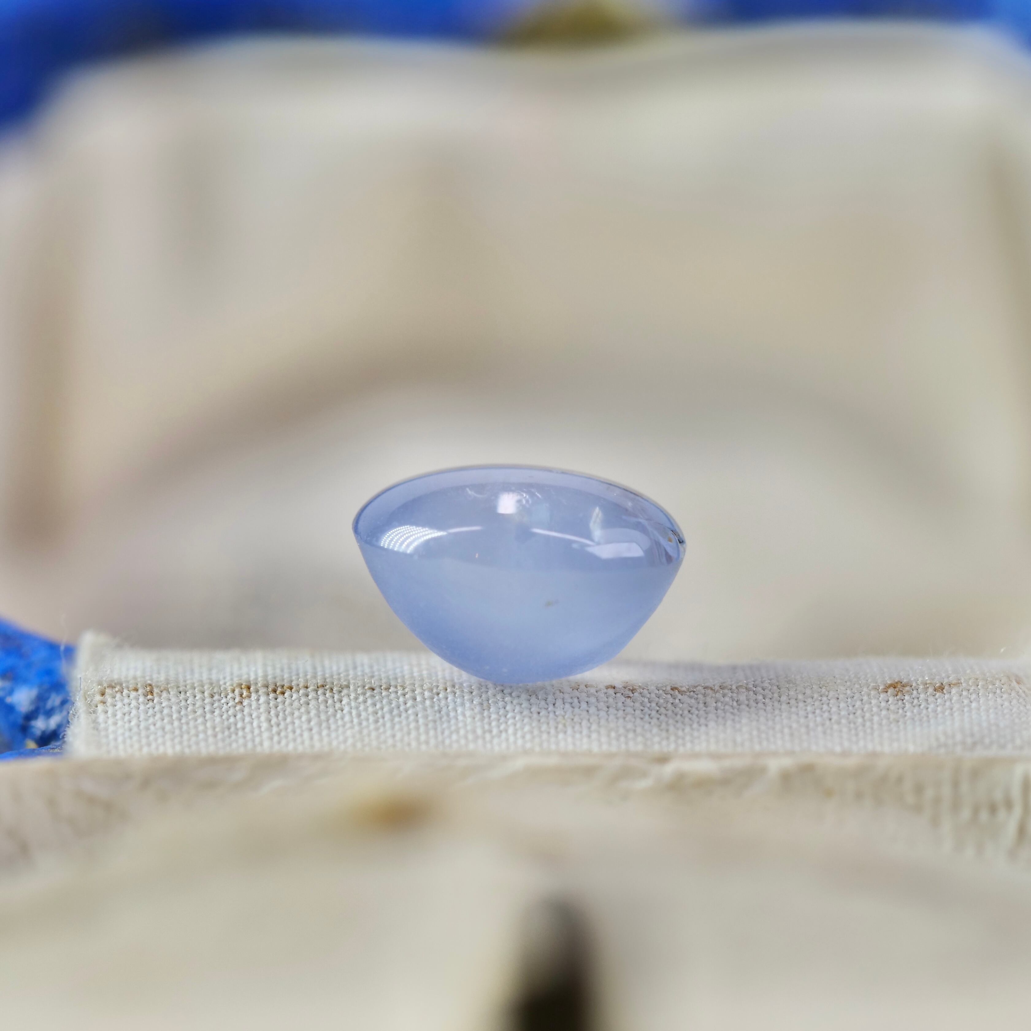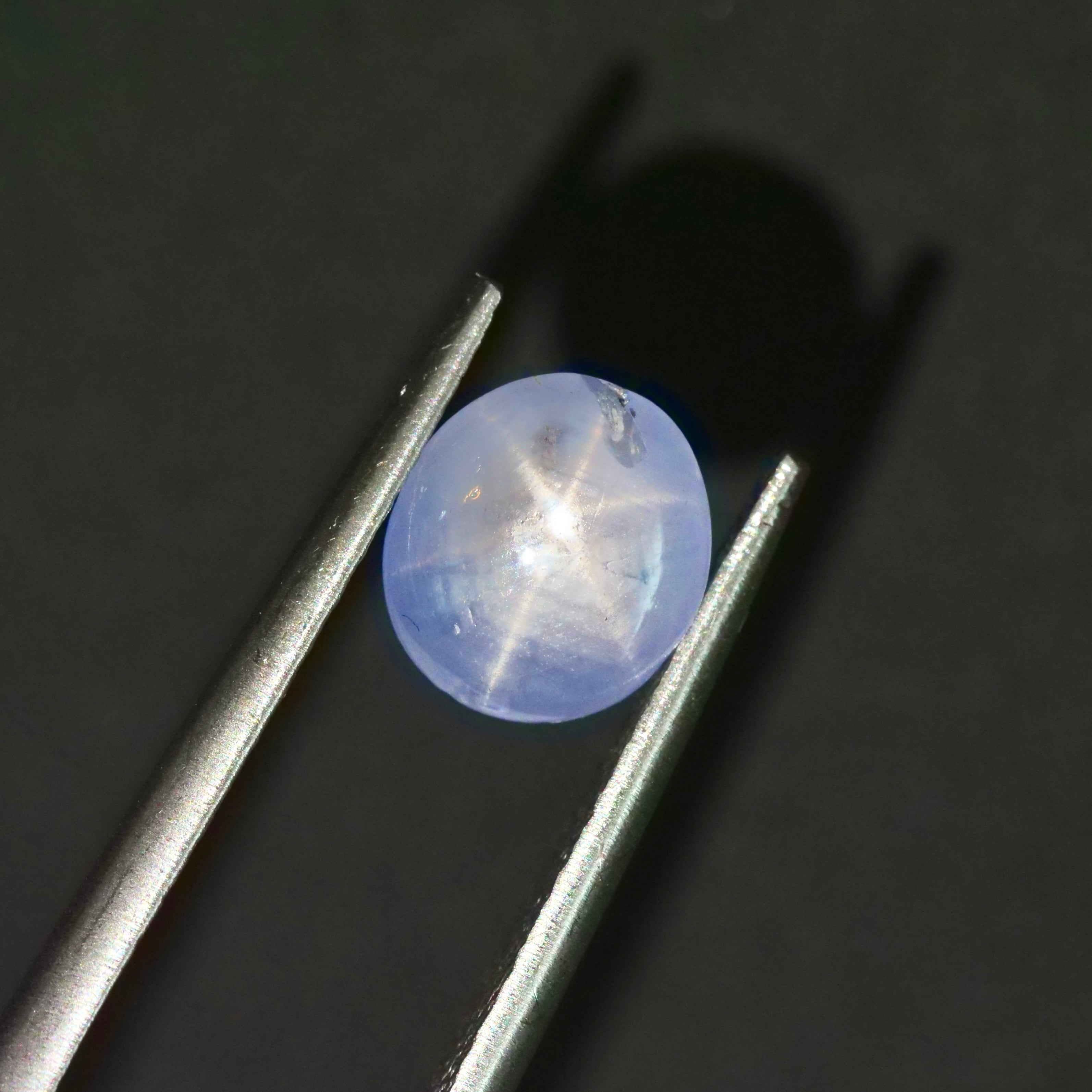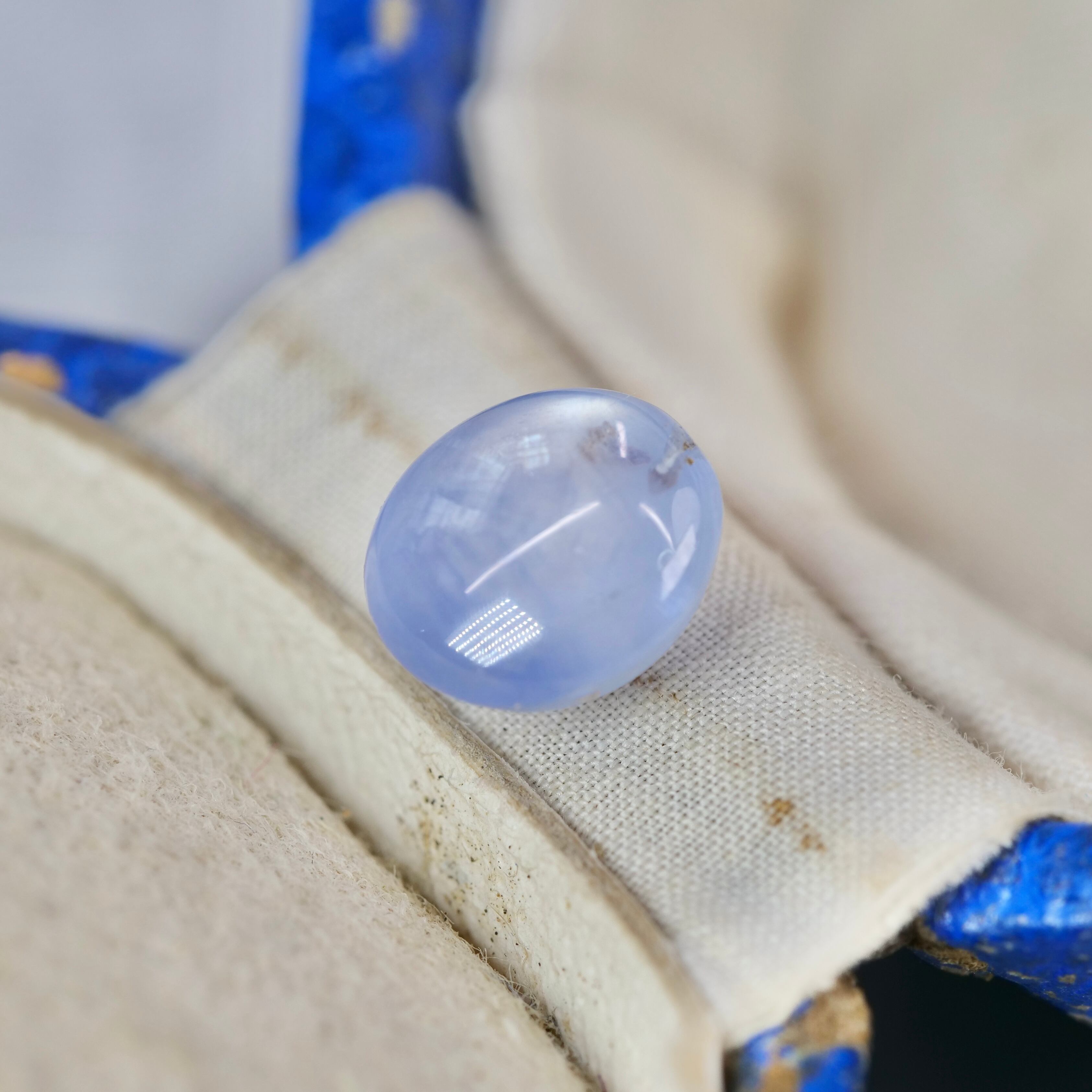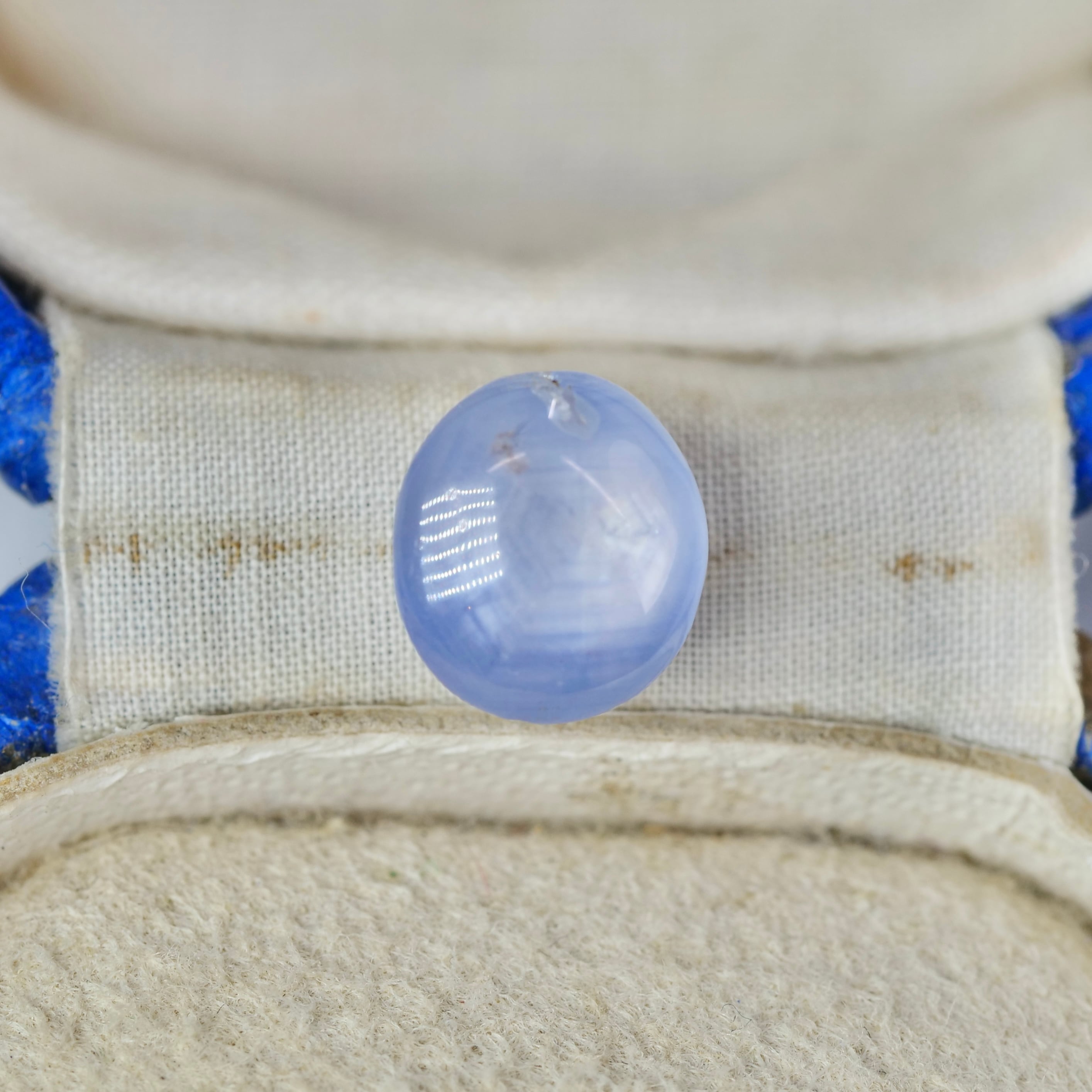 穏やかなサックスブルーから清涼感を感じる、カボションカットのスターサファイアです。上品で瑞々しい紫陽花のようなカラーに淡く青白い六条のスターが重なり美しい表情を魅せます。肉眼で見ると、細い帯状に並ぶワントーン濃いブルーの成長線やインクルージョンなどが確認でき、自然の魅力も詰まったピースです。
