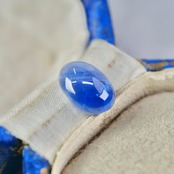 サファイアらしい、深く鮮やかなコバルトブルーの片隅に柔らかな乳白色が漂う、カボションカットの成長線入りサファイアです。太さの異なるいくつもの成長線が斜めに並んでいて、自然の生み出したロマンを感じます。