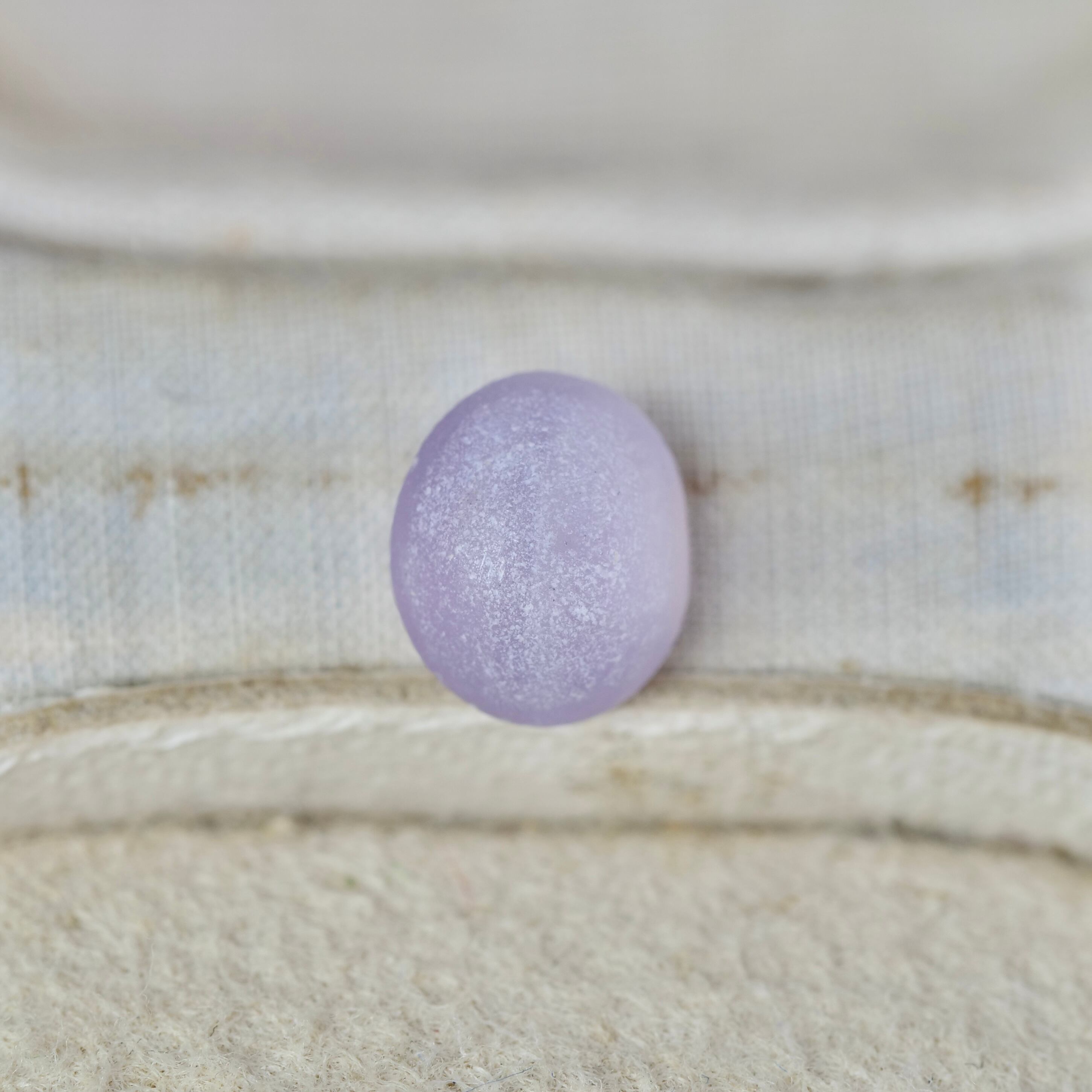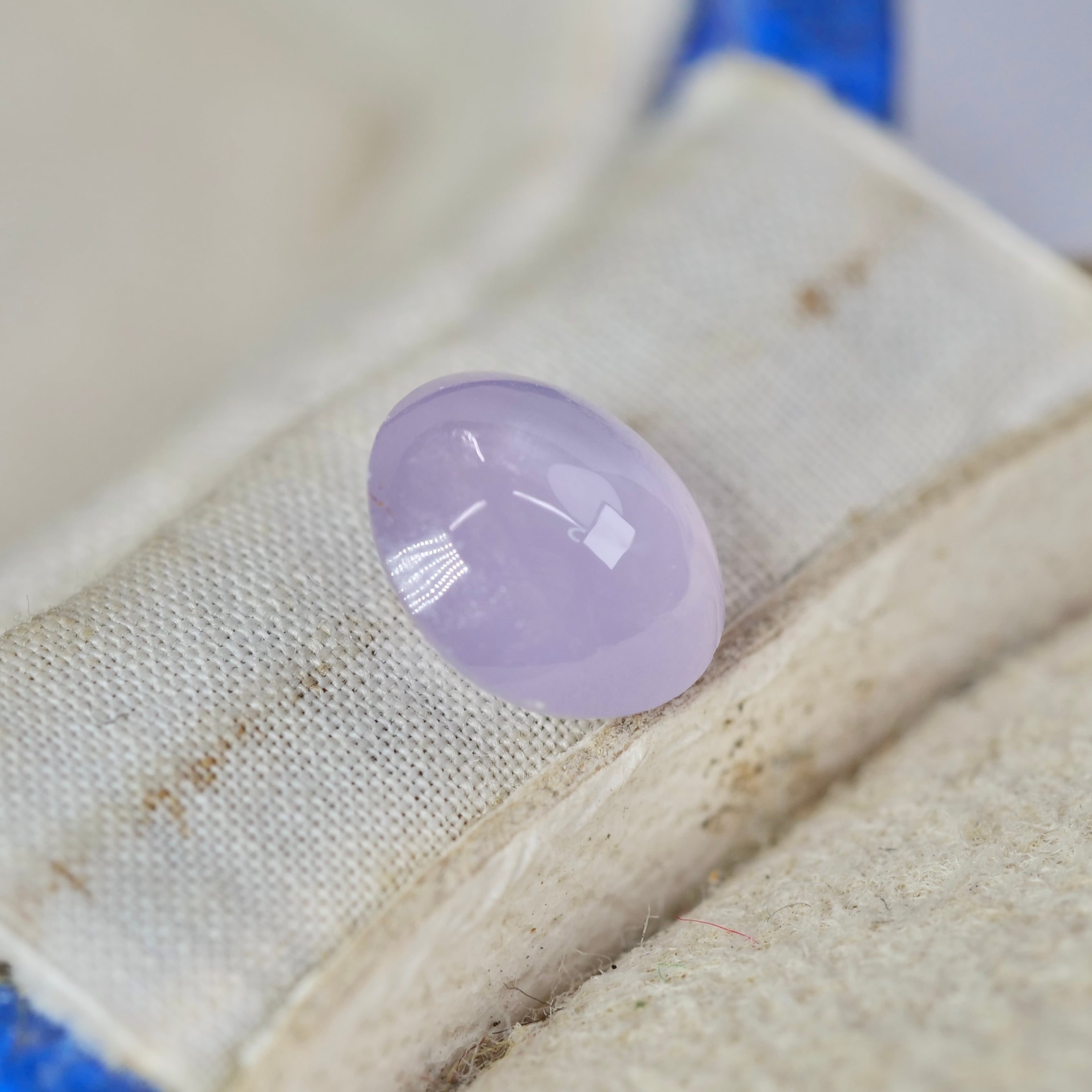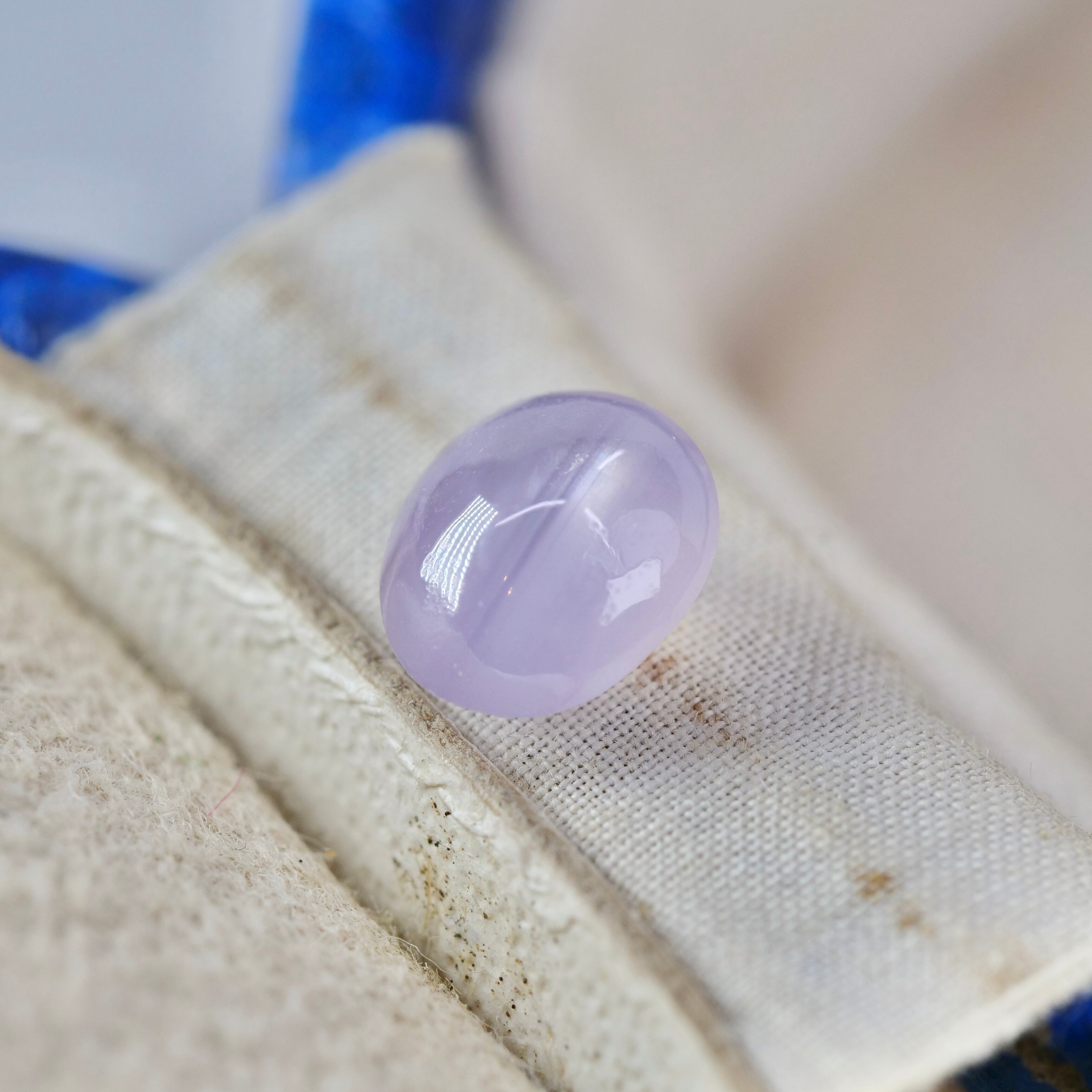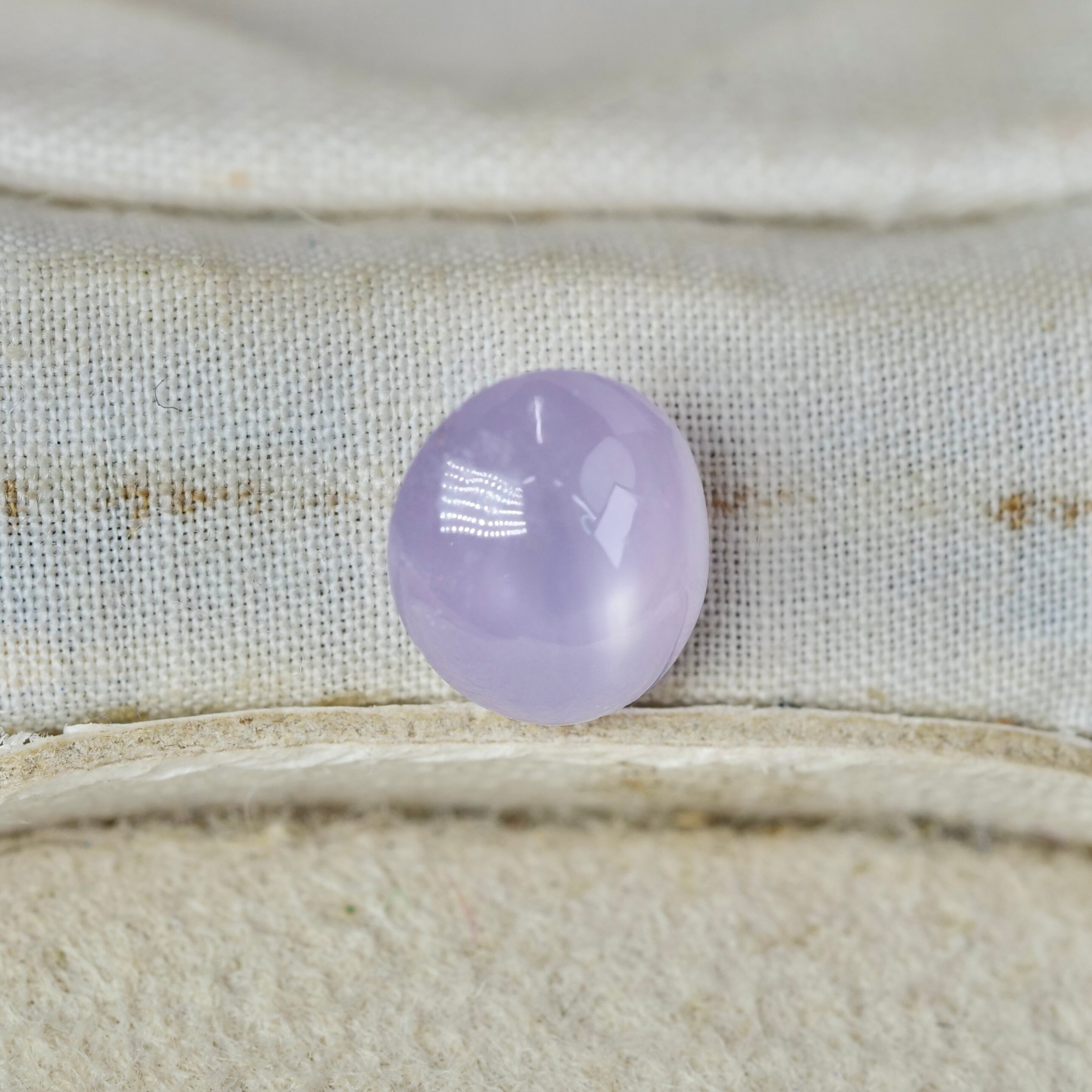 雫のような瑞々しさを持った、ふんわりとしたラベンダーカラーが上品なカボションカットのスターサファイアです。シルキー感のあるツヤと照りを持ったボディから浮かび上がる六条のスターが可憐でありながら華やかな雰囲気を演出しています。