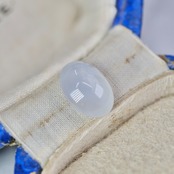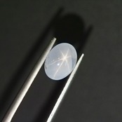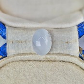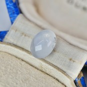 月光のように青白く幻想的なカラーのカボションカットのスターサファイアです。半透明でシルキーな質感に、スターの白い輝きが重なり上品で幻想的な雰囲気です。側面に小さな黒いインクルージョンがありますが、フェイスアップではごくわずかに見える程度で、天然が生み出した個性として楽しめます。