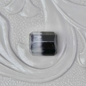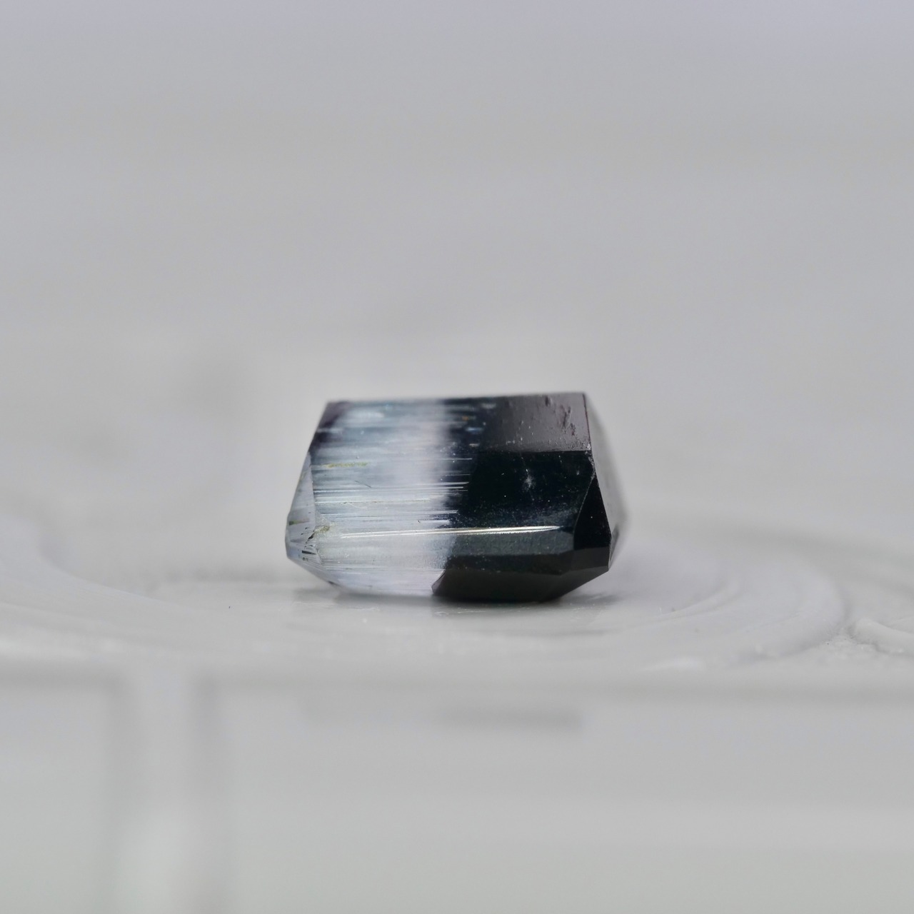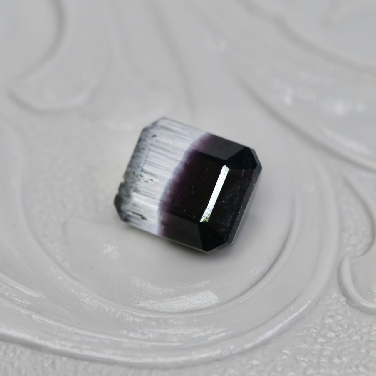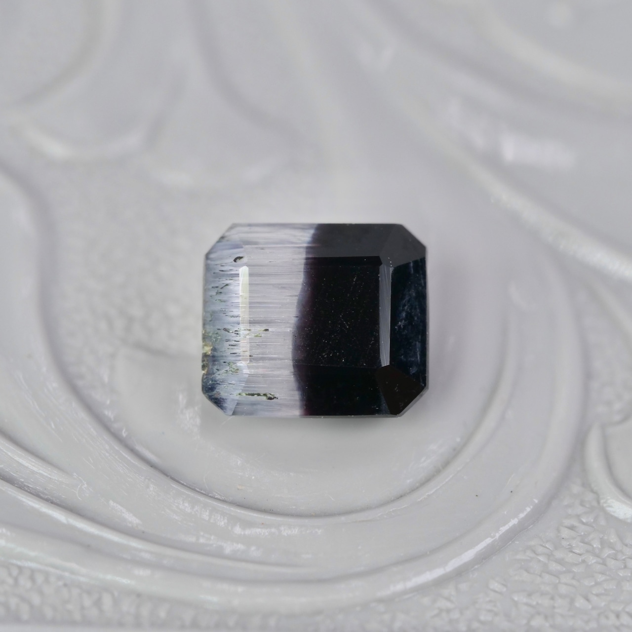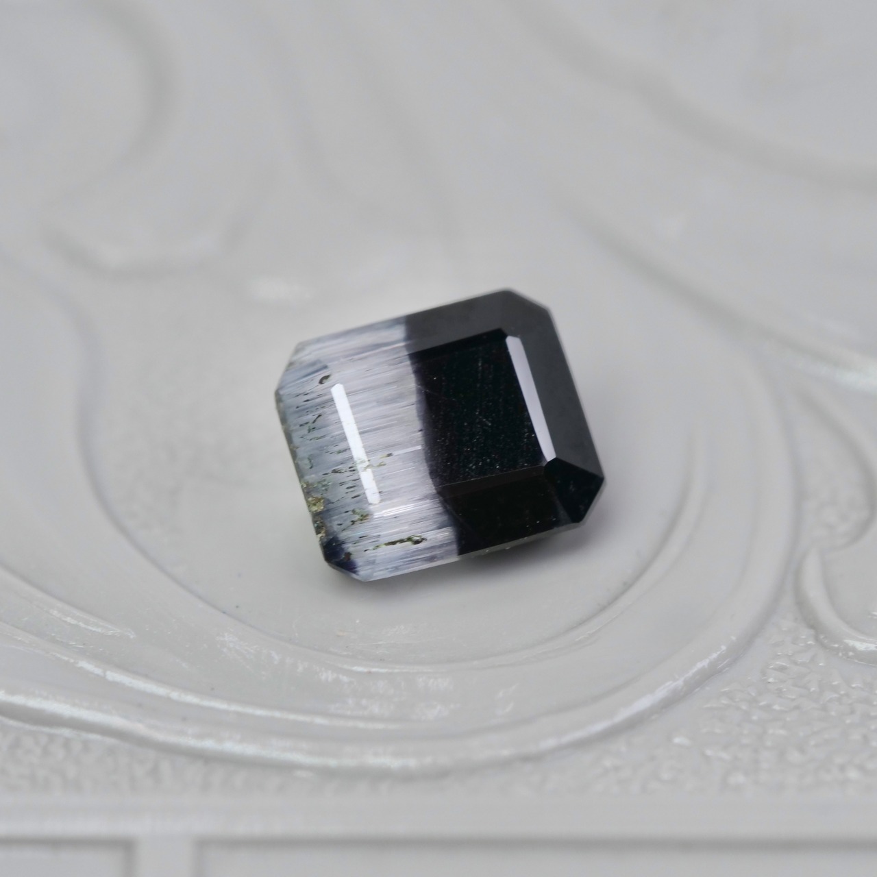 漆黒で鏡面のような艶めきと、霜柱の様なテクスチャのシルキーホワイトが魅力的な、エメラルドカットのバイカラートルマリンです。無彩色の力強く凛としたカラーのコントラストが美しいピースです。