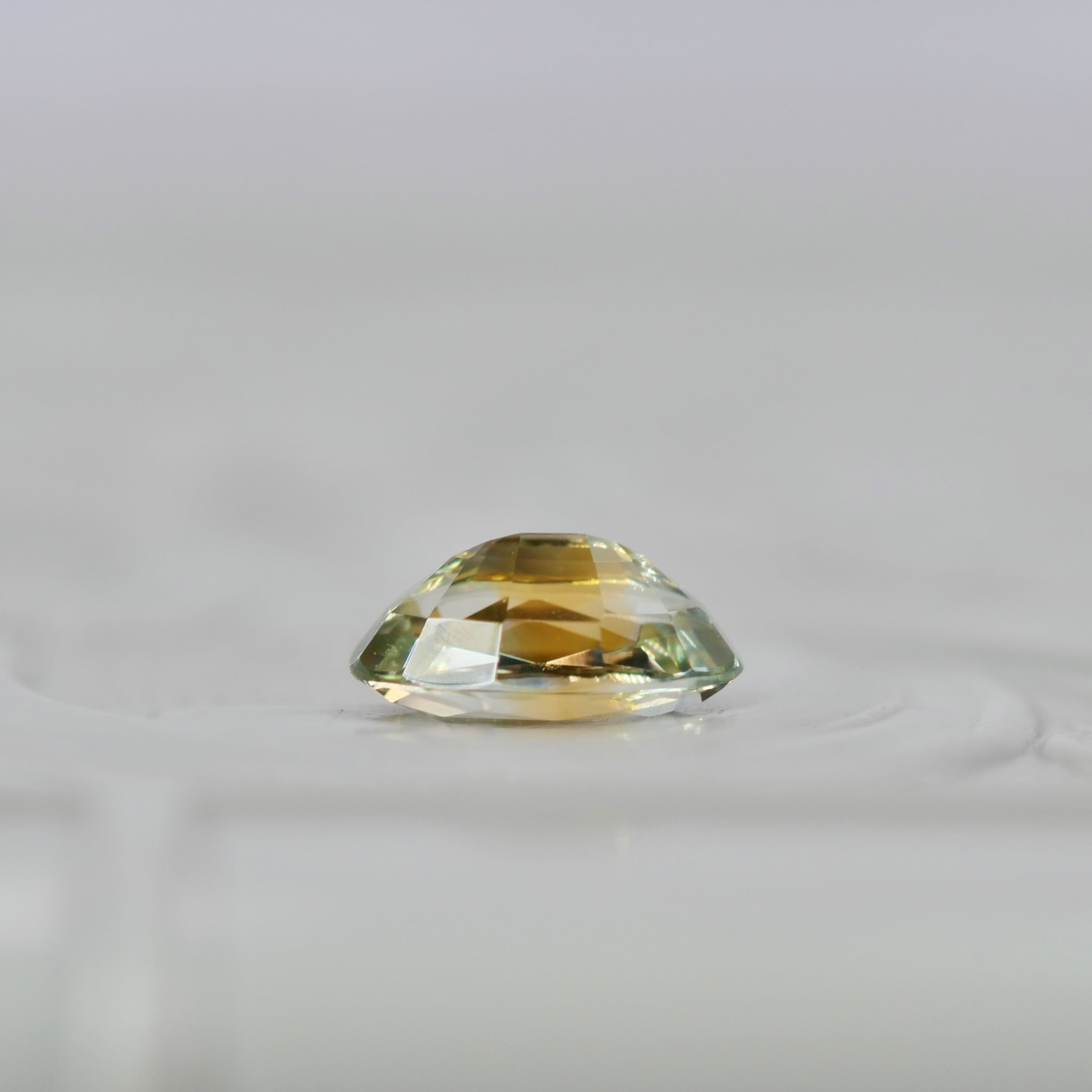 やわらかなゴールドトーンの中央にあたたかみのあるイエローの色だまりが浮かぶ、オーバルカットのモンタナサファイアです。透明感があり、光を受ける角度によってテーブル面越しに見える色だまりが表情を変えながら優しく輝きます。