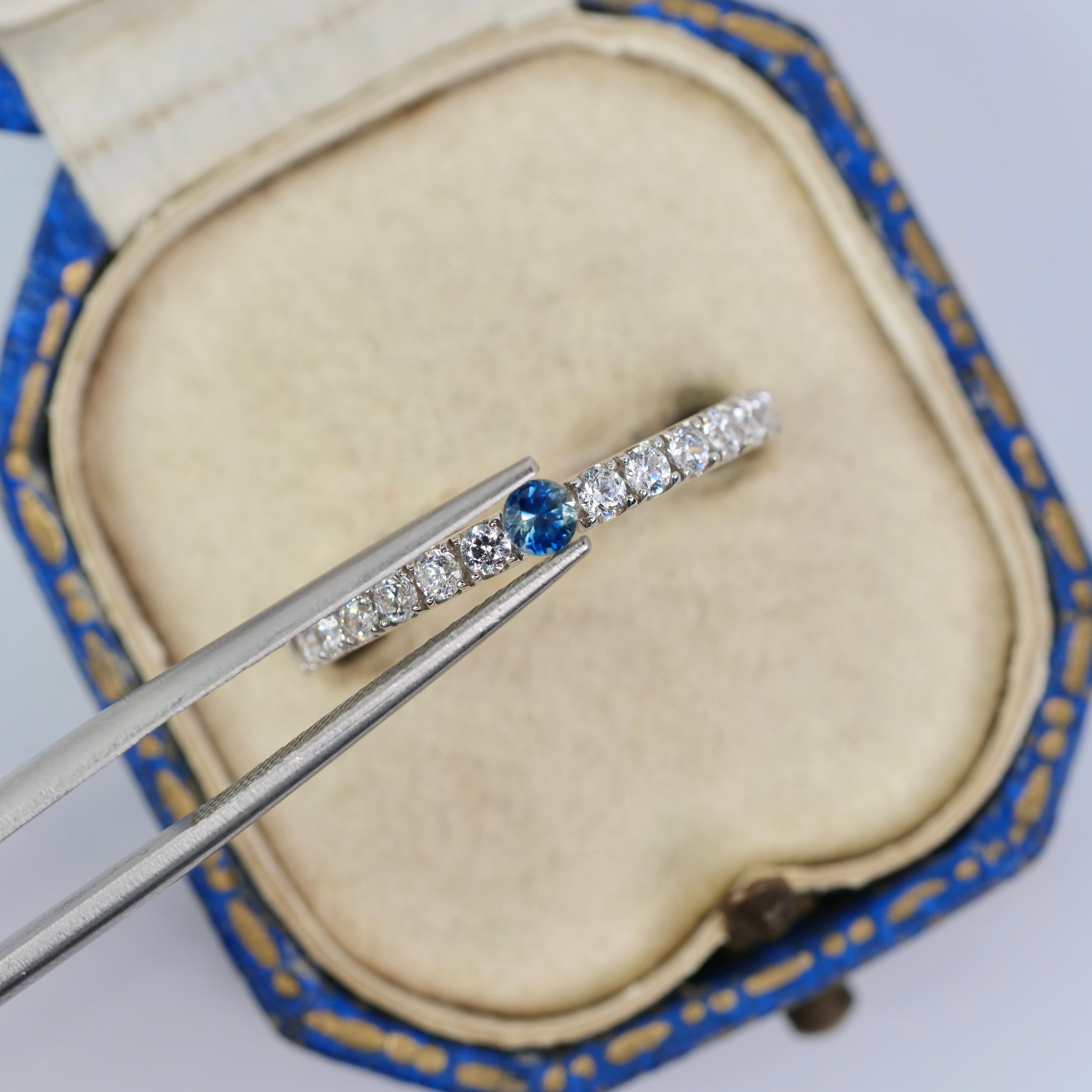 印象的な深いブルーやアイスブルーが煌めく、ラウンドカットのモンタナサファイアです。落ち着いた雰囲気を纏いながらも、涼しげで、しっかりとした輝きを放ちます。