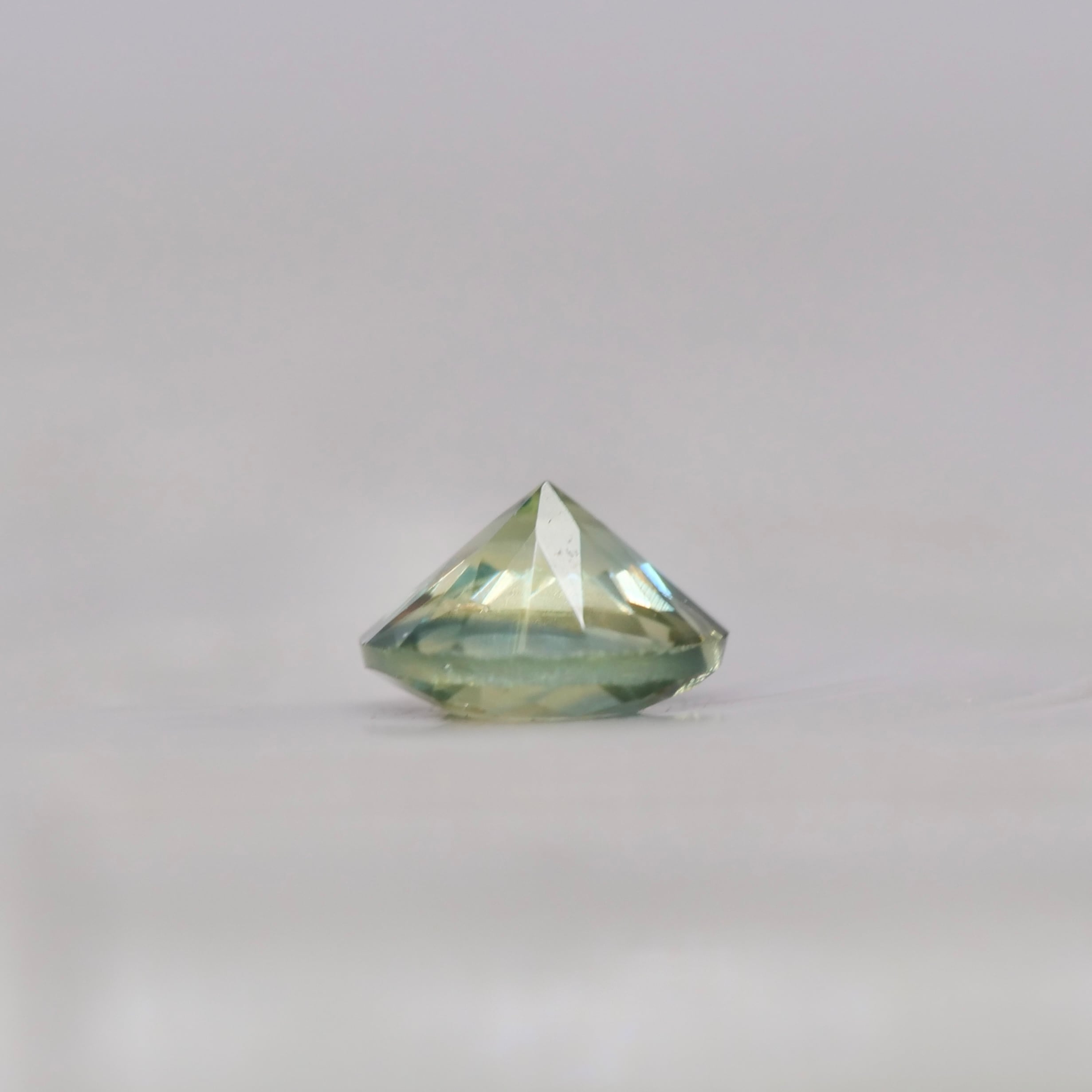 黄みを帯びたブルーグリーンがやわらかく輝く、オーバルカットのモンタナサファイアです。ナチュラルカラーが穏やかな印象で、角度によってグリーンとイエローの2色が混ざり合い、心が落ち着くような自然を感じるカラーと煌めきが生まれます。