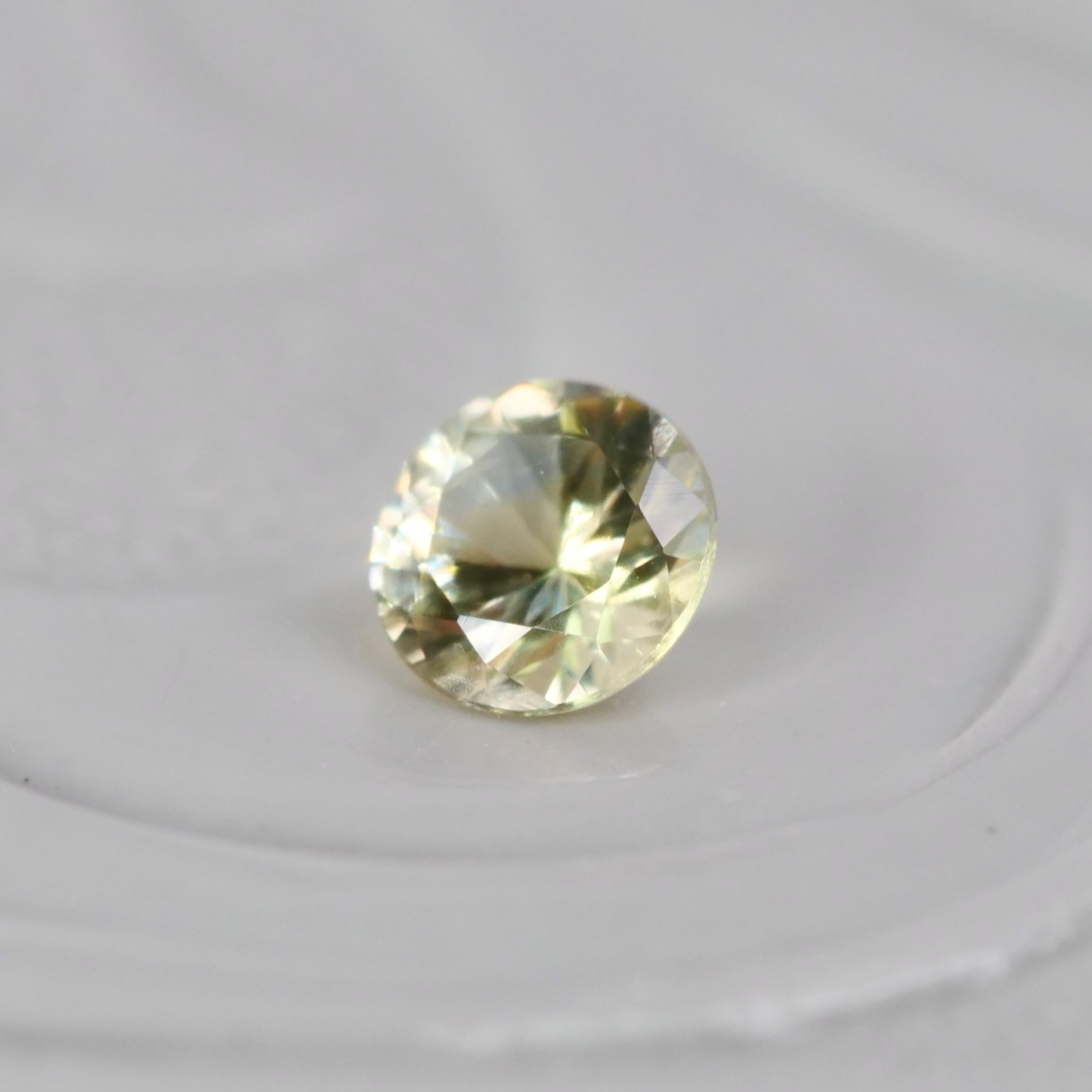ライトトーンのクリアグリーンに淡いイエローが溶ける、ラウンドカットのモンタナサファイアです。柔らかなニュアンスカラーで、透明感が高く、繊細な煌めきも魅力的です。