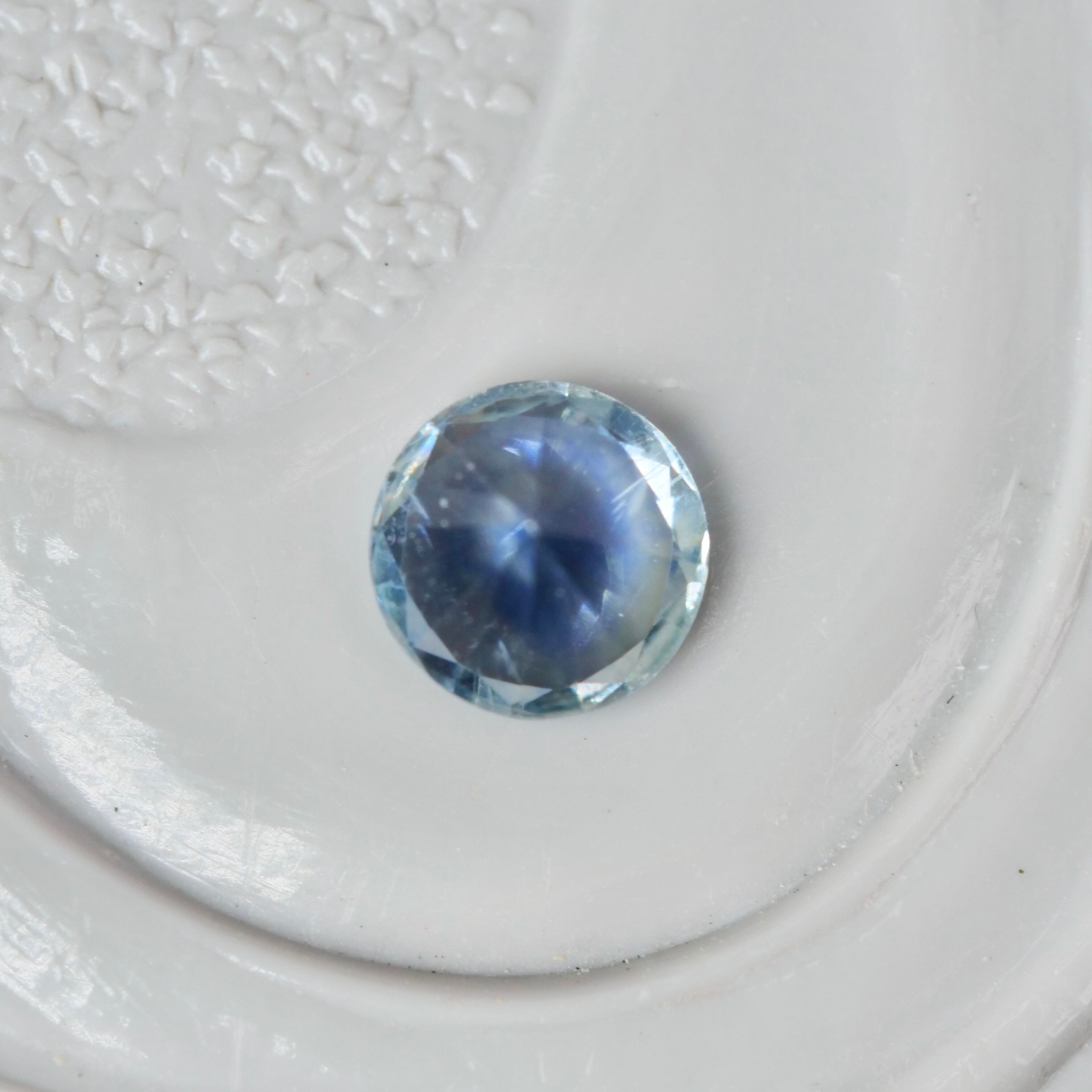 落ち着いたトーンのブルーの中にわずかにグレイッシュカラーを感じる、ラウンドカットのモンタナサファイアです。爽やかで軽やかな輝きを放ち、角度によっては虹色の煌めきも見つけることができる、凛としていて、静かな魅了を秘めたピースです。