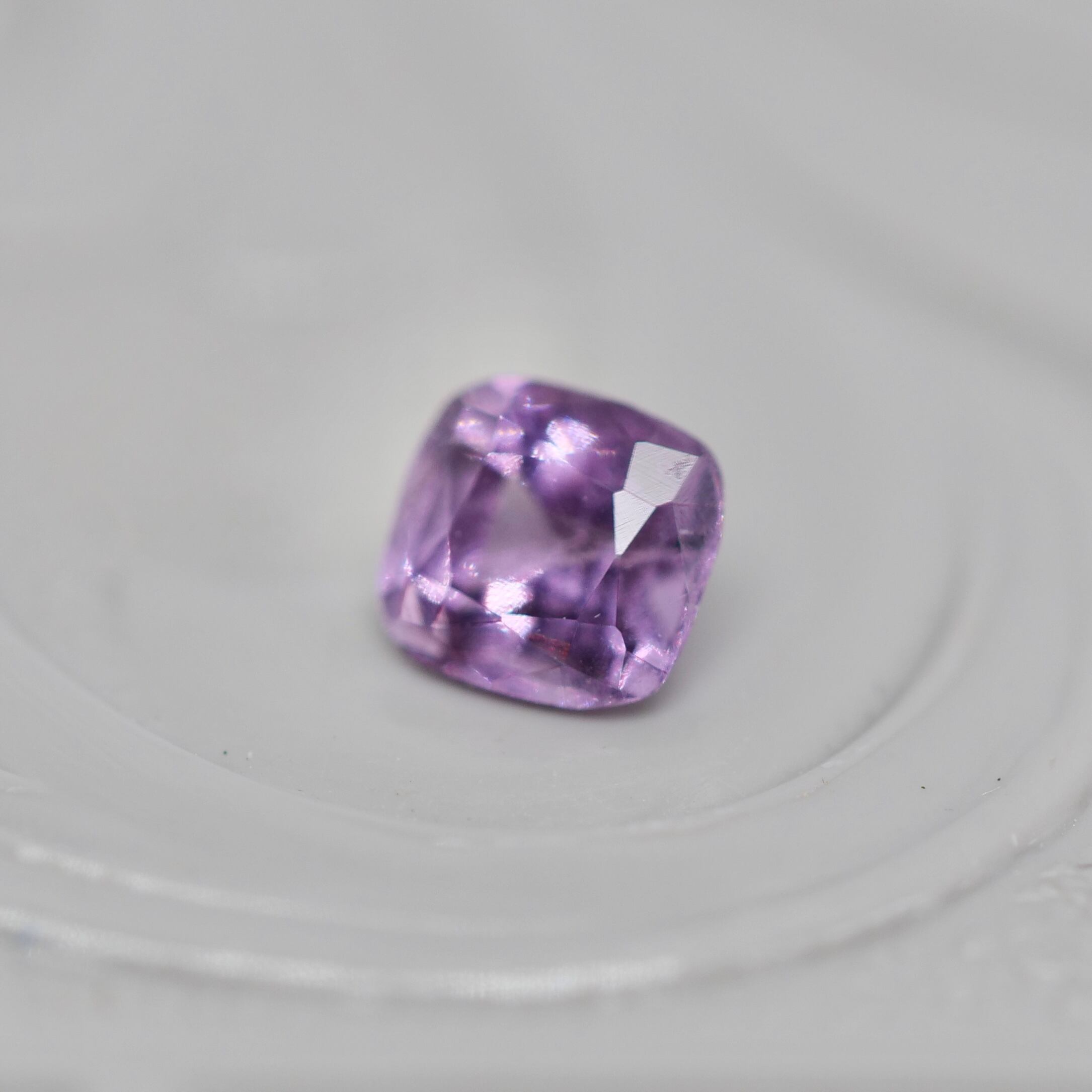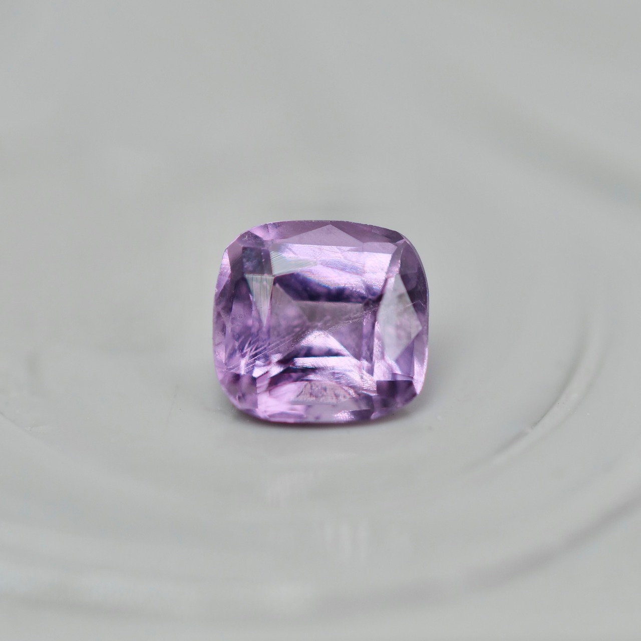 高い透明度と柔らかなラベンダーカラーが美しく煌めく、クッションカットのスピネルです。光を受けると、ベースのラベンダーカラーの中で暖かなピンクカラーのエッジの効いたコントラストある輝きが広がります。