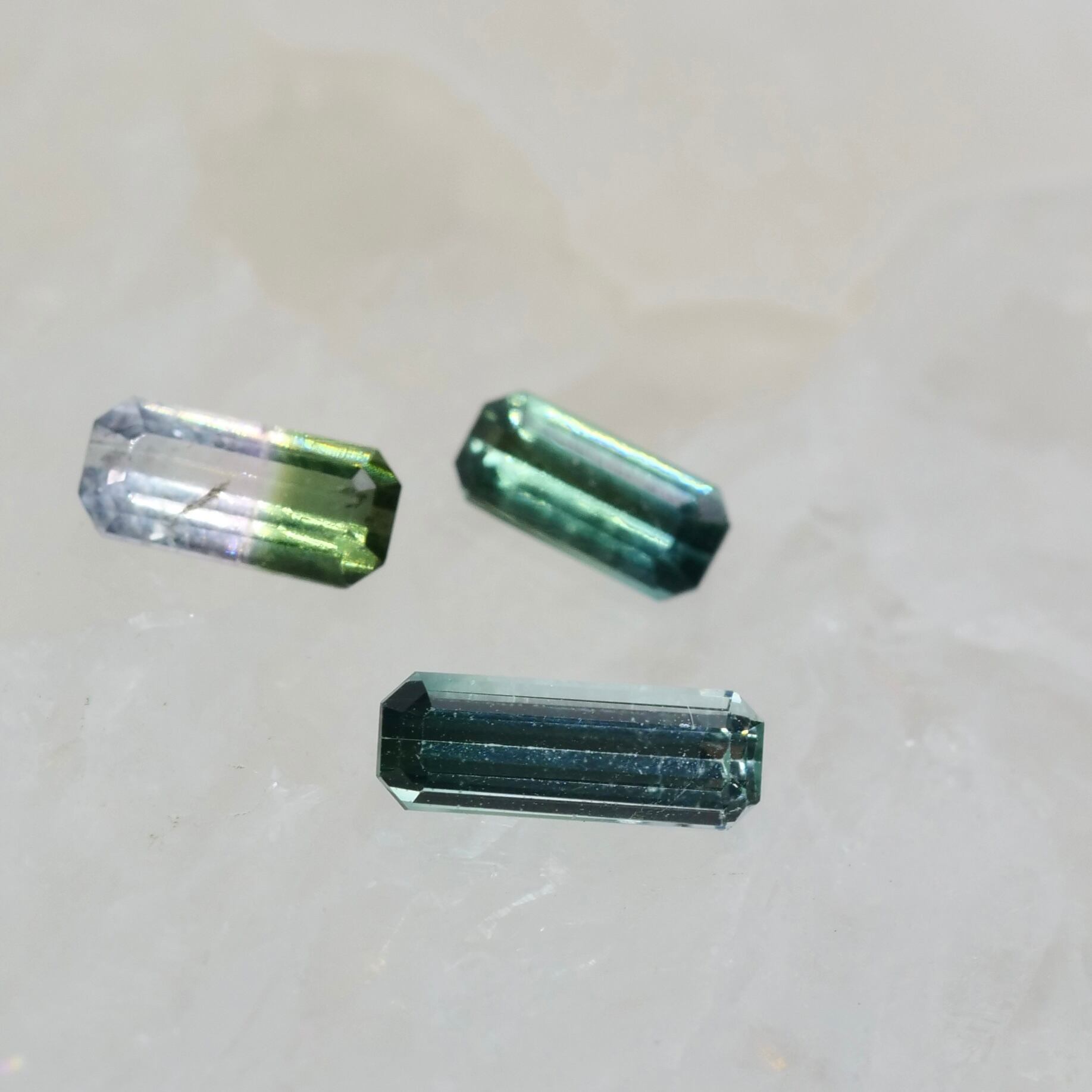 全体を占める鮮やかなブルーグリーンにネオンブルーのアクセントが入ったボディが目を惹く、エメラルドカットのバイカラートルマリンです。