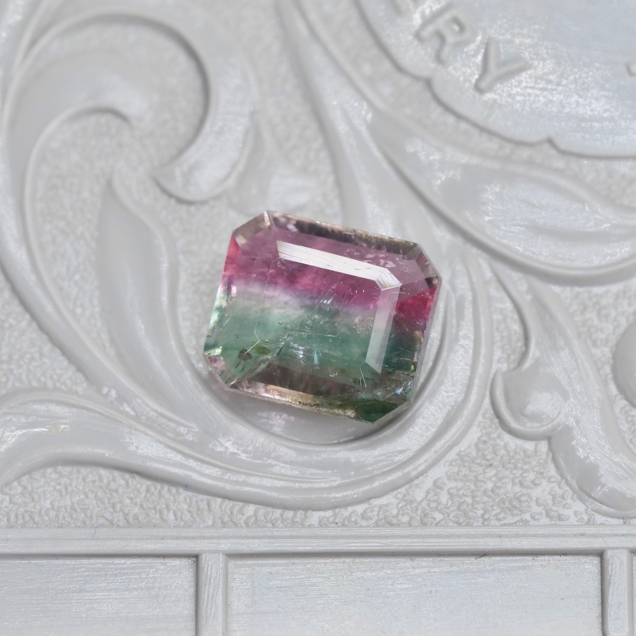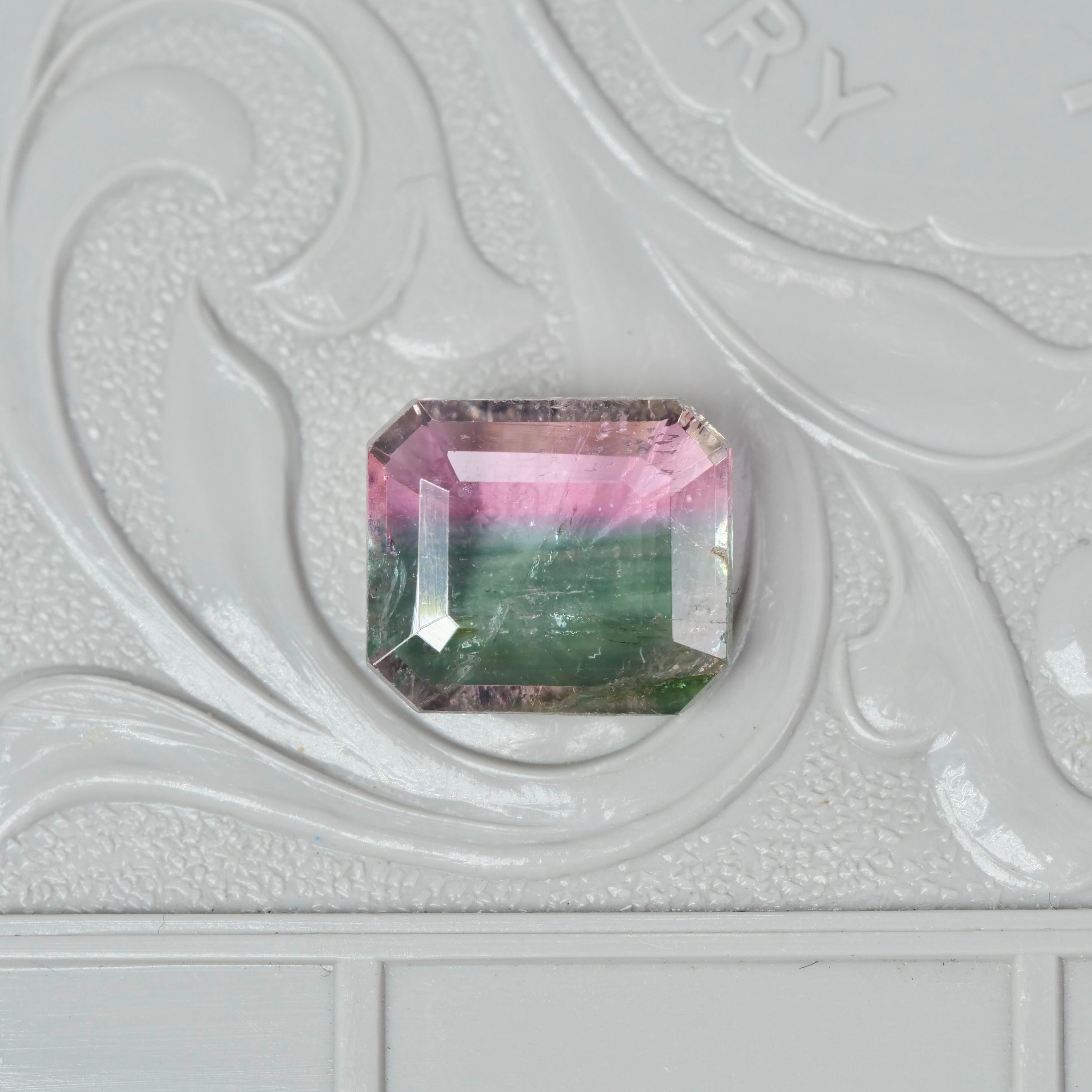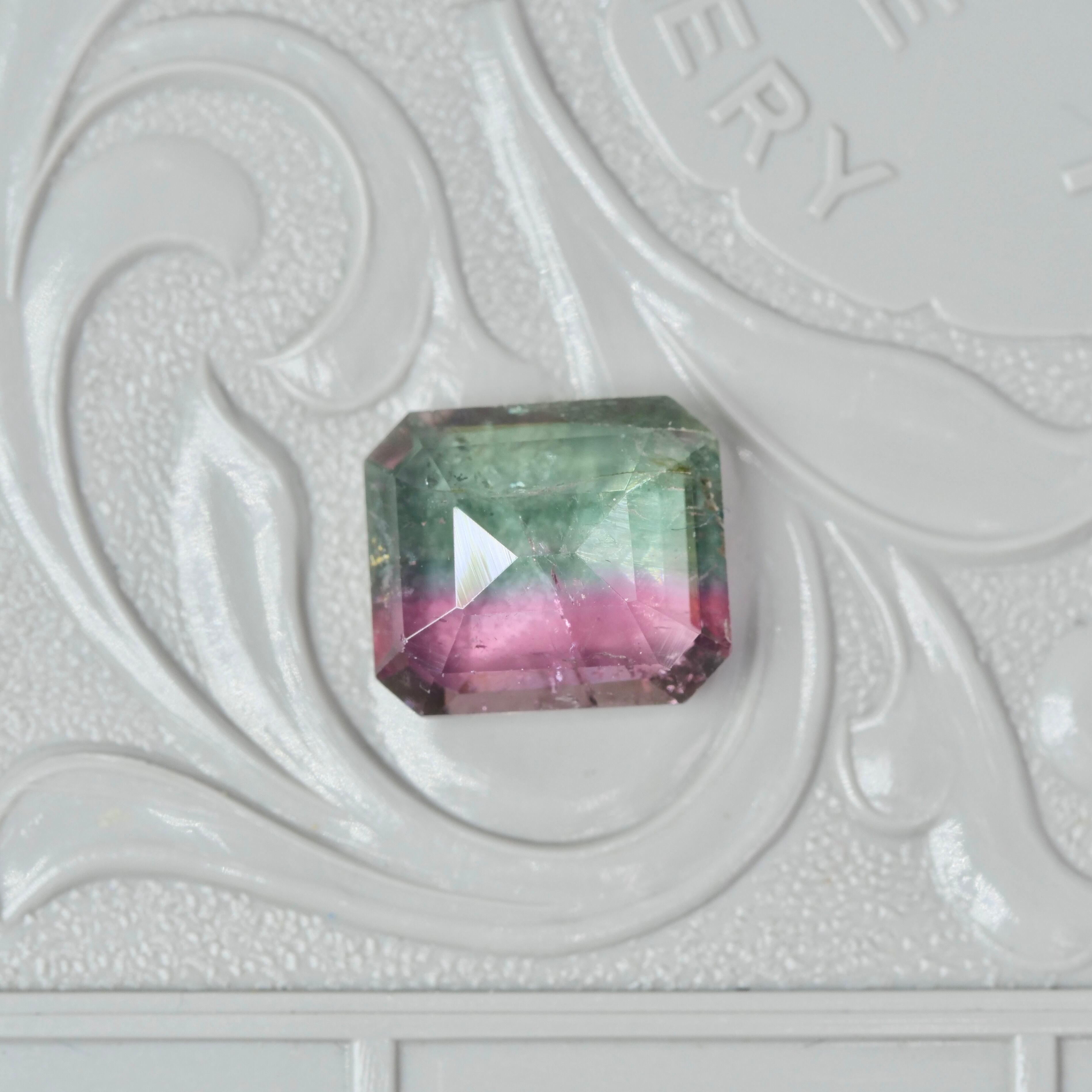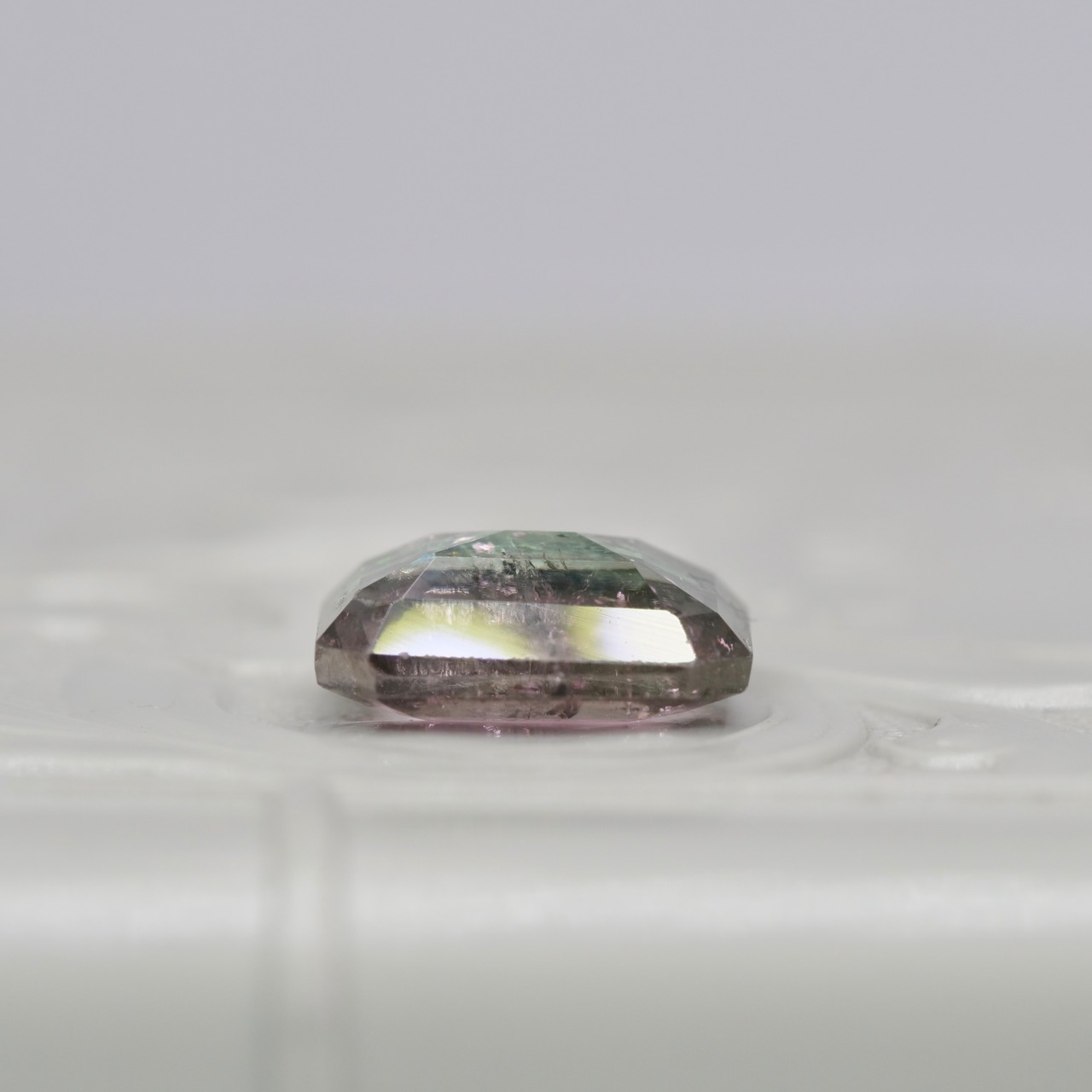 落ち着いたピンクカラーとブルーグリーンの色帯を持つ、エメラルドカットのバイカラートルマリンです。