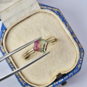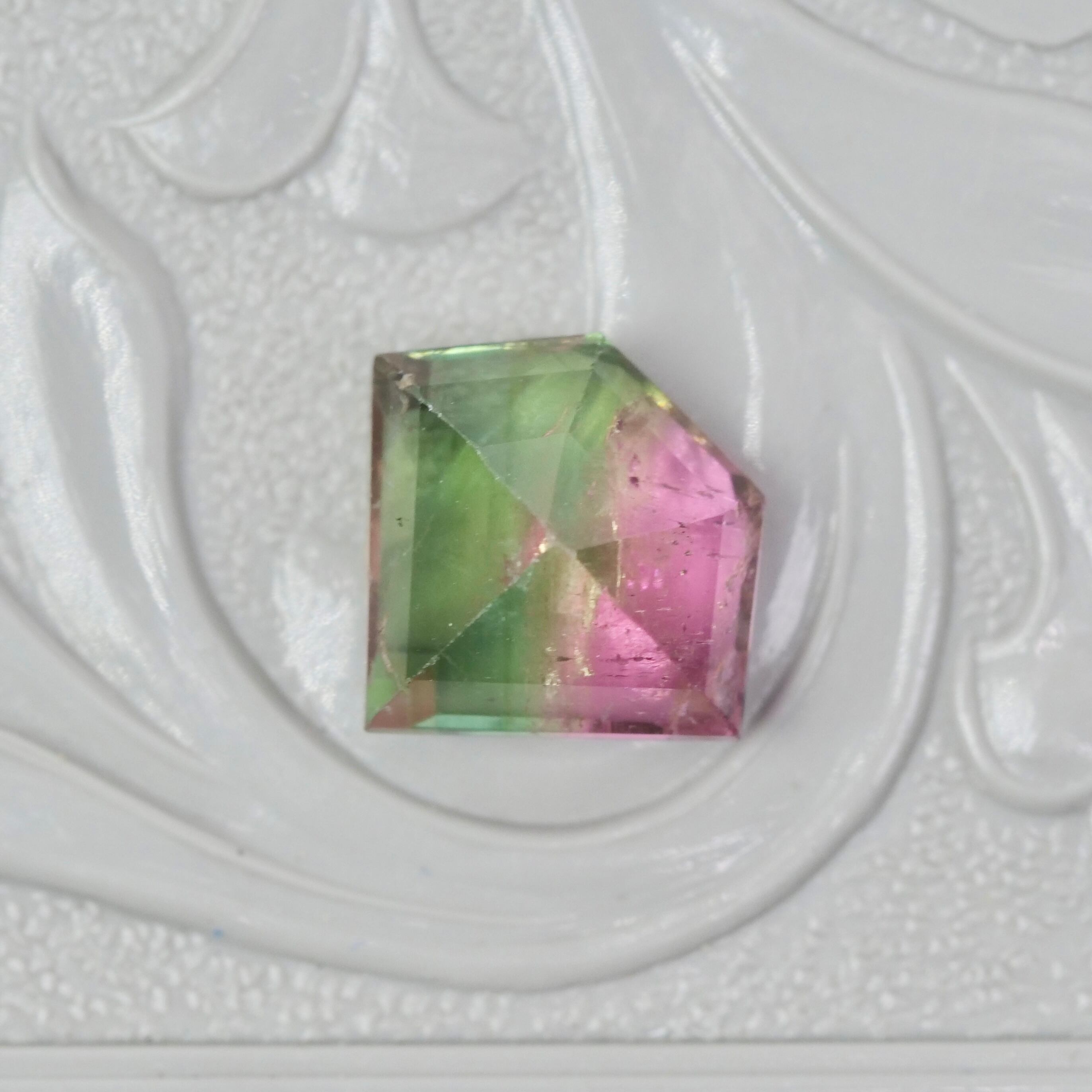 ローズピンクと、オレンジを噛んだピンクが、透明感のあるグリーンを左右で挟んでいる、個性的なダイヤカットのバイカラートルマリンです。