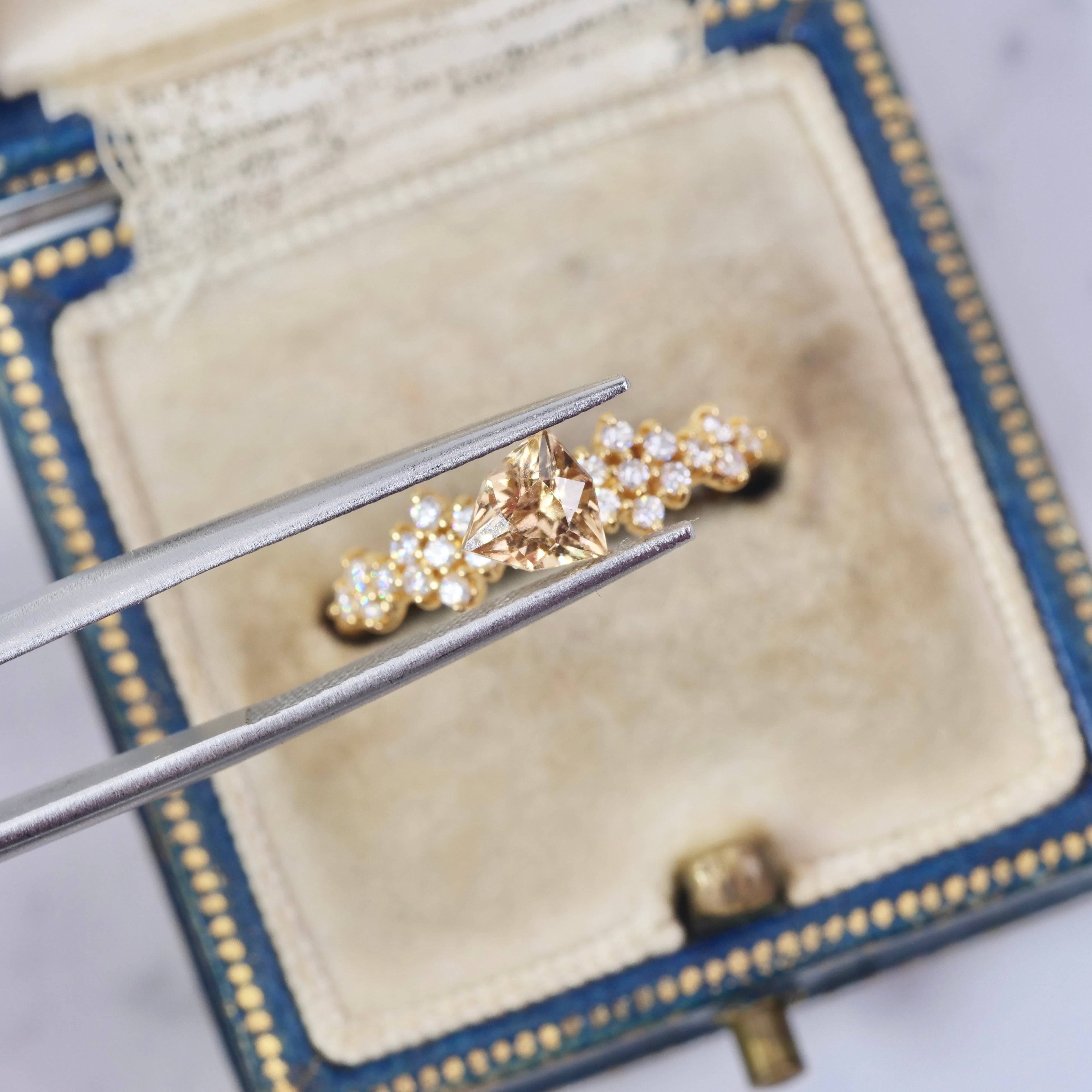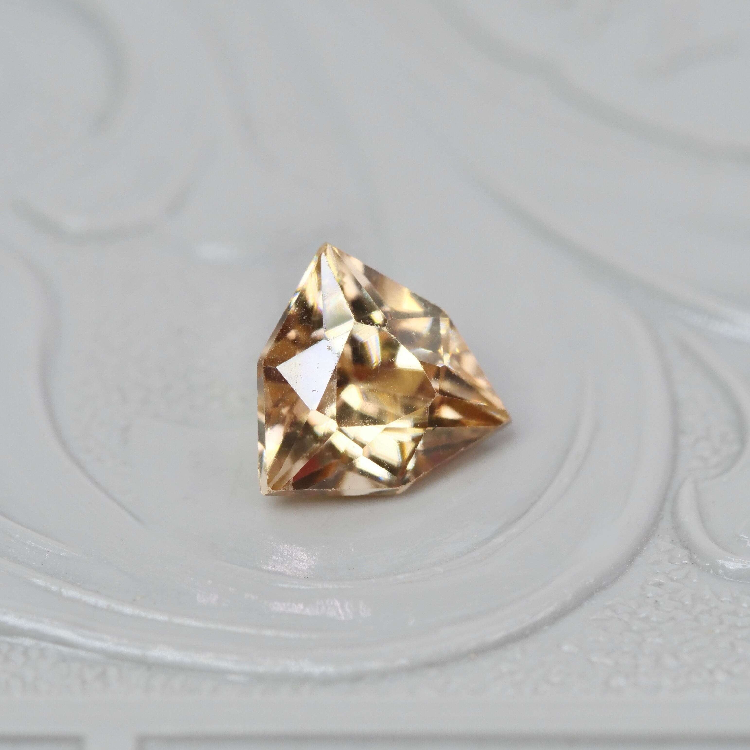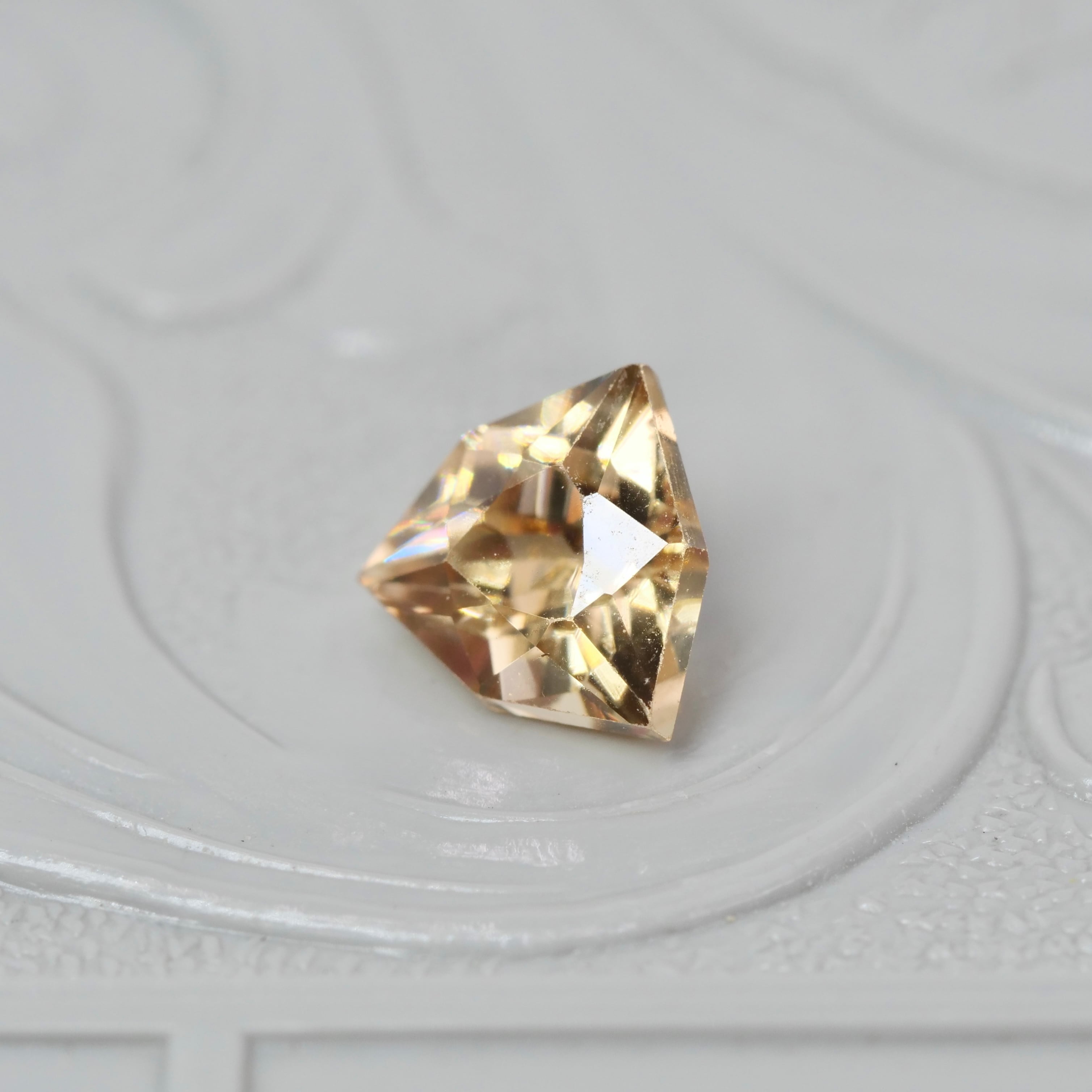 輪郭がシャープですっきりとしたフォルムの、トリリアント特殊カットのジルコンです。ブラウンイエローの落ち着いたカラーの透明感が美しいピースです。