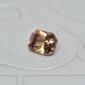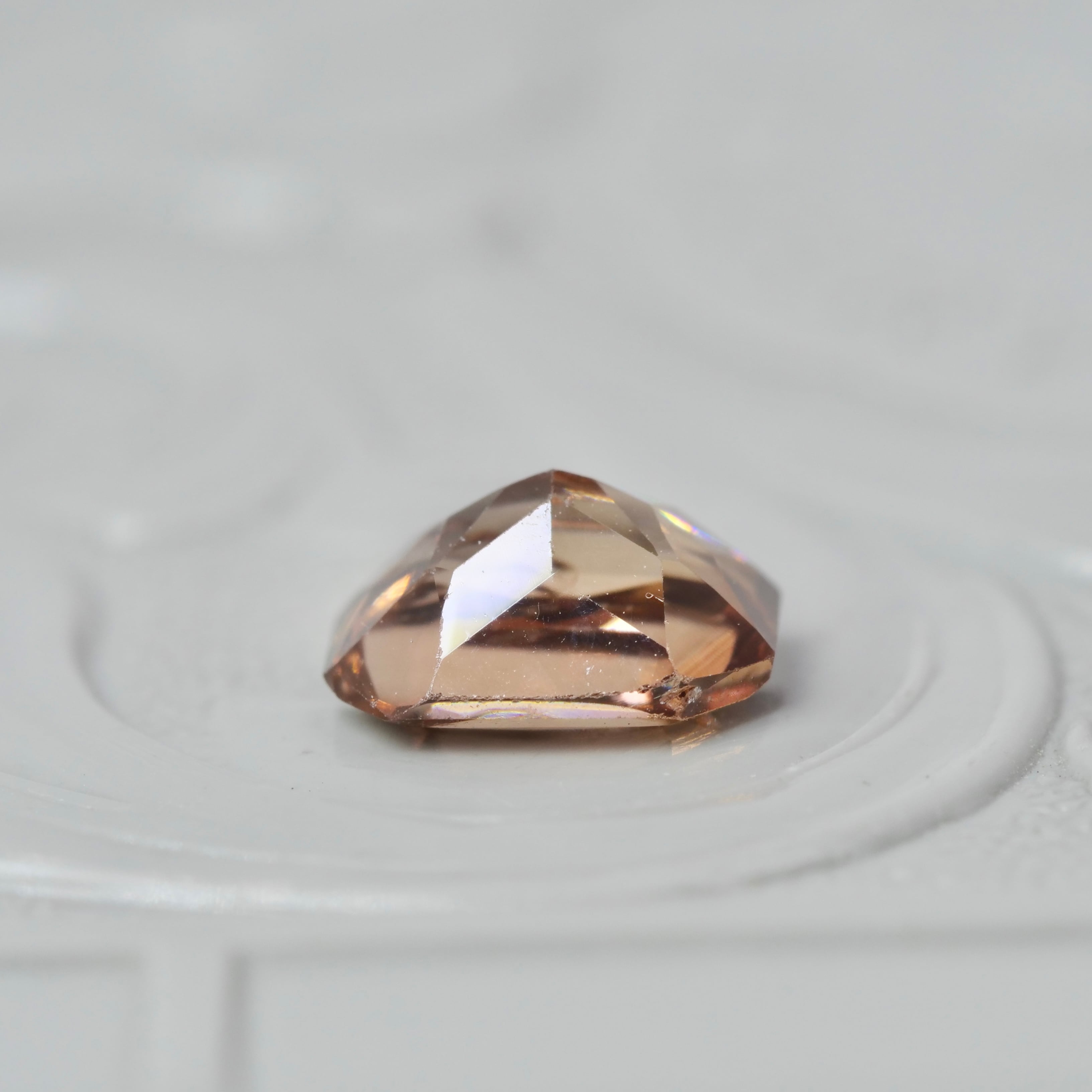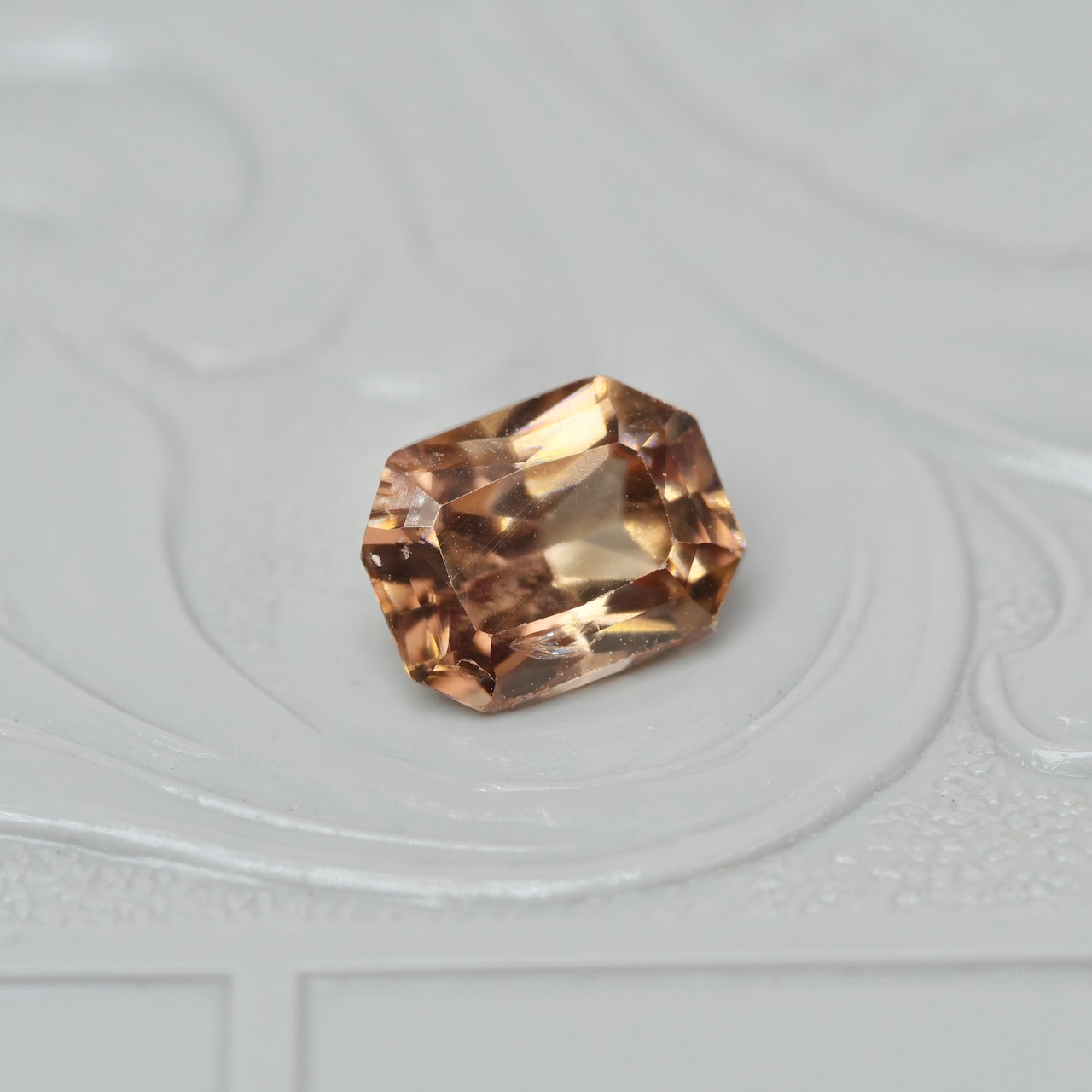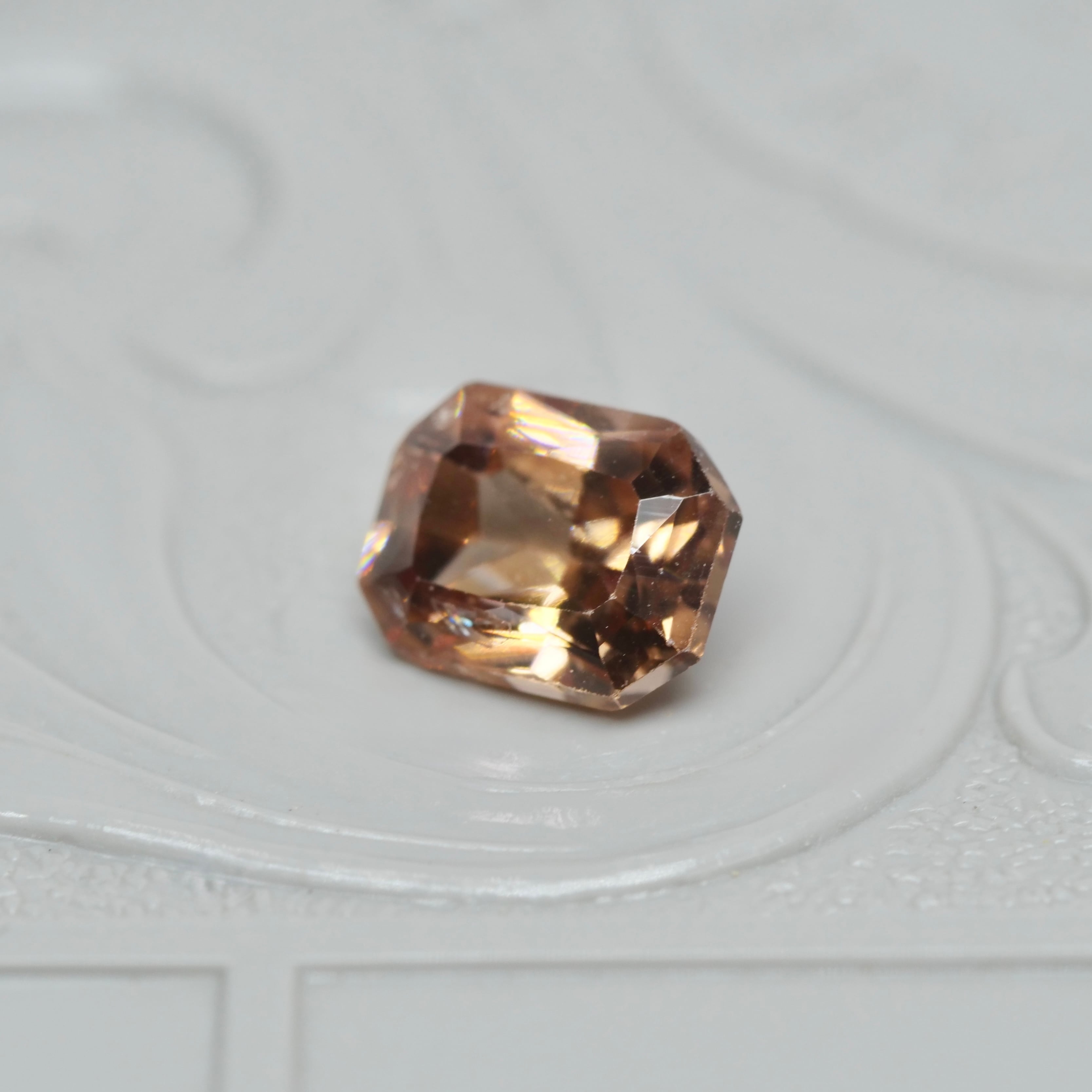 ピンクを噛んだ、温かみのあるブラウンの透明感が美しい、オクタゴンカットのジルコンです。内部の一部に、角度によって光を反射し、小さく虹色にきらめいて見える箇所があります。