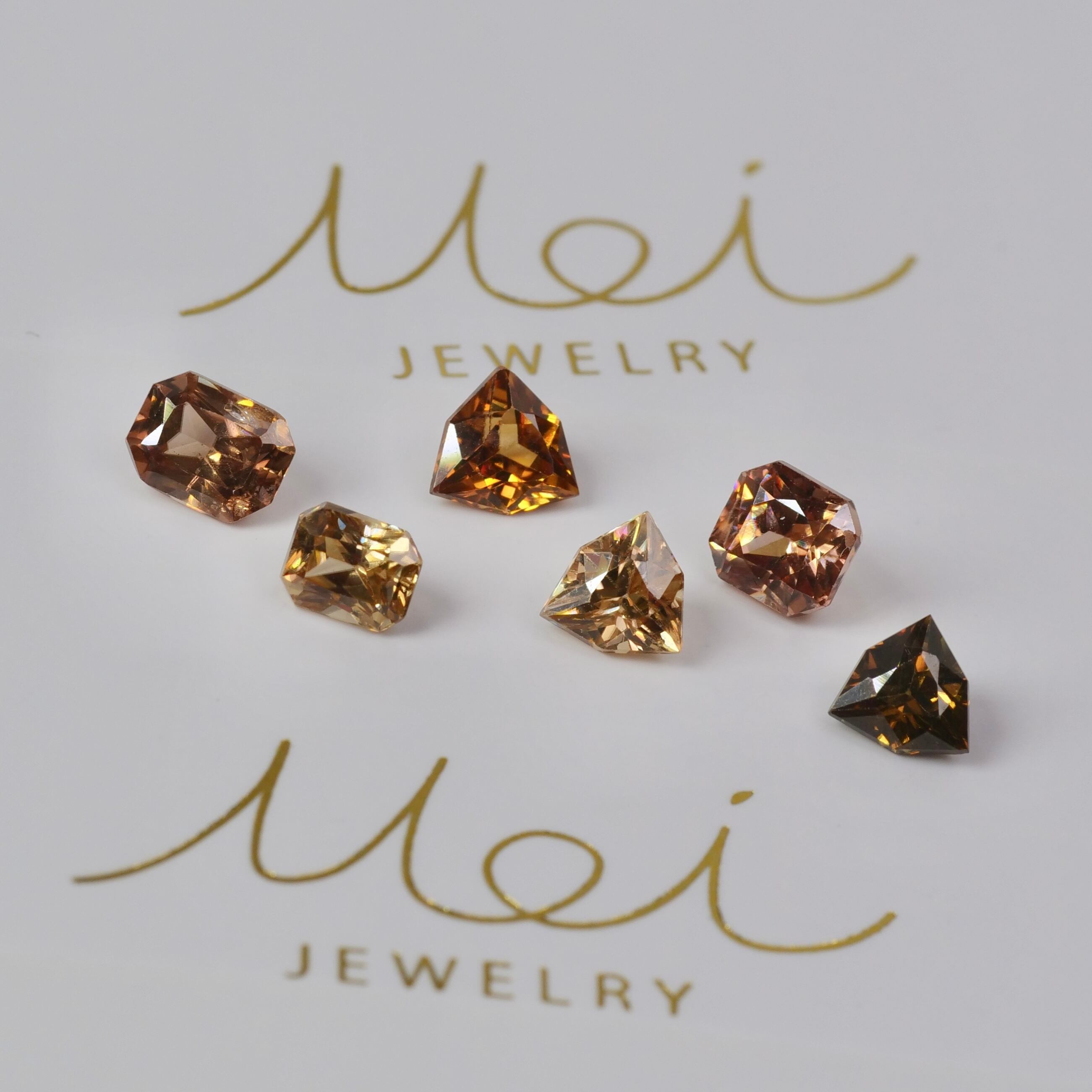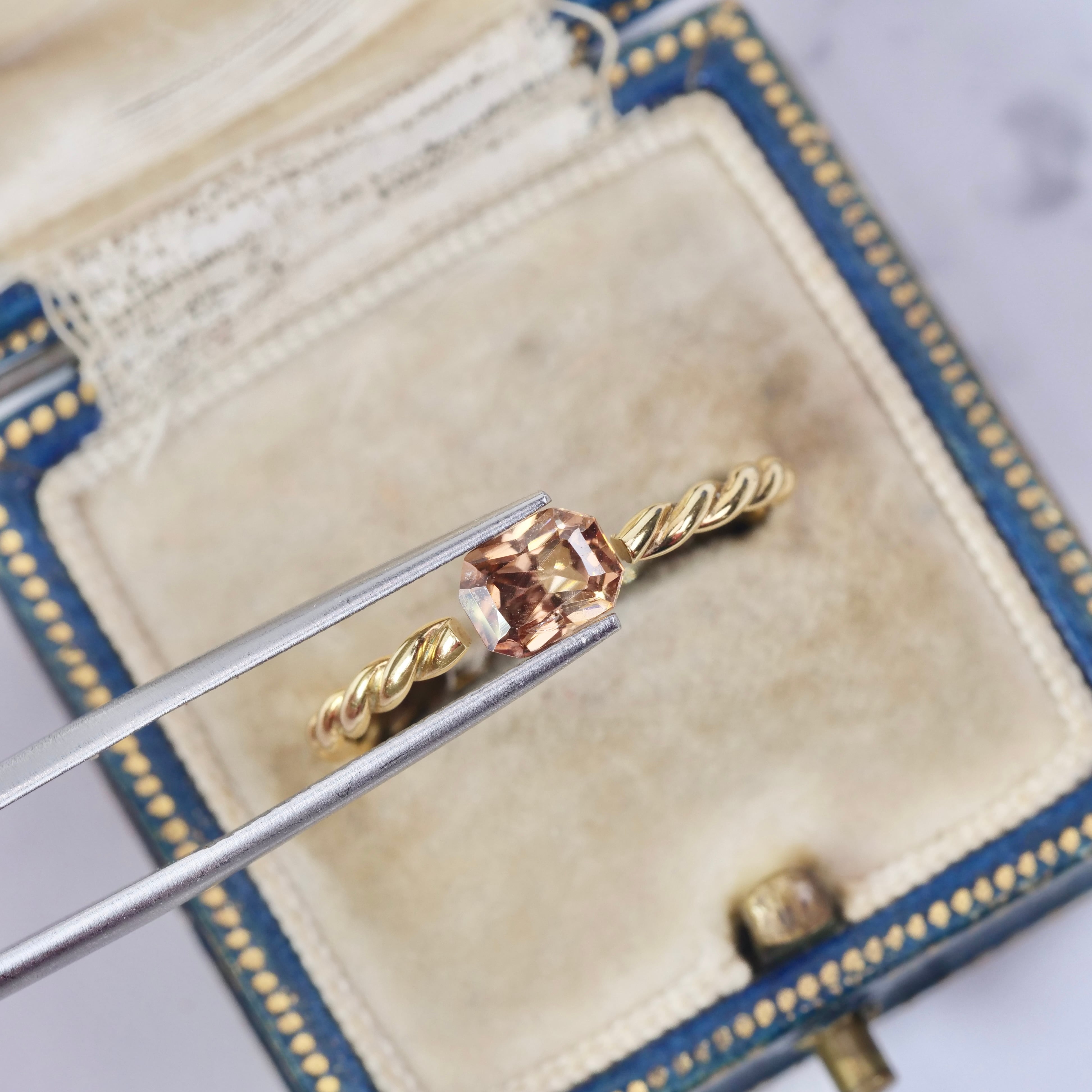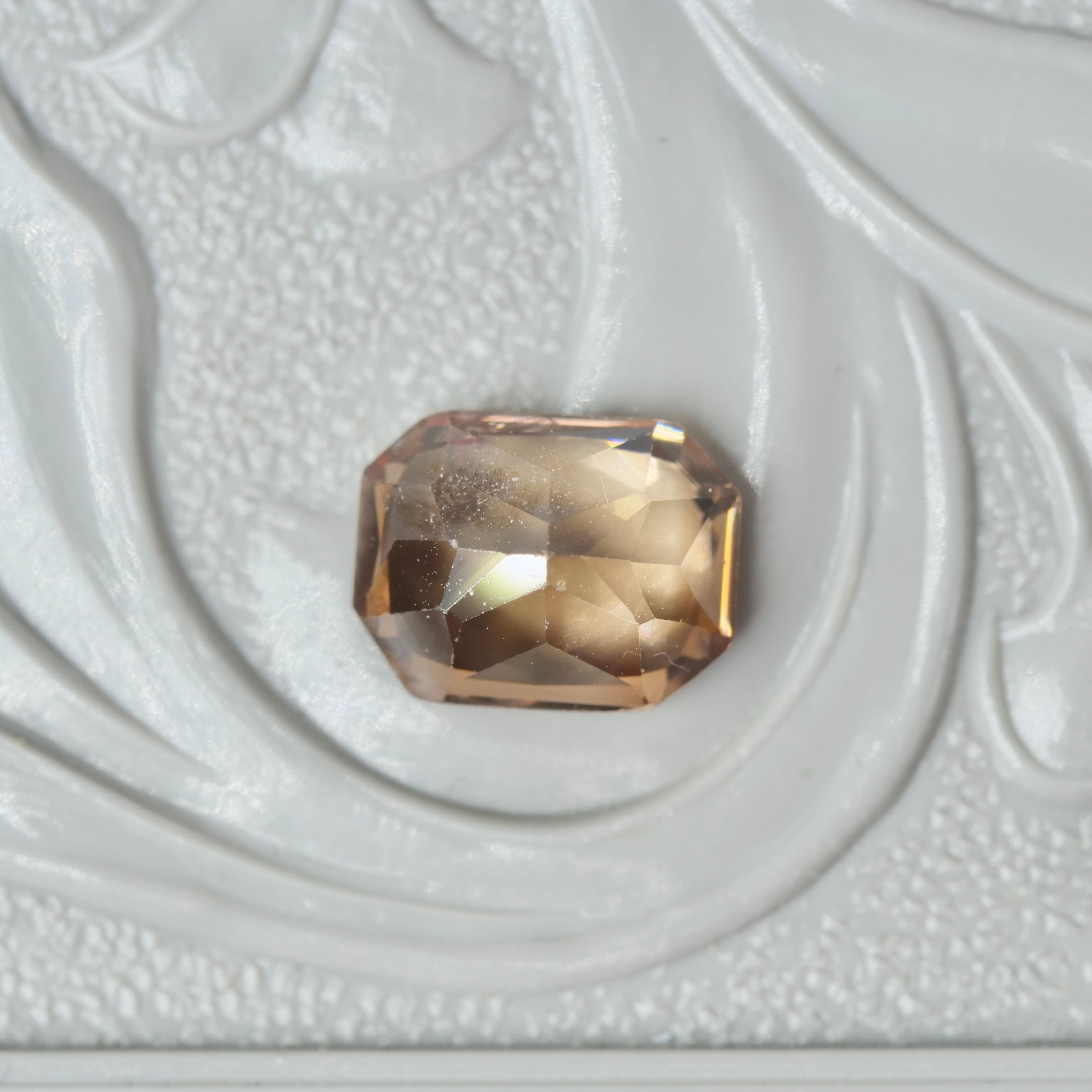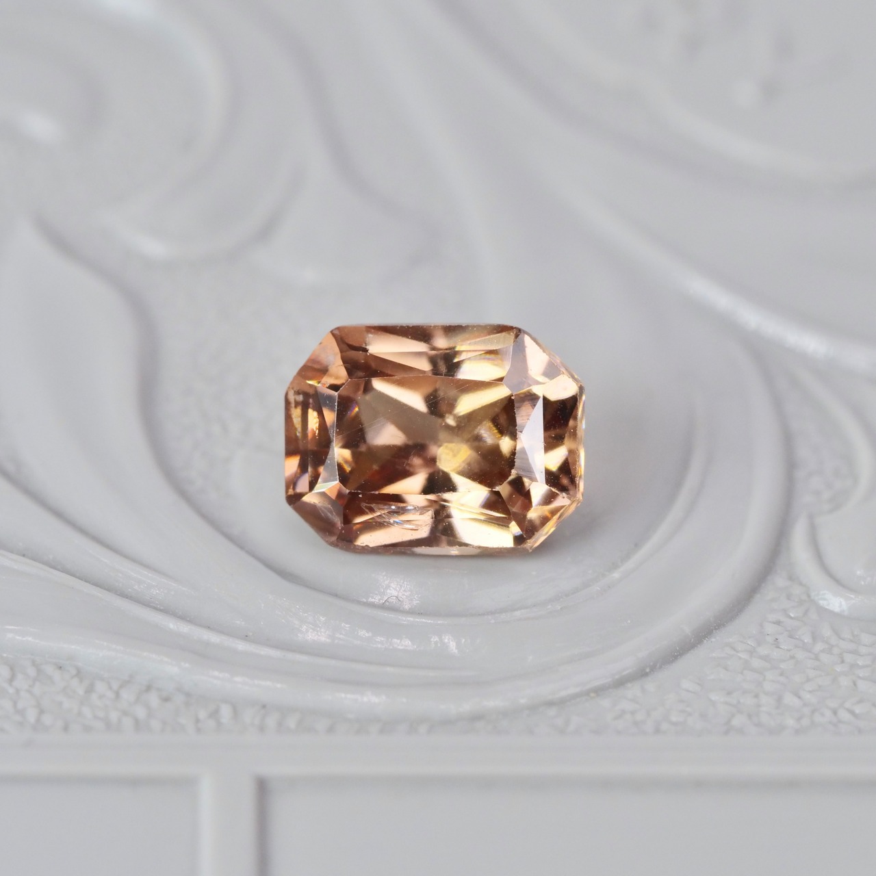 ピンクを噛んだ、温かみのあるブラウンの透明感が美しい、オクタゴンカットのジルコンです。内部の一部に、角度によって光を反射し、小さく虹色にきらめいて見える箇所があります。