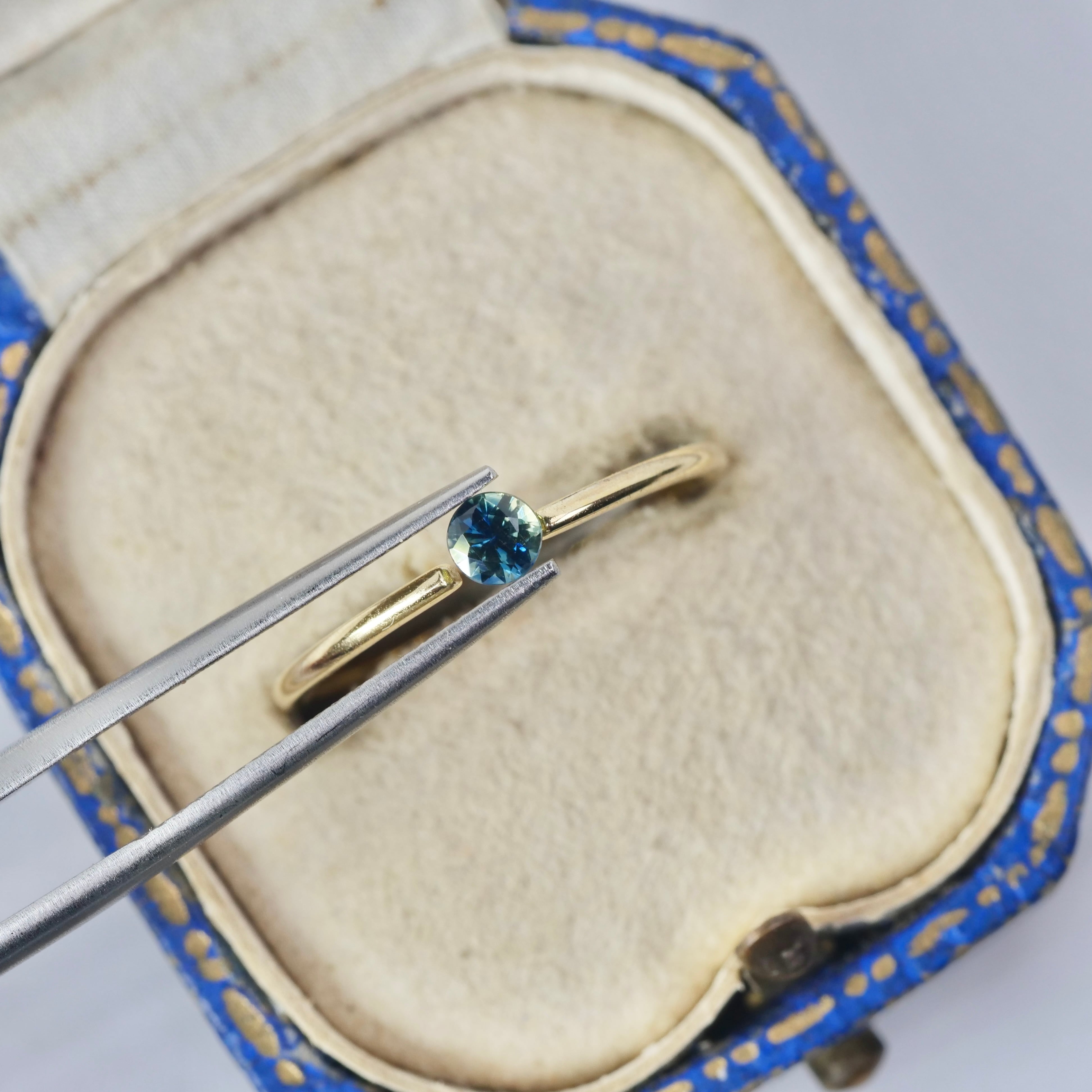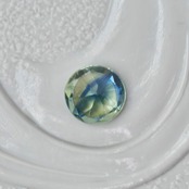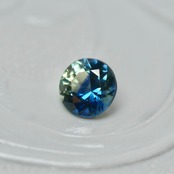 クリアイエローの透明感あるボディの中で、霧がゆらめくようにグリーンブルーの色彩が広がる、ラウンドカットのティールサファイアです。