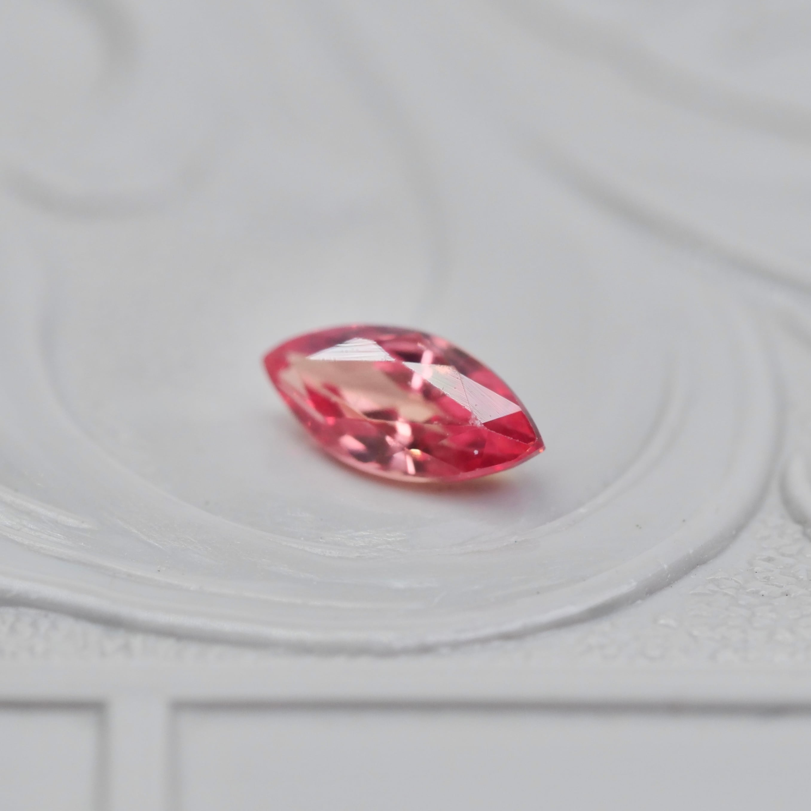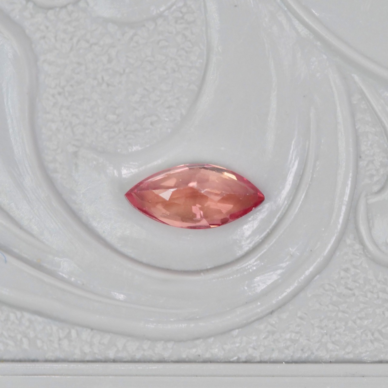 明るく華やかなピンクオレンジカラーの透明感が魅力的な、マーキスカットのパパラチアサファイアです。肉眼で見て目立つ内包物はなく、美しく、スタイリッシュなマーキスカットの中でコントラストの効いた輝きが広がります。