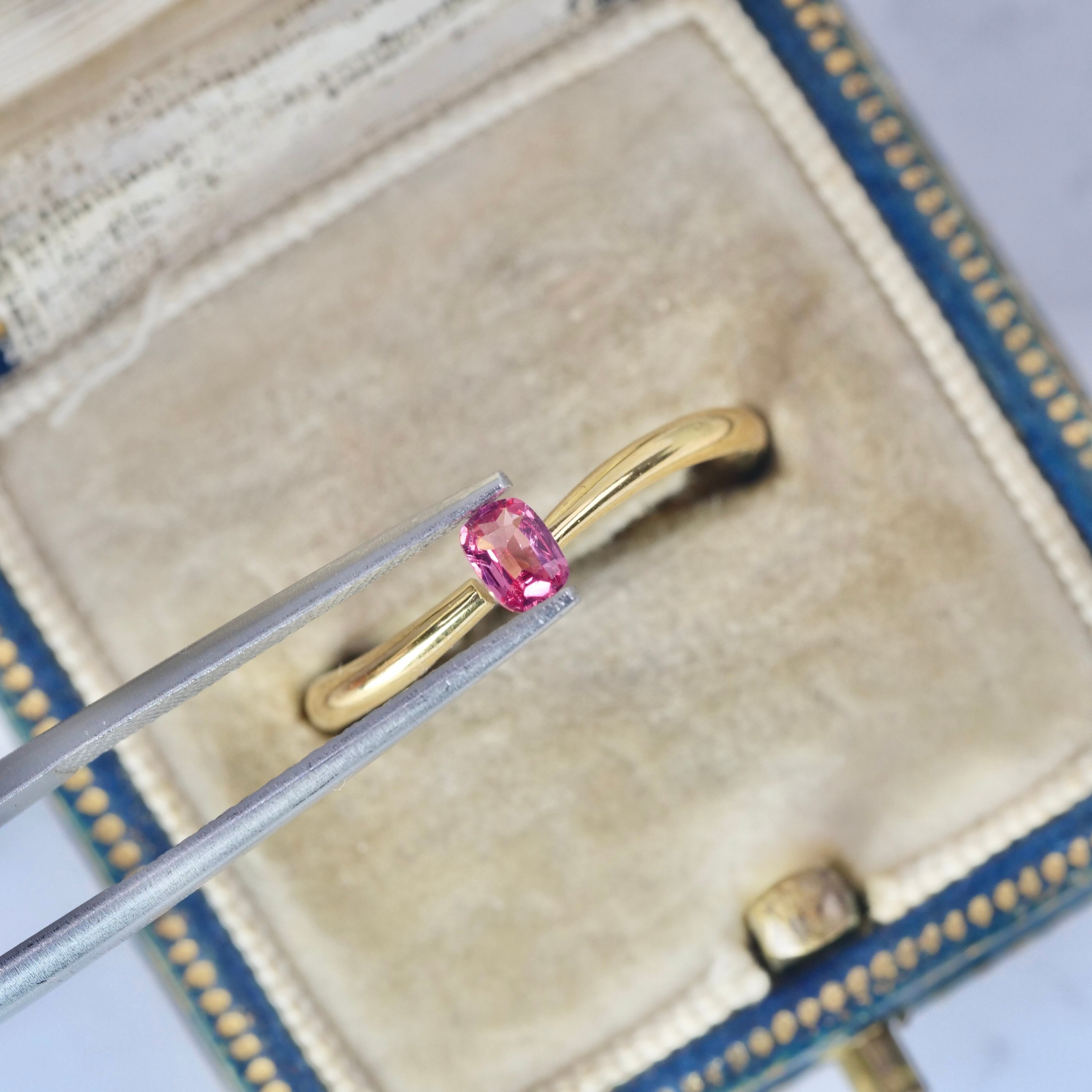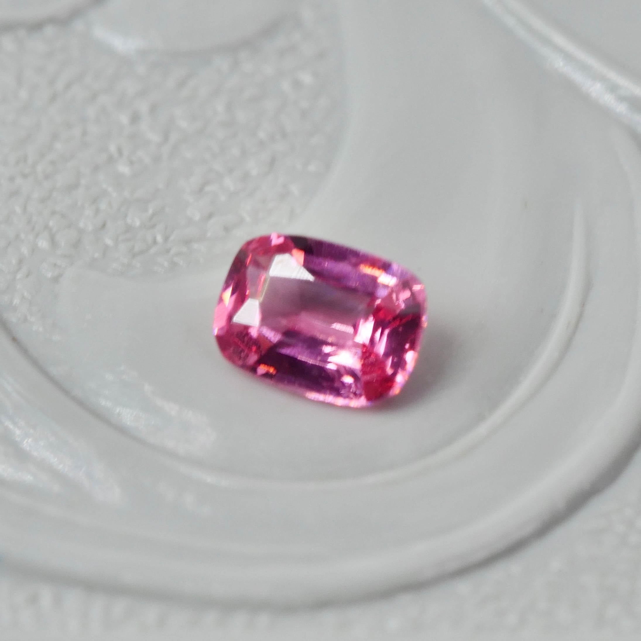 チェリーピンクの大人っぽくも愛らしい雰囲気を纏った、クッションカットのスピネルです。