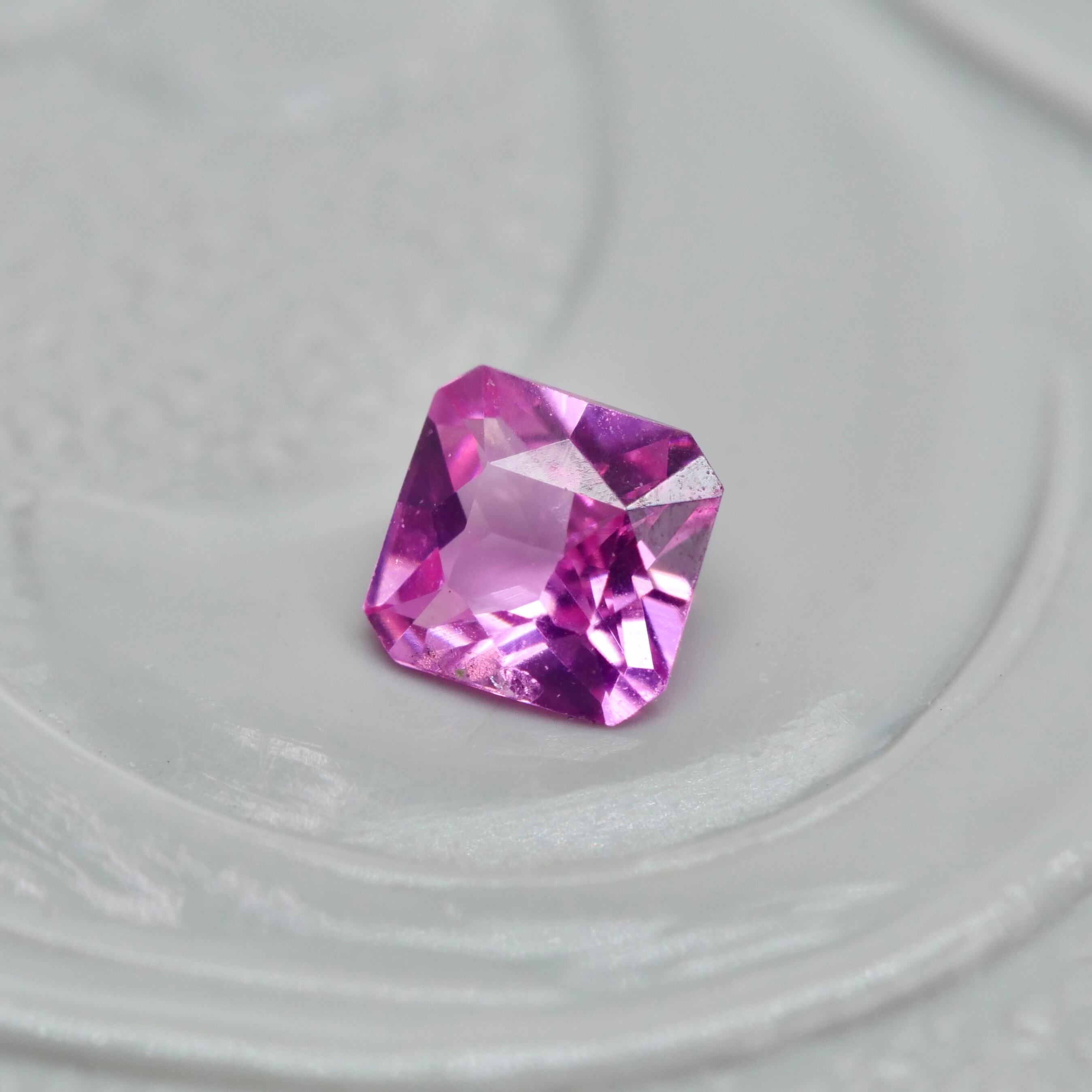 紫を噛んだピンクの明るく愛らしい雰囲気を纏った、エメラルドカットのスピネルです。