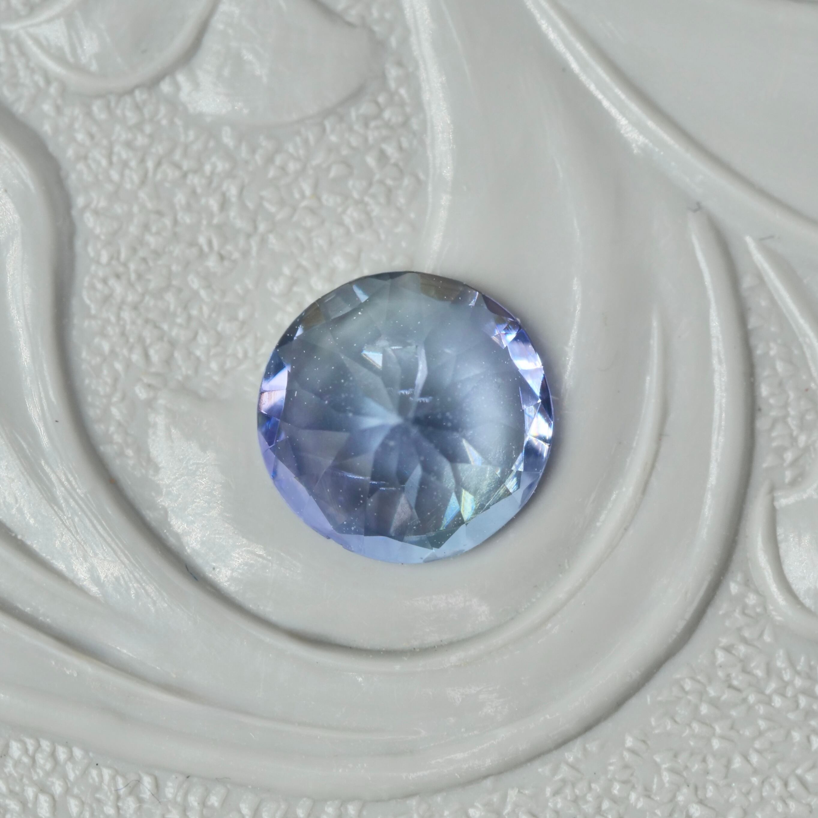 ラベンダーパープルとアイスブルーが柔らかく混じり合う、ラウンドカットのバイカラーゾイサイトです。
