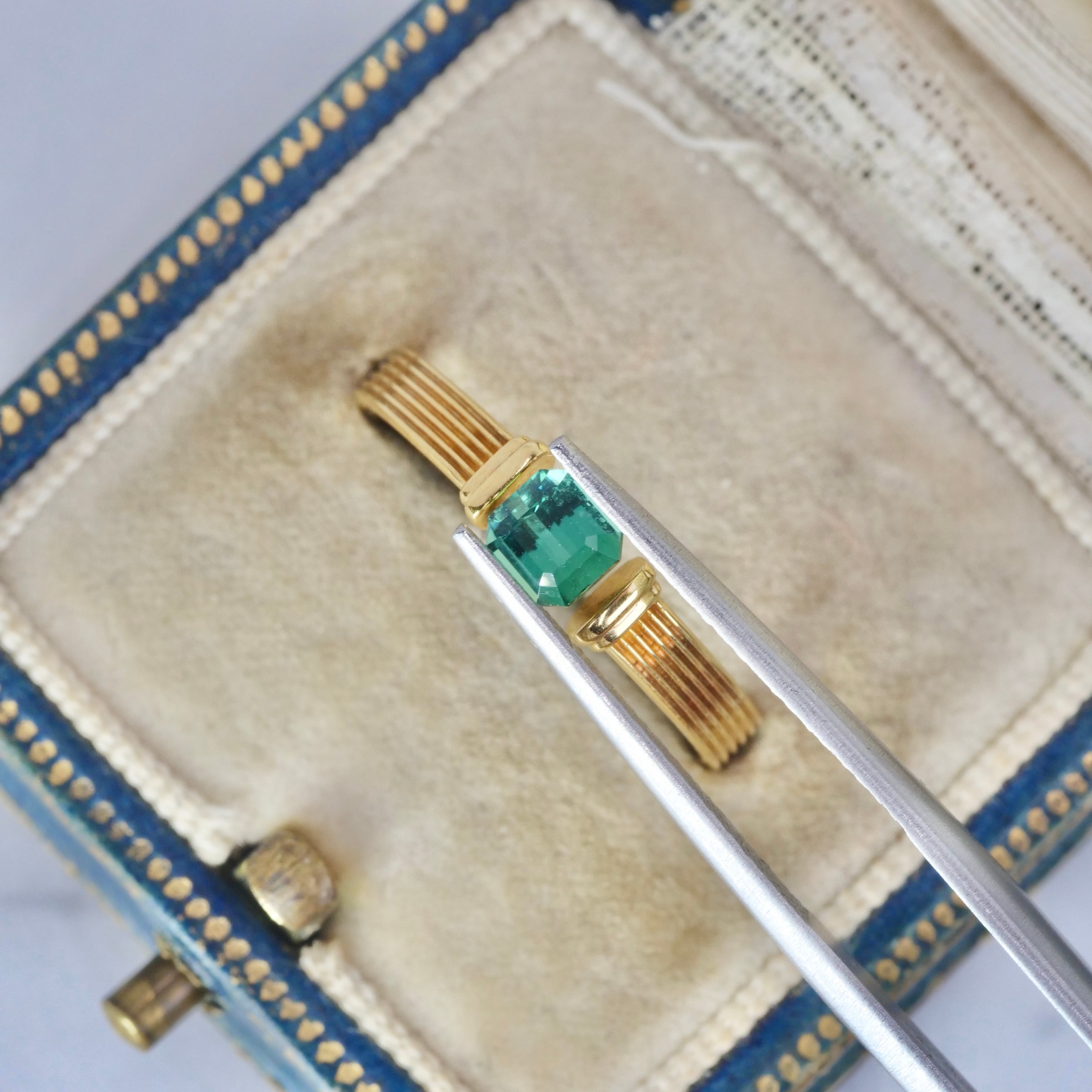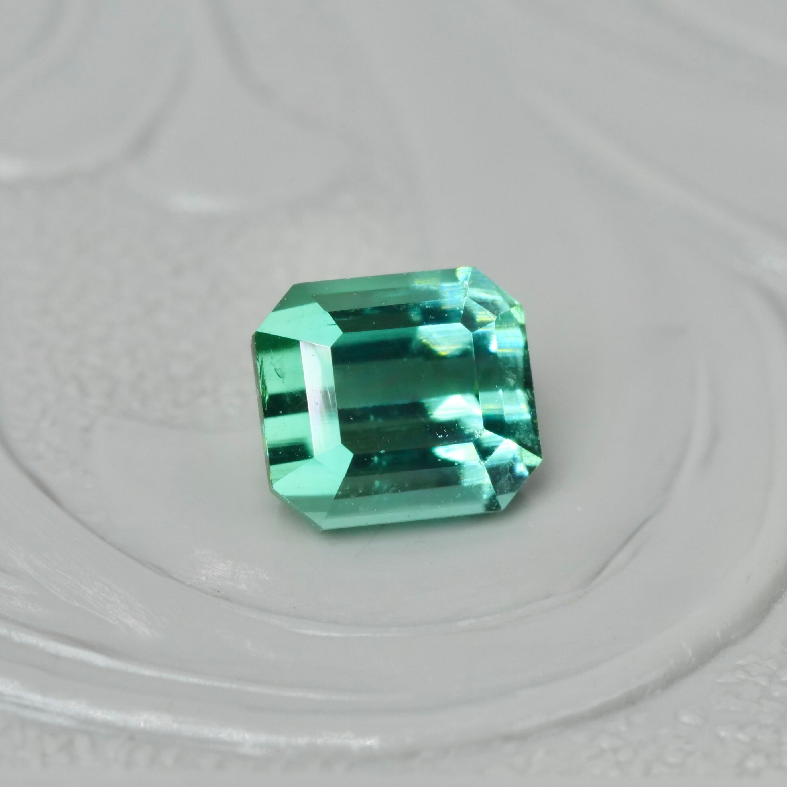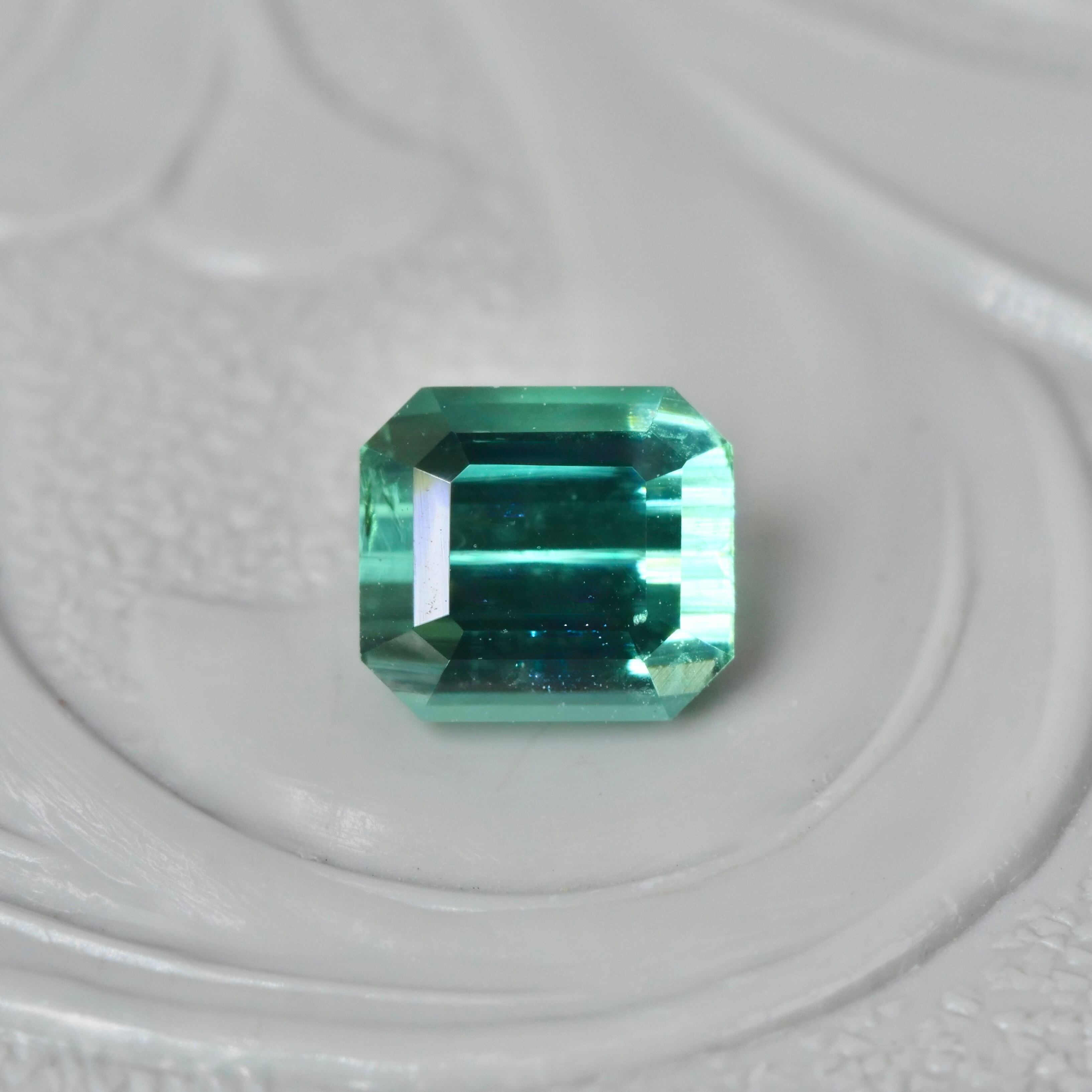スッキリとしたフォルムのカットの中でコントラストの効いた煌めきを見せる、エメラルドカットのラグーントルマリンです。透明感溢れる、深いブルーグリーンが光を受け、ライトグリーンの明るく爽やかな色彩で輝く、色の明暗が魅力的なピースです。