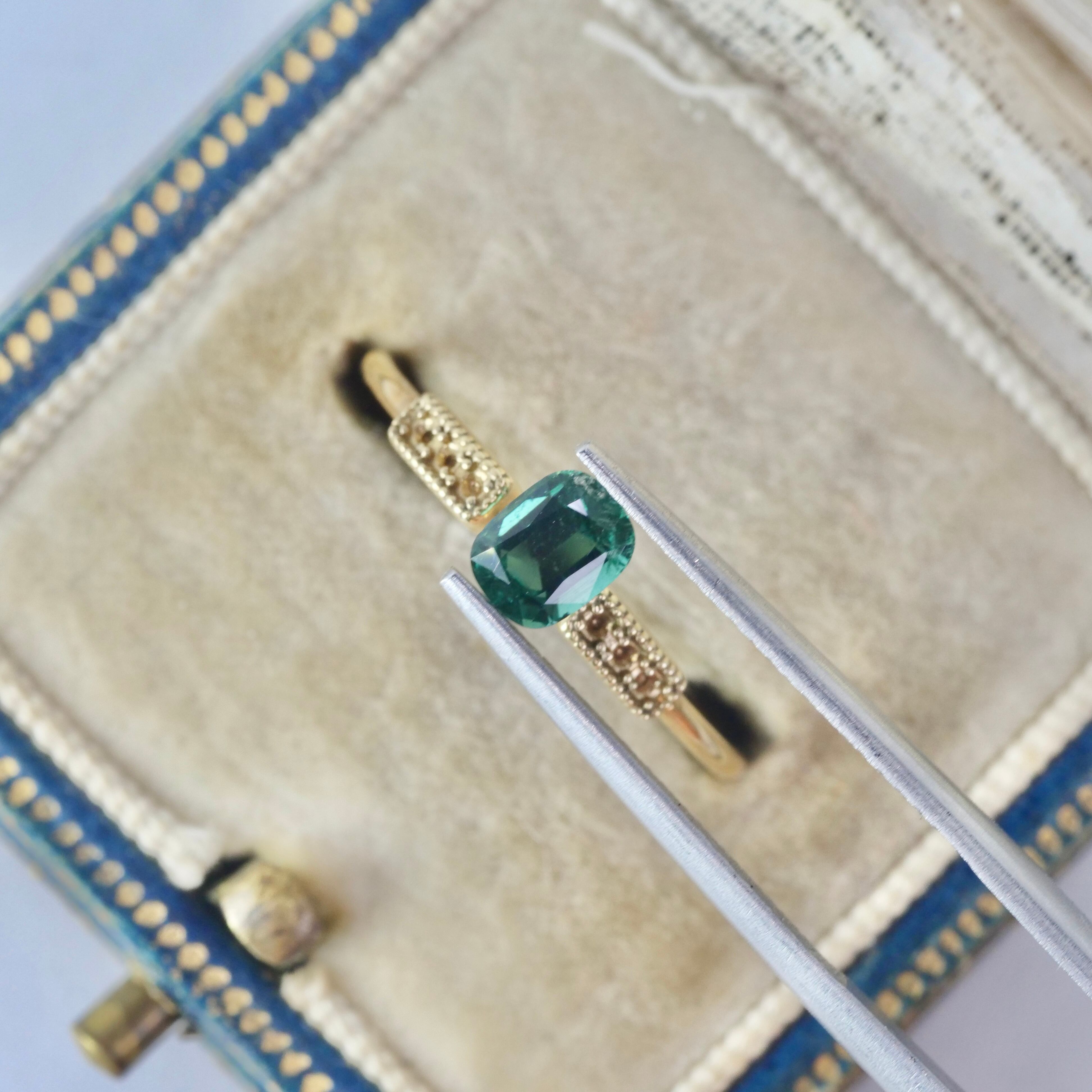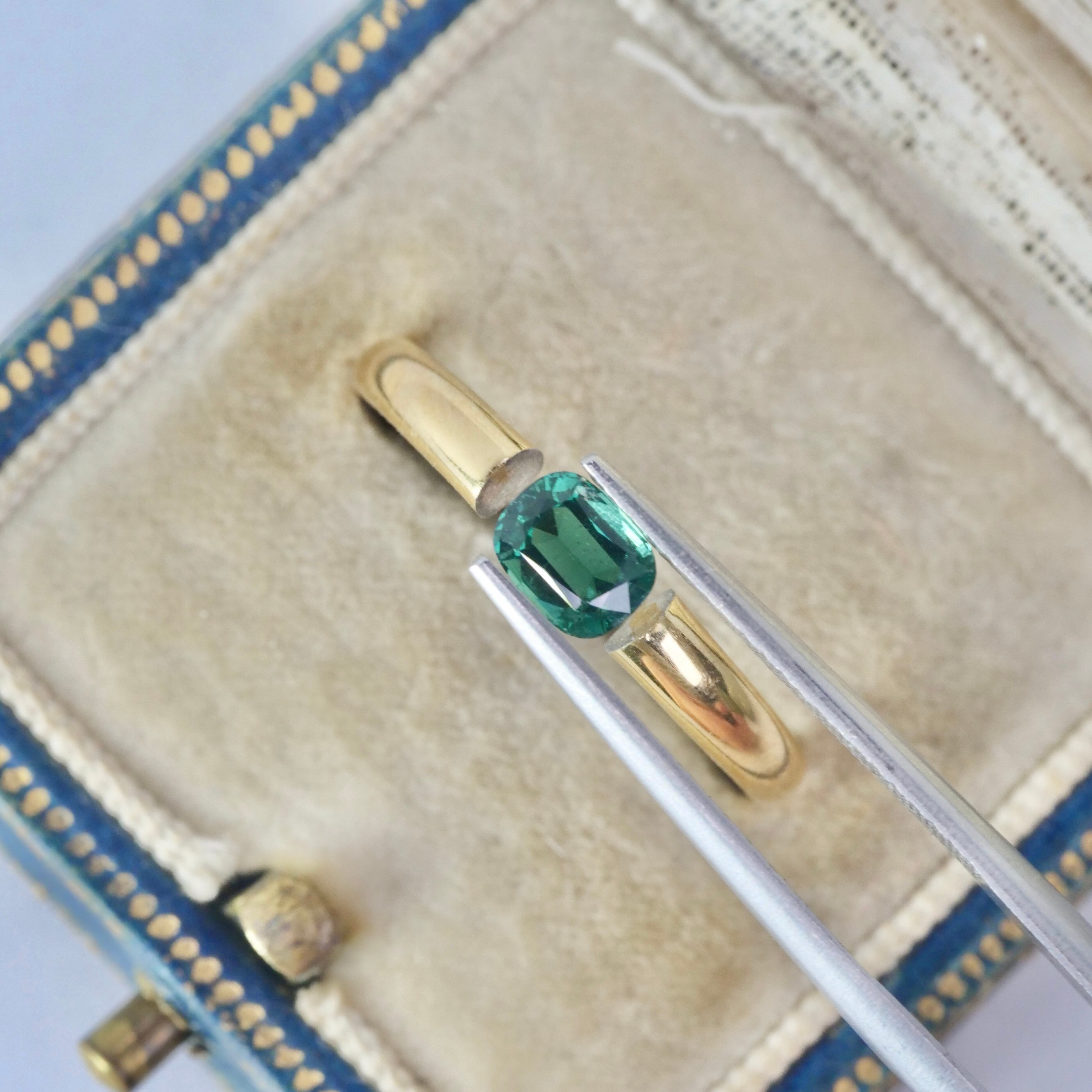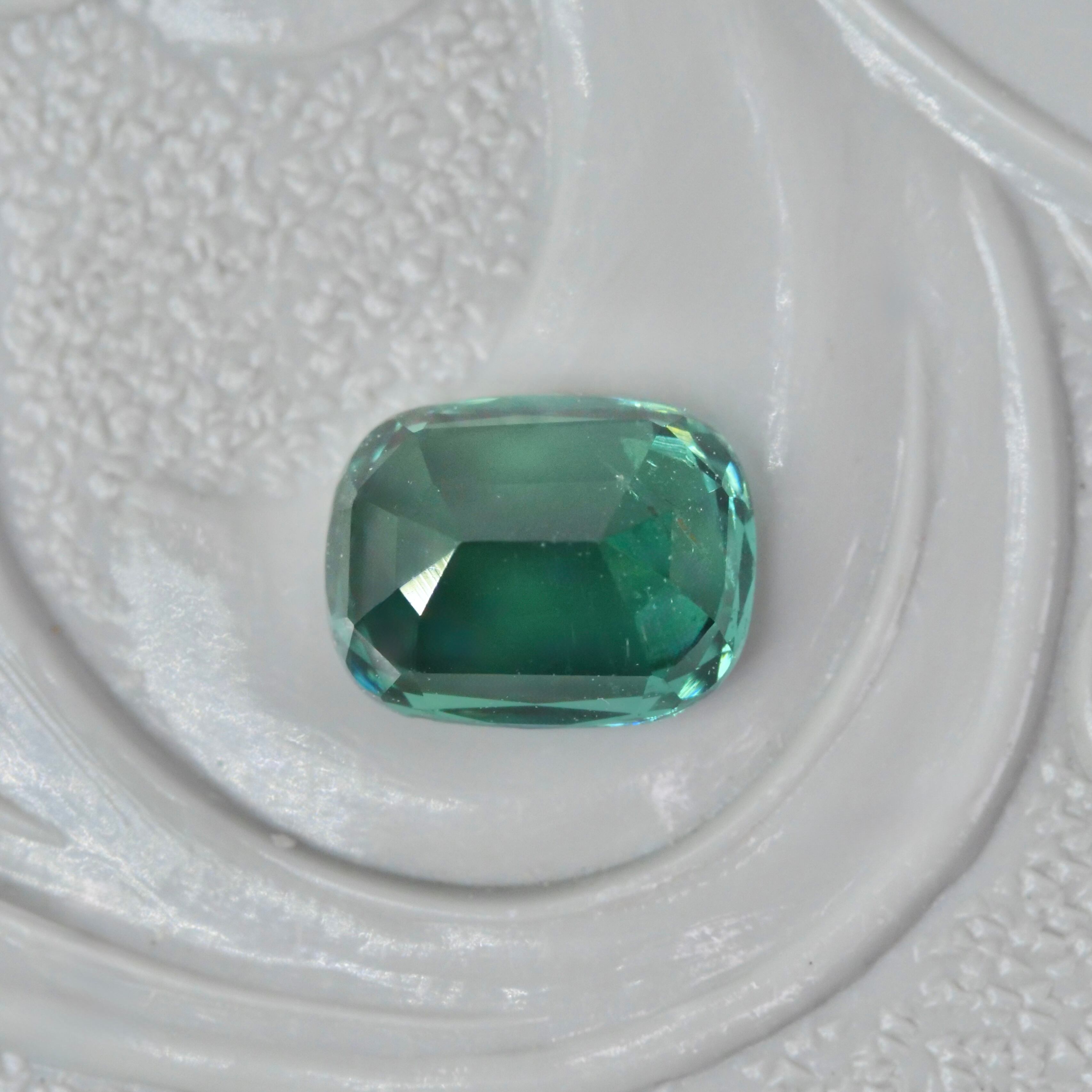 ディープブルーグリーンの濃く深く色づいたカラーから、大人の上品さが漂うクッションカットのラグーントルマリンです。