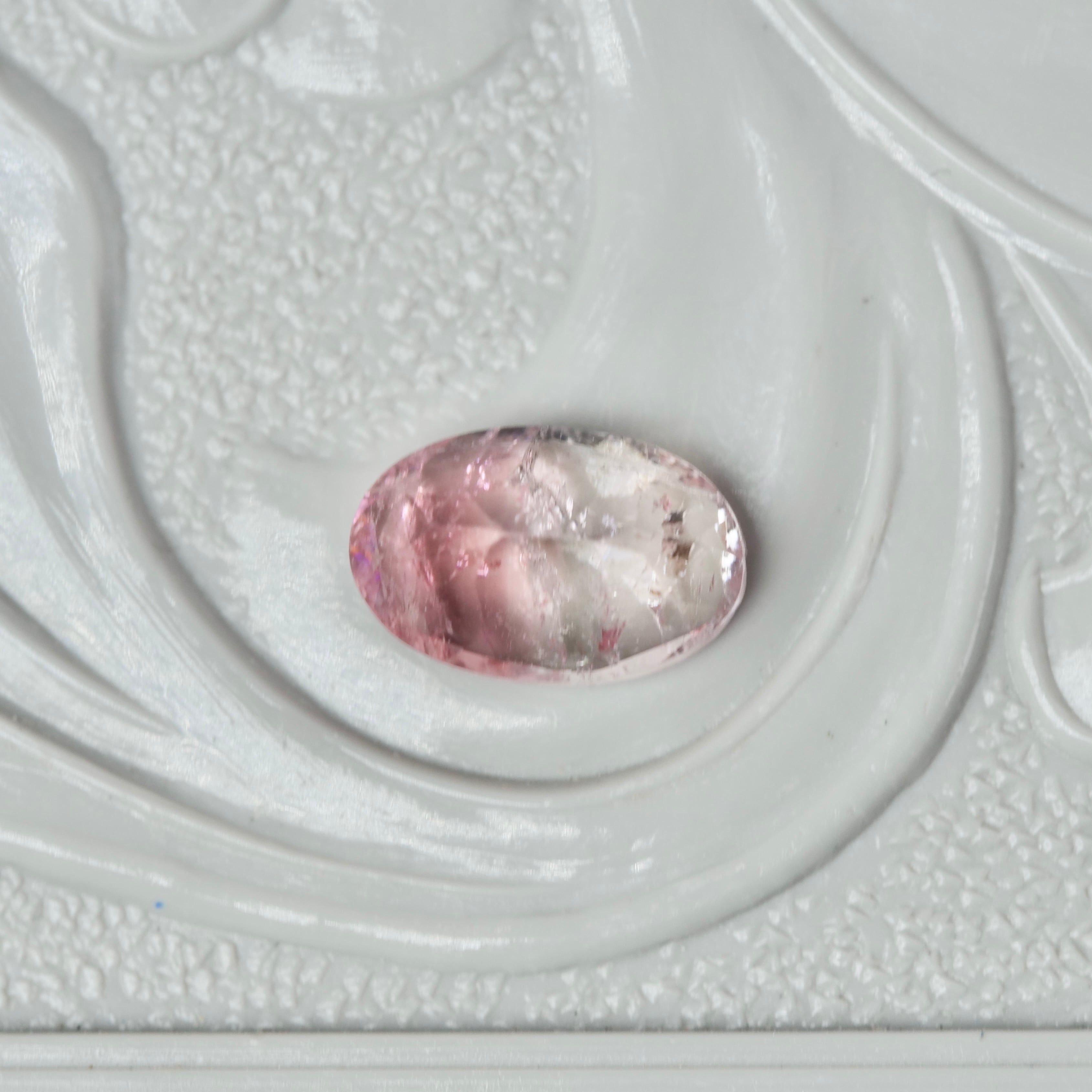 クリアなペールピンクを、あたたかみのあるチェリーピンクが挟み込むオーバルカットのバイカラートルマリンです。