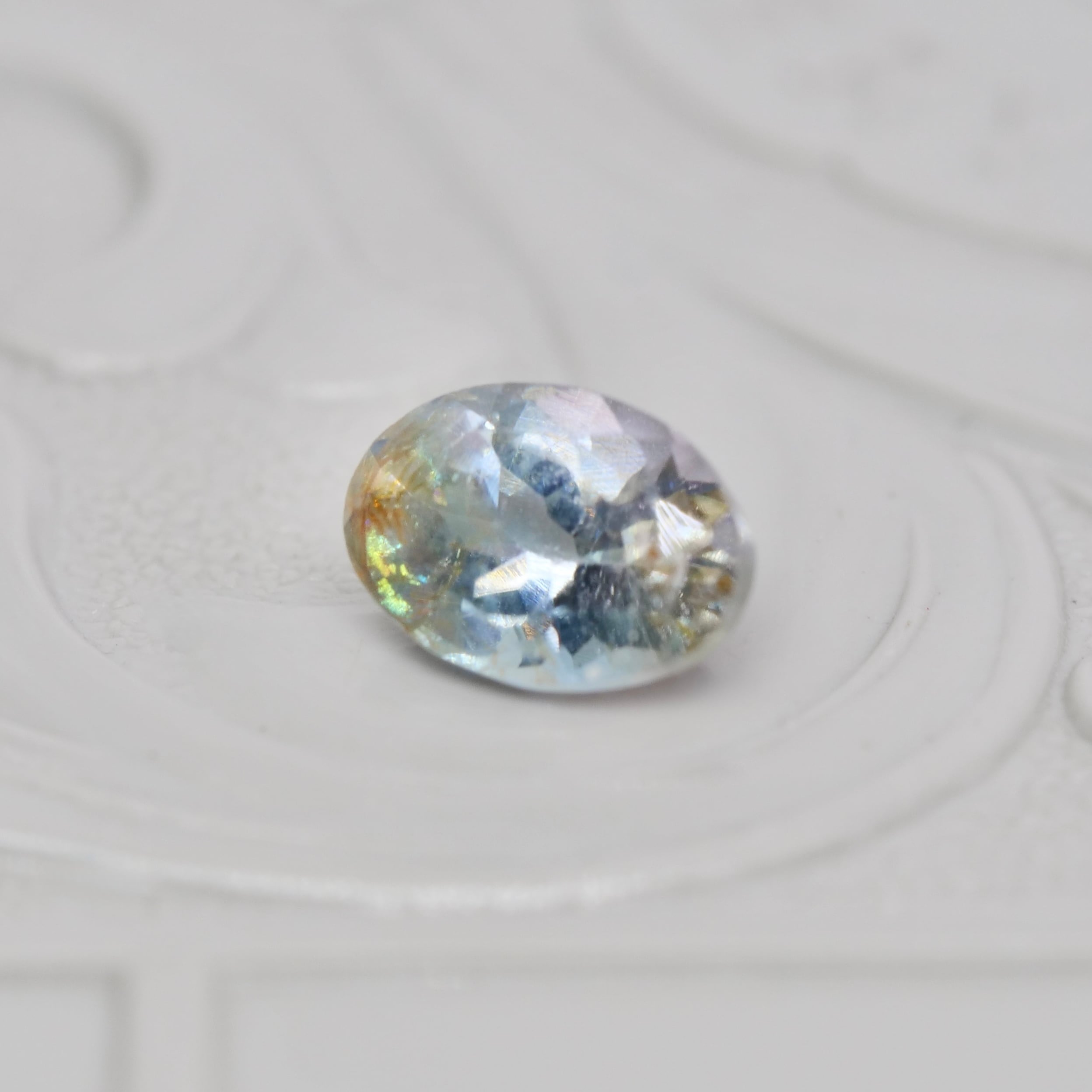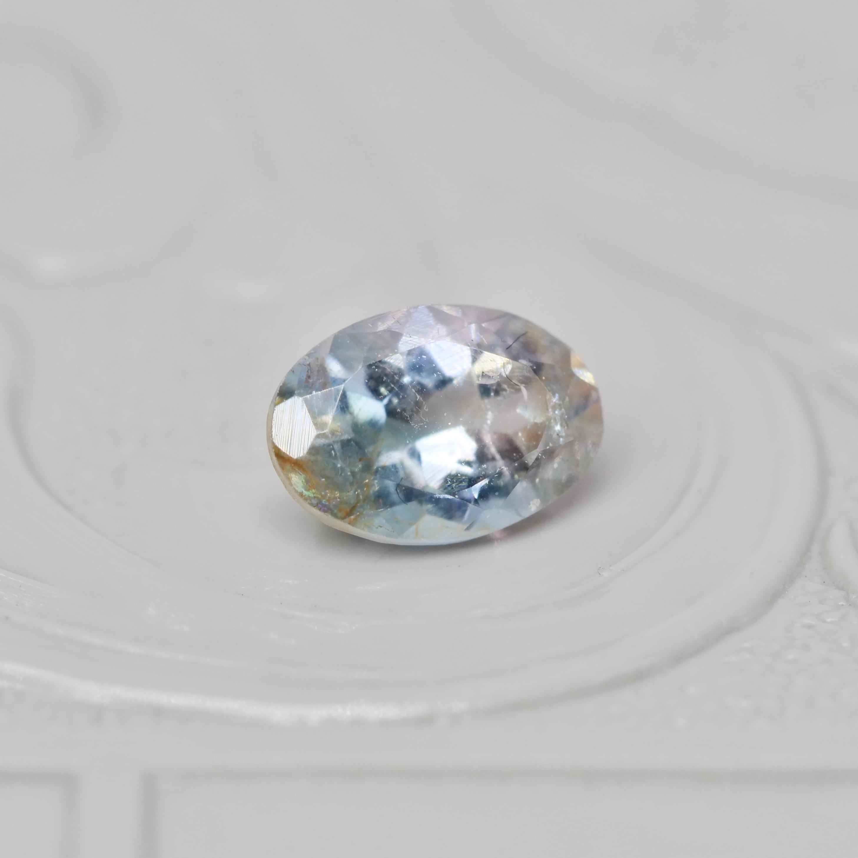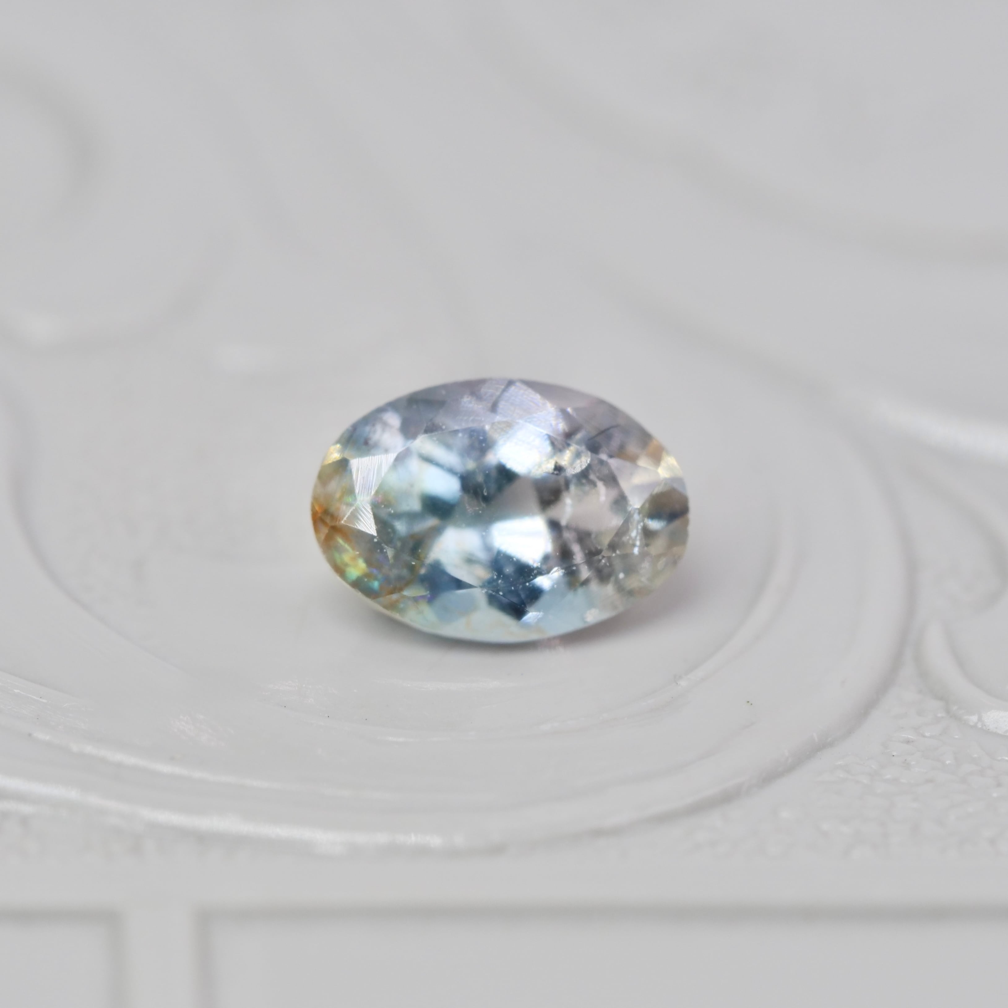 グレイッシュブルーの透明感の片隅に、ライトグリーンの煌めきやブラウンの色彩がアクセントを添えるオーバルカットのバイカラートルマリンです。