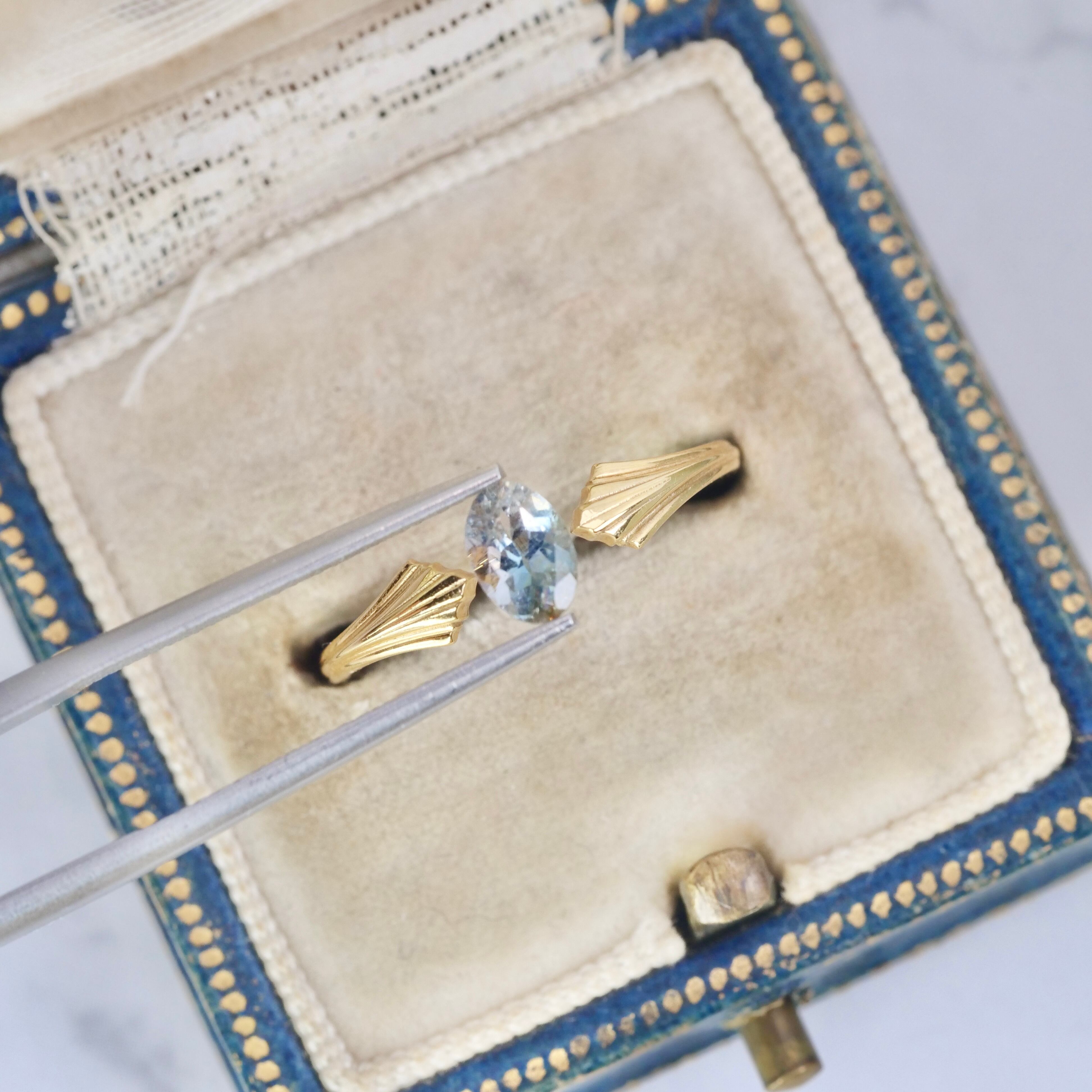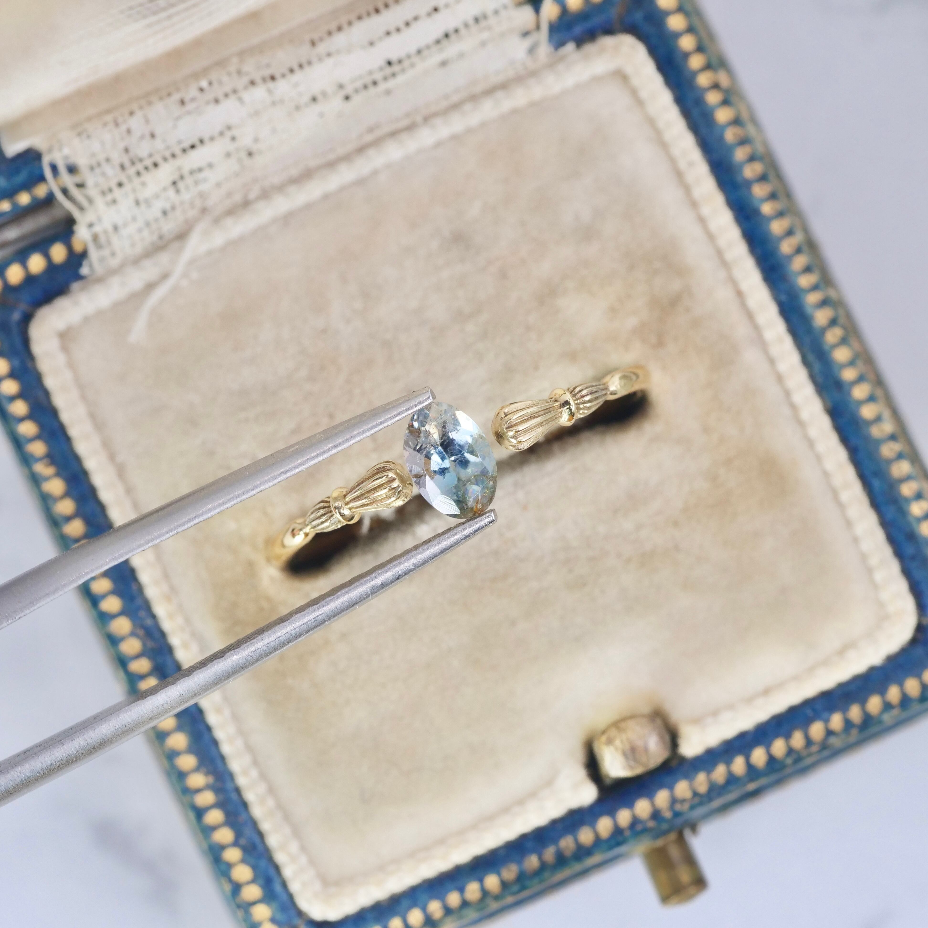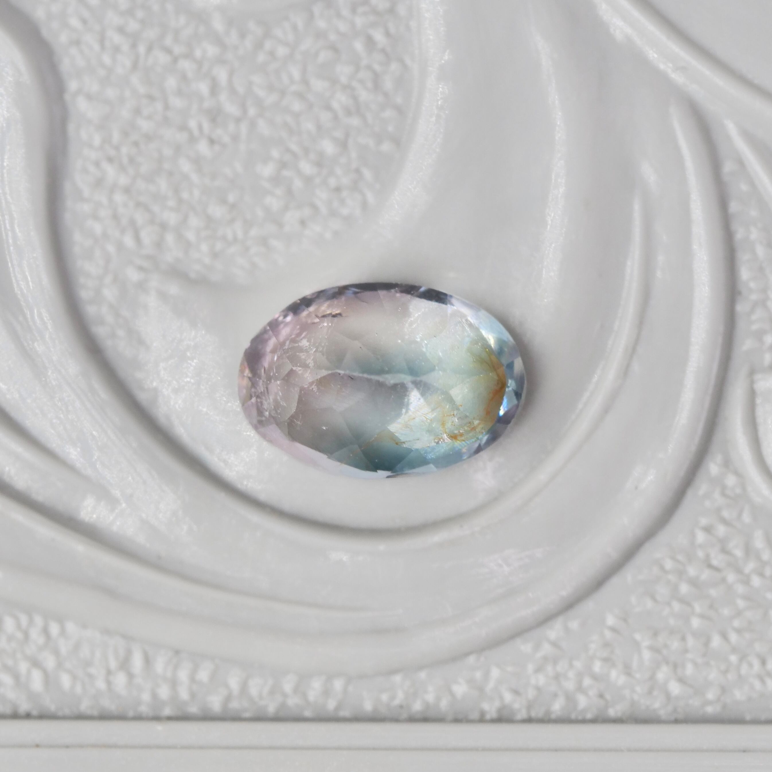 グレイッシュブルーの透明感の片隅に、ライトグリーンの煌めきやブラウンの色彩がアクセントを添えるオーバルカットのバイカラートルマリンです。