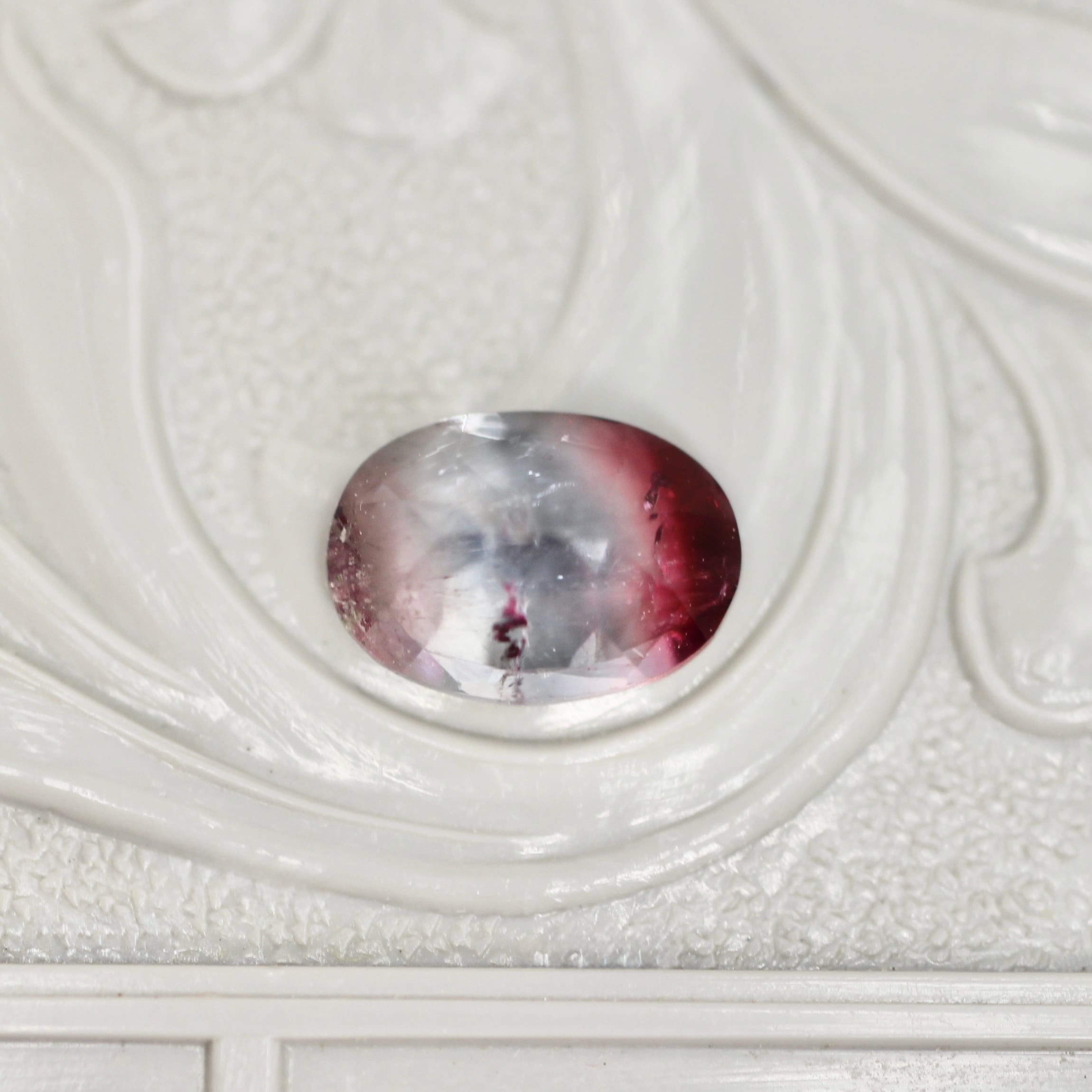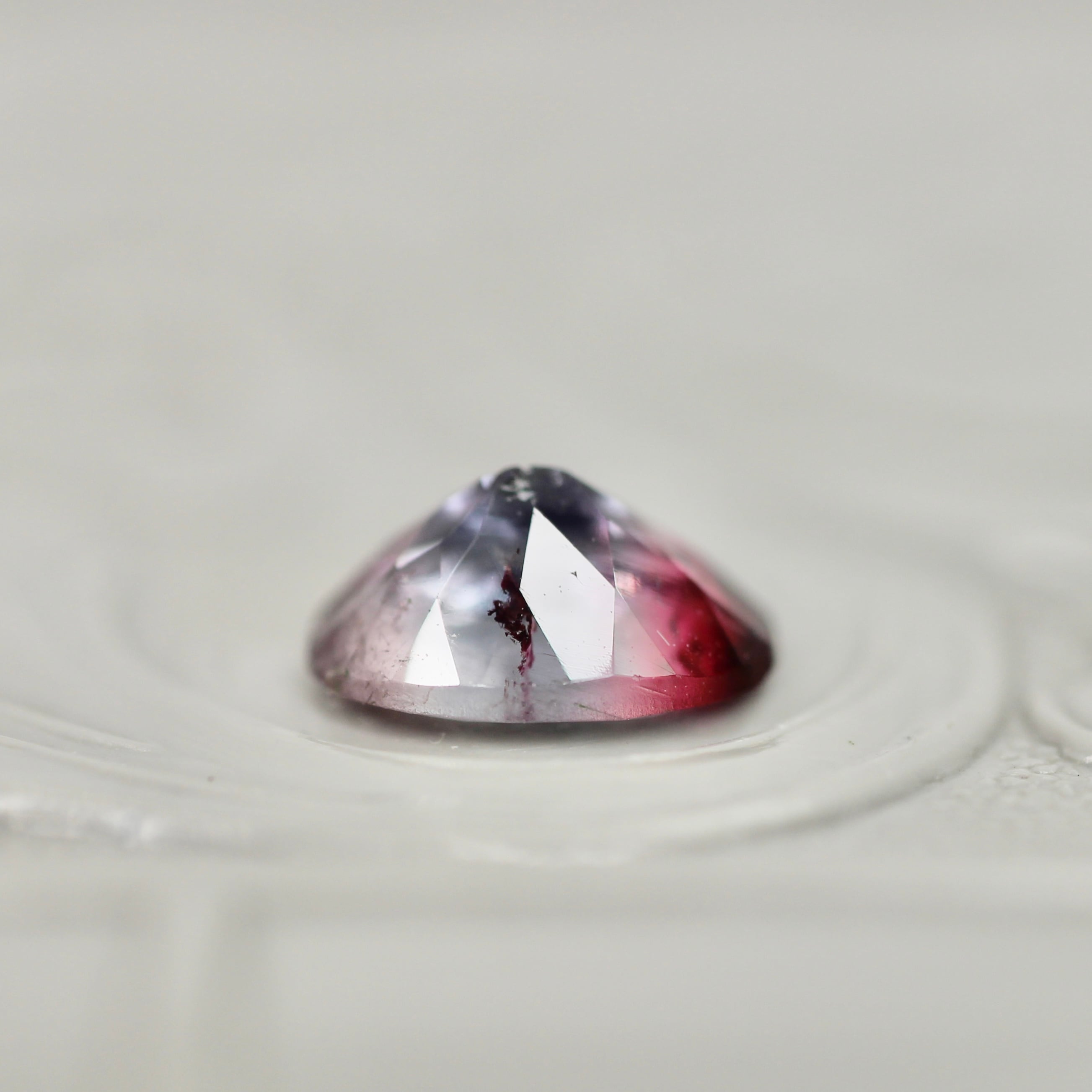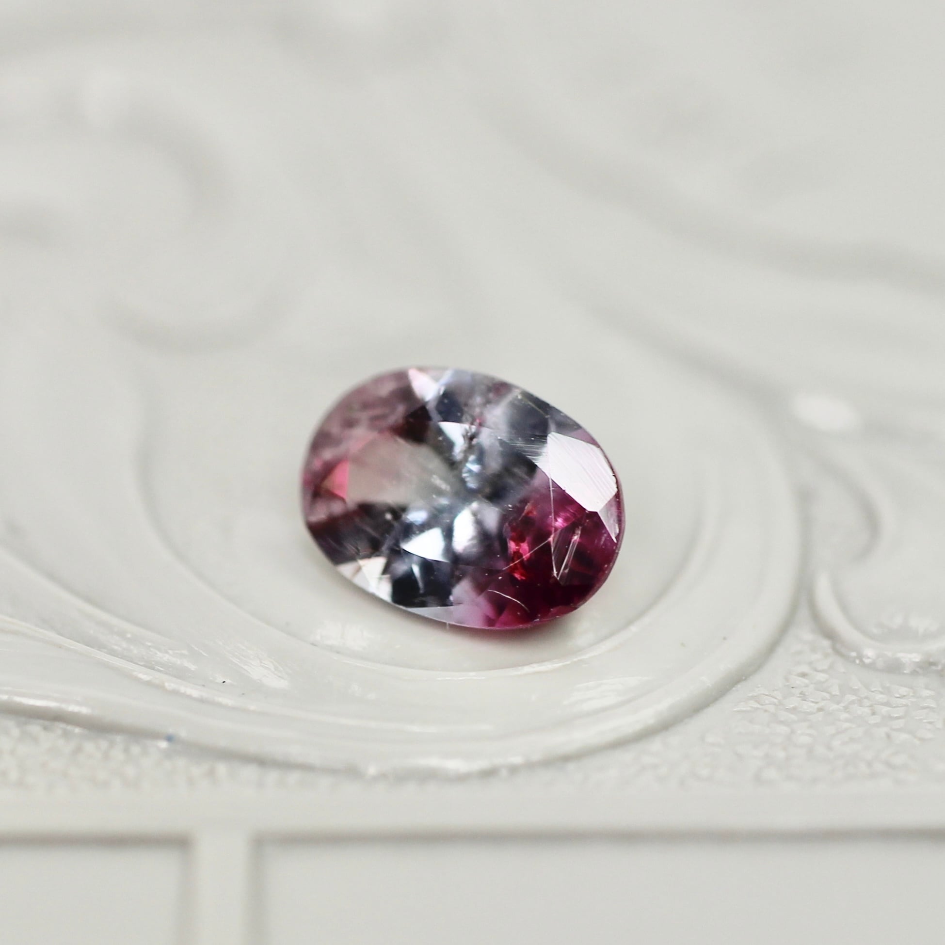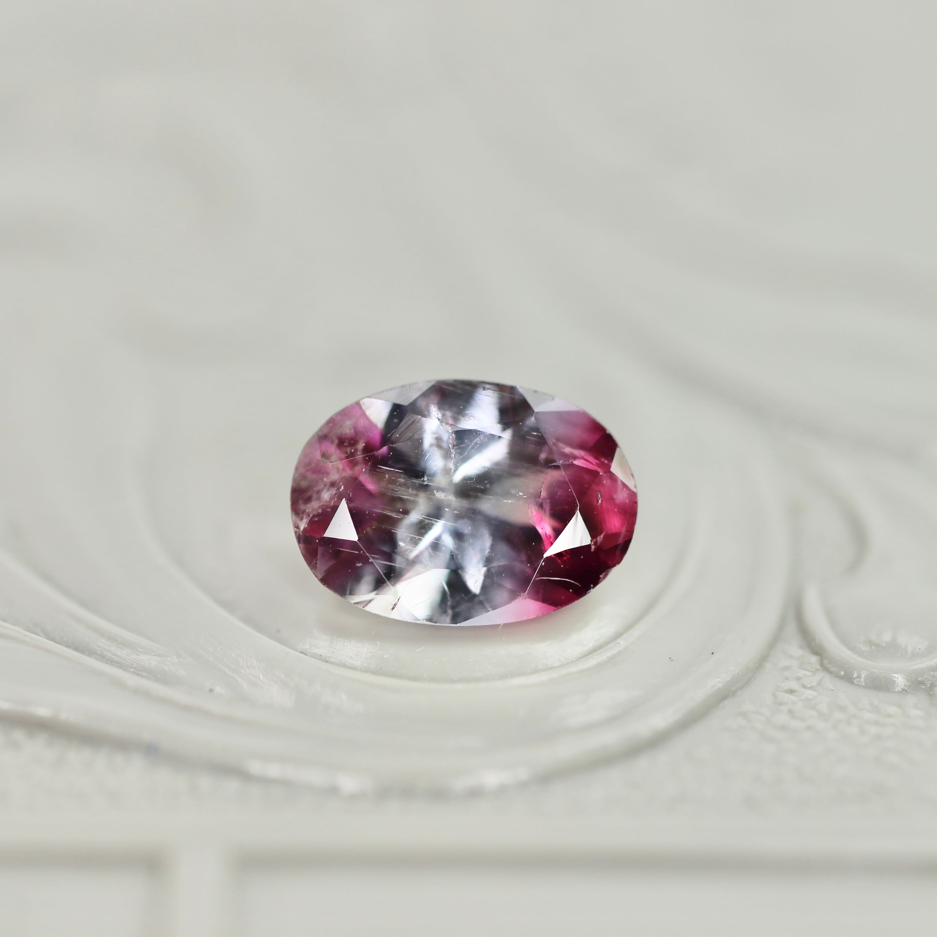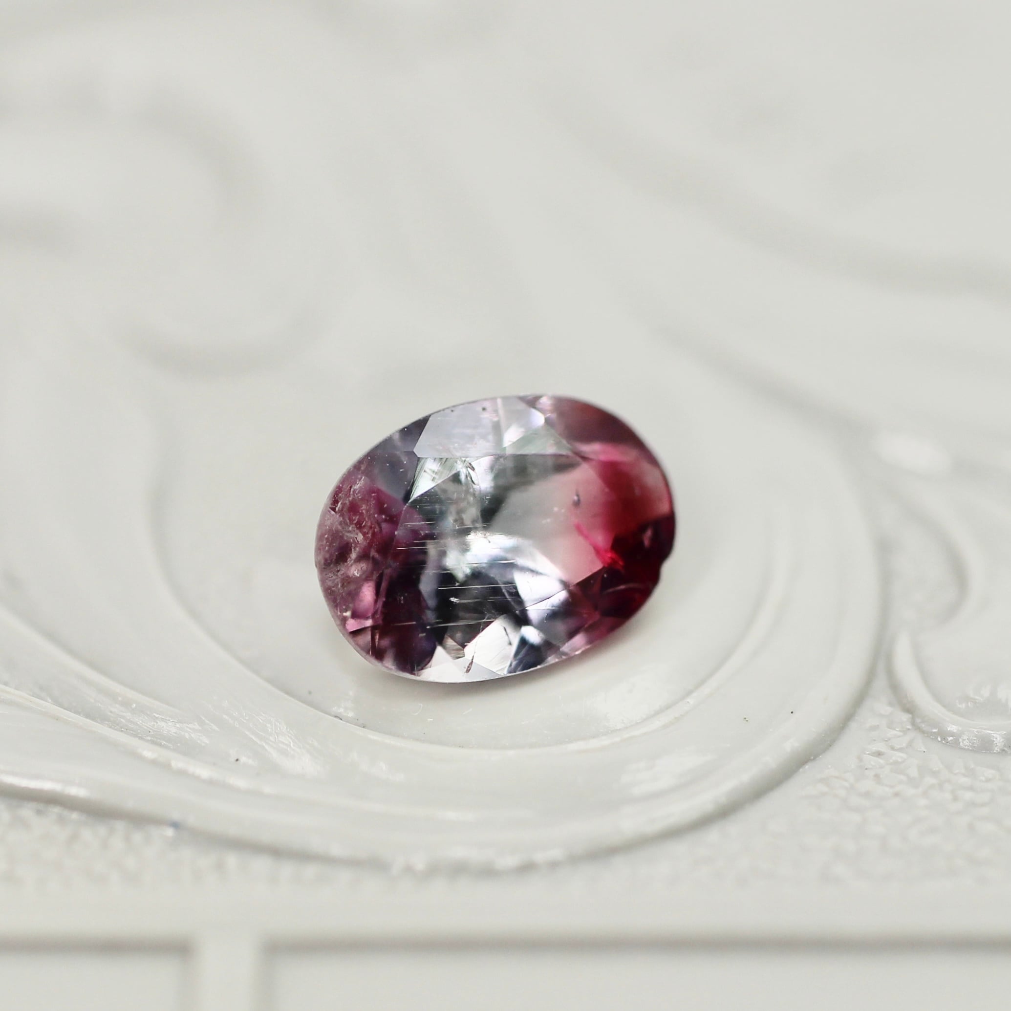 紫を噛んだブルーの透明感に深いローズピンクカラーが滲むように溶け込む、オーバルカットのパーティーカラードトルマリンです。色づいている箇所のバランスや、インクルージョンの繊細な雰囲気により生まれる奥行が美しいピースです。