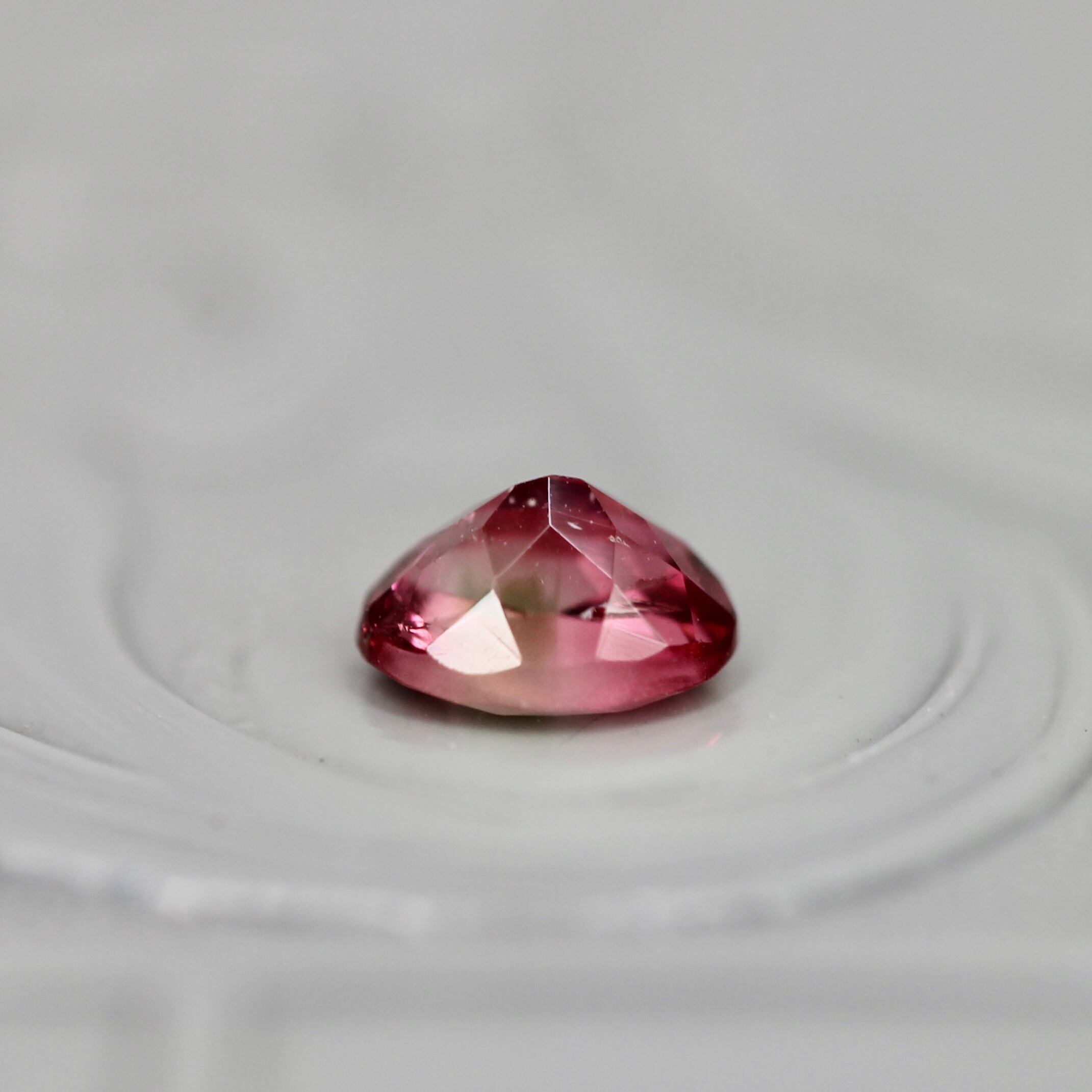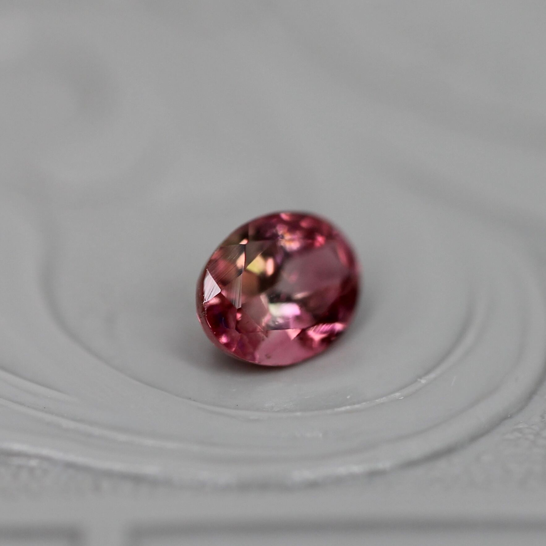 鮮やかなチェリーピンクの中でオレンジ色が小さくふんわりと花開く、オーバルカットのバイカラートルマリンです。透明感と鮮やかさを併せ持った美しい煌めきで、繊細なインクルージョンの煌めきが愛らしさをプラスします。
