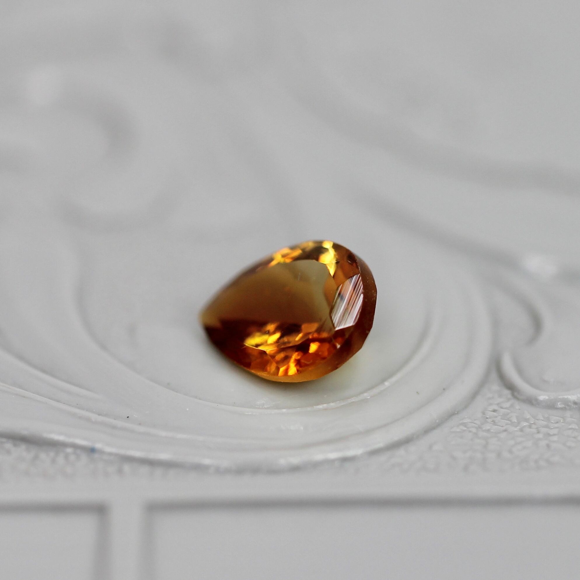 温かみがあり、ふっくらとしたフォルムが優しい印象の、ペアシェイプカットのバイカラートルマリンです。ブラウニッシュカラーのオレンジとイエローが美しくグラデーションします。