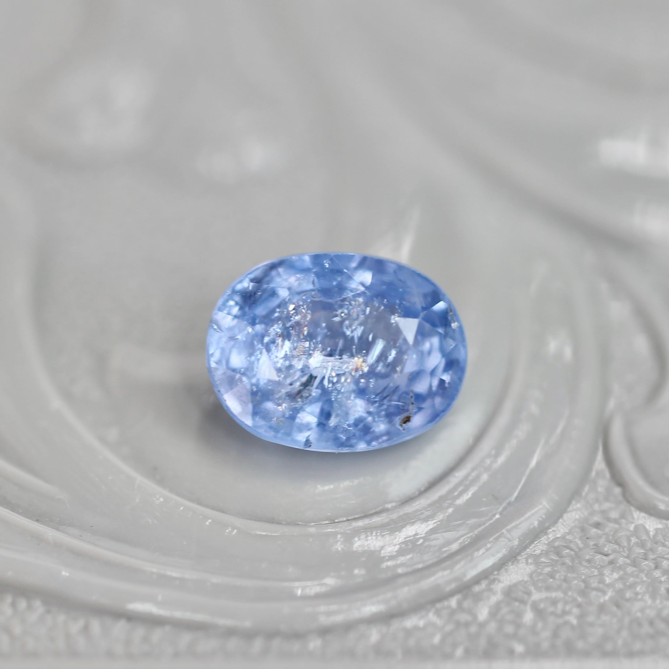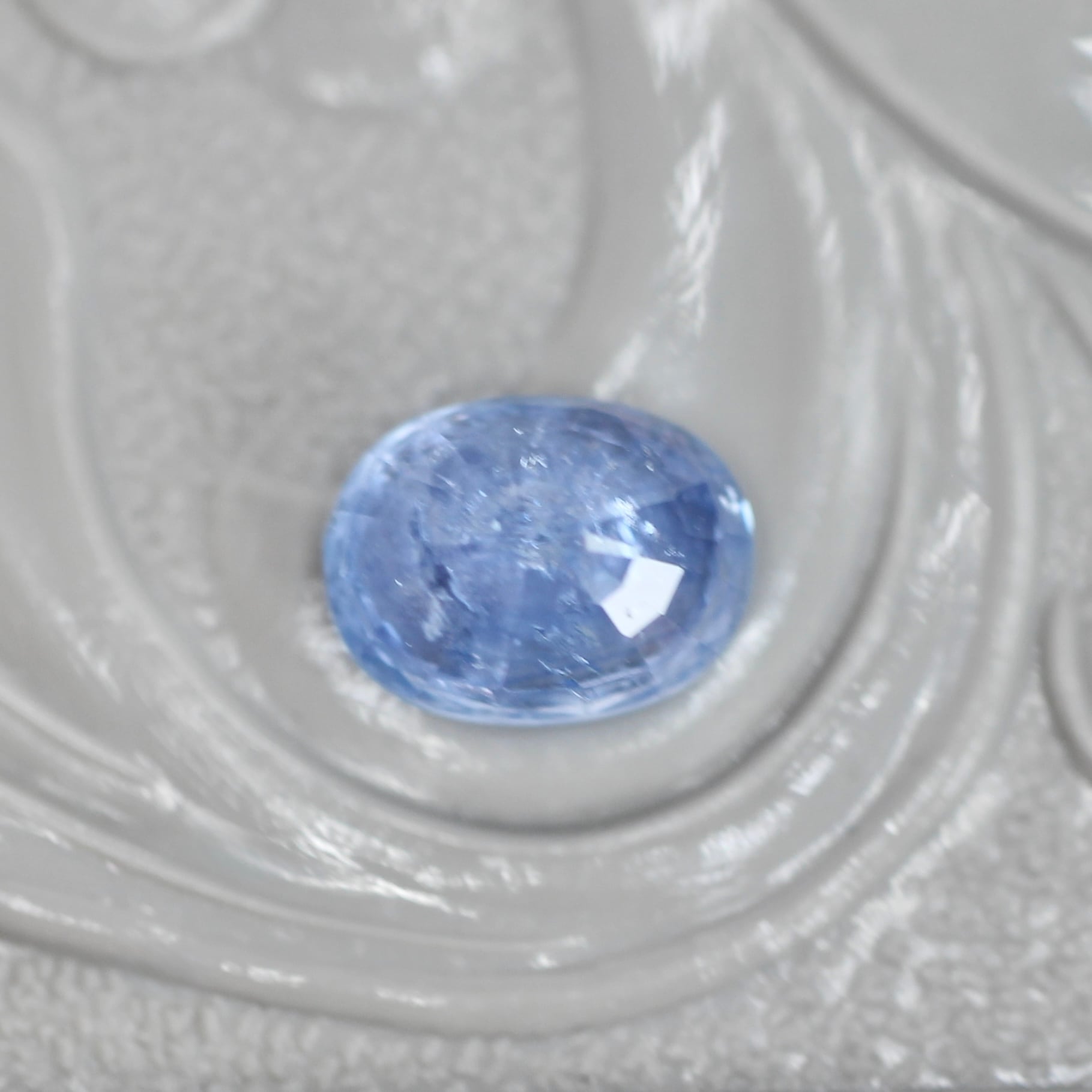 青々とした色彩に浮かび上がる繊細な煌めきから、儚げな雰囲気か漂う、オーバルカットのイリデッセンスサファイアです。光を受けてカットから引き出される煌めきと、イリデッセンスの煌めきが合わさる、神秘的で美しいピースです。