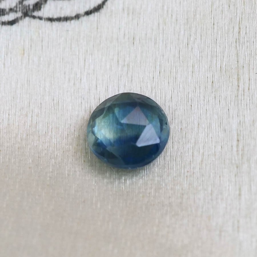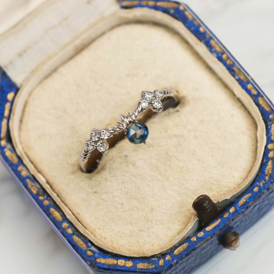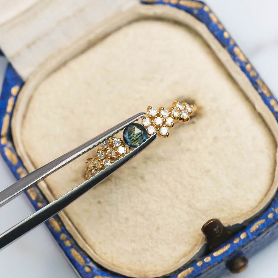 深いブルーの中で仄かにクリアイエローが息づく、ローズカットのバイカラーサファイアです。ローズカット越しに、奥行きを感じる色の濃淡が美しく感じられるピースです。